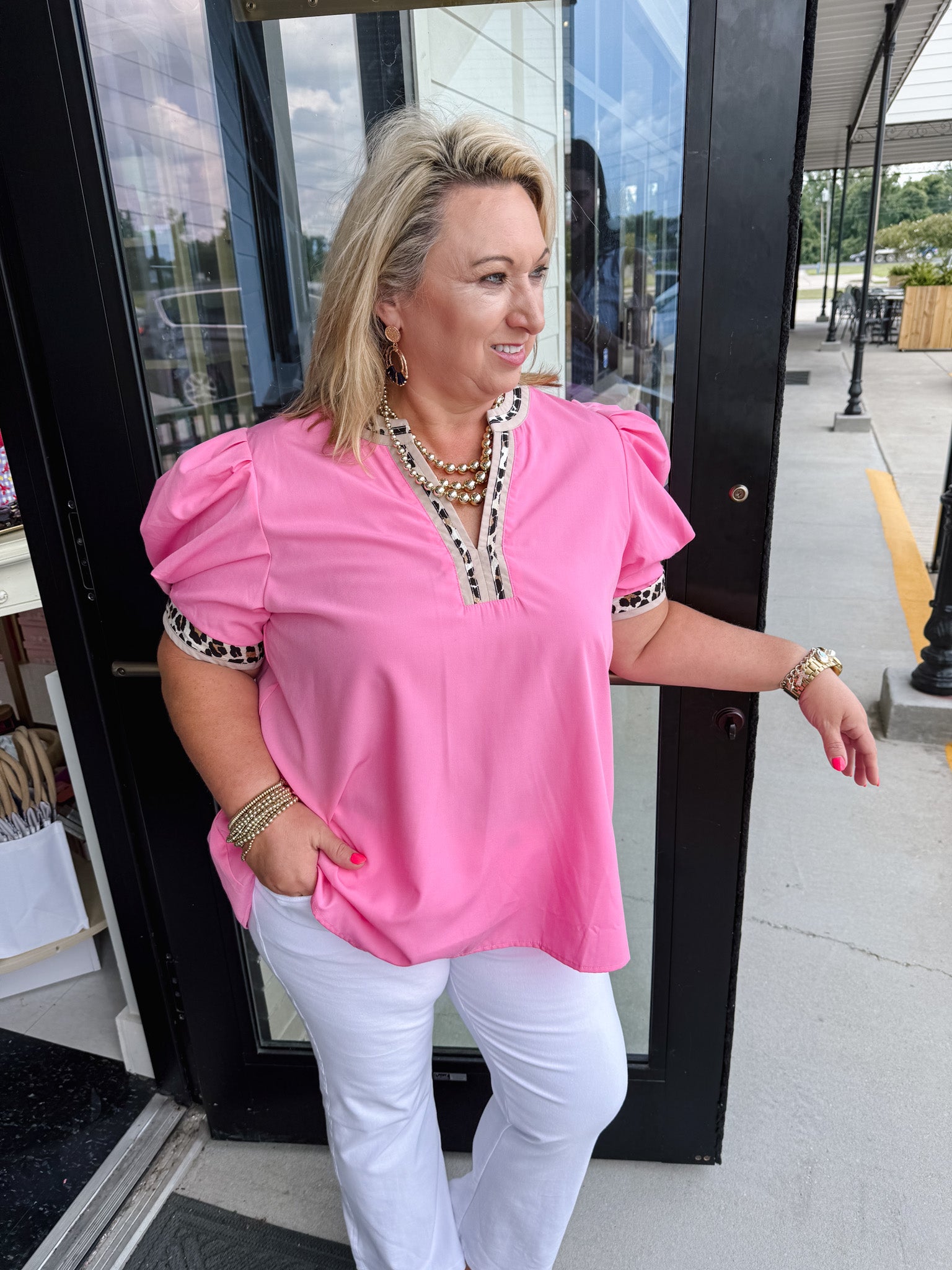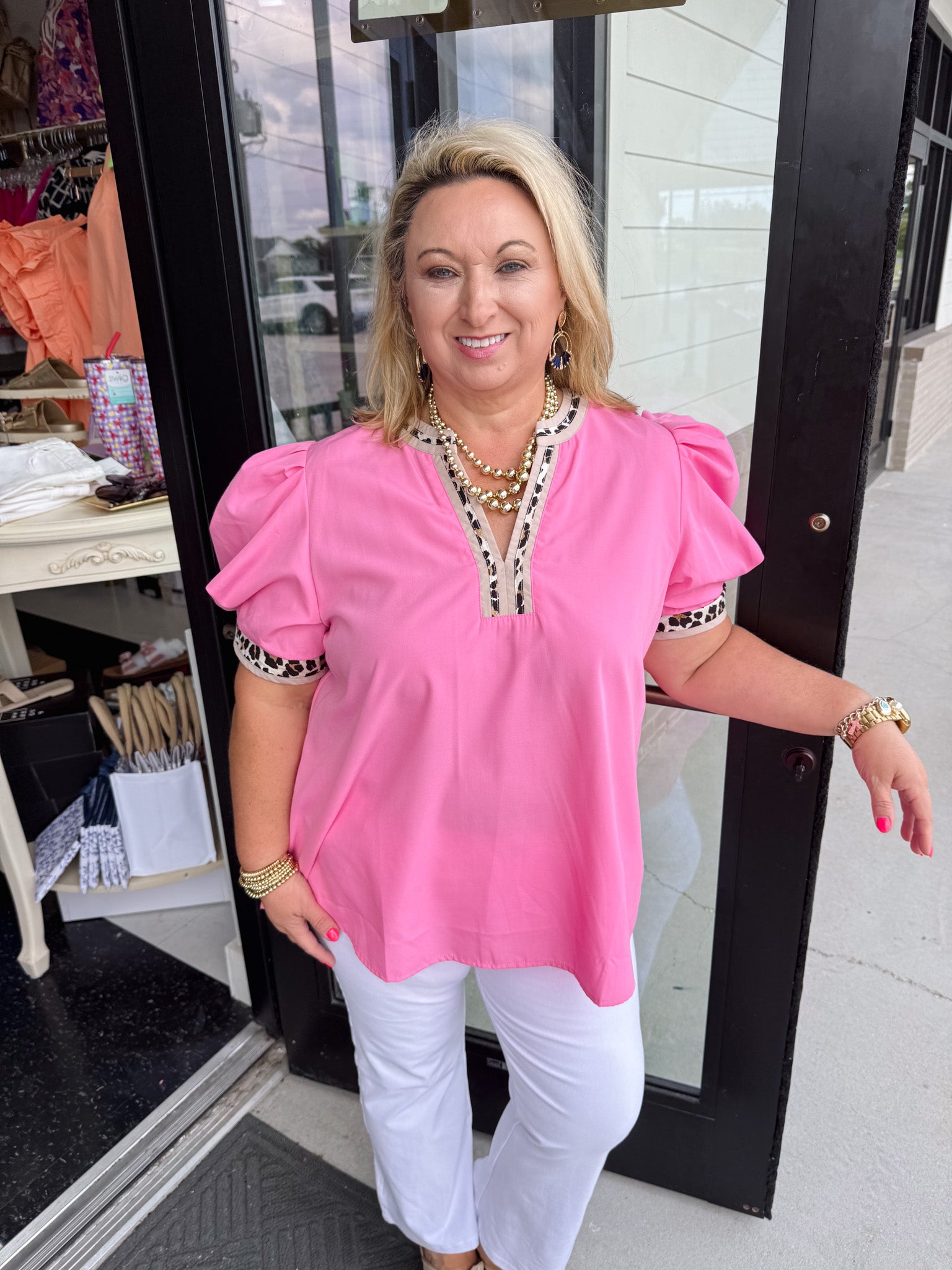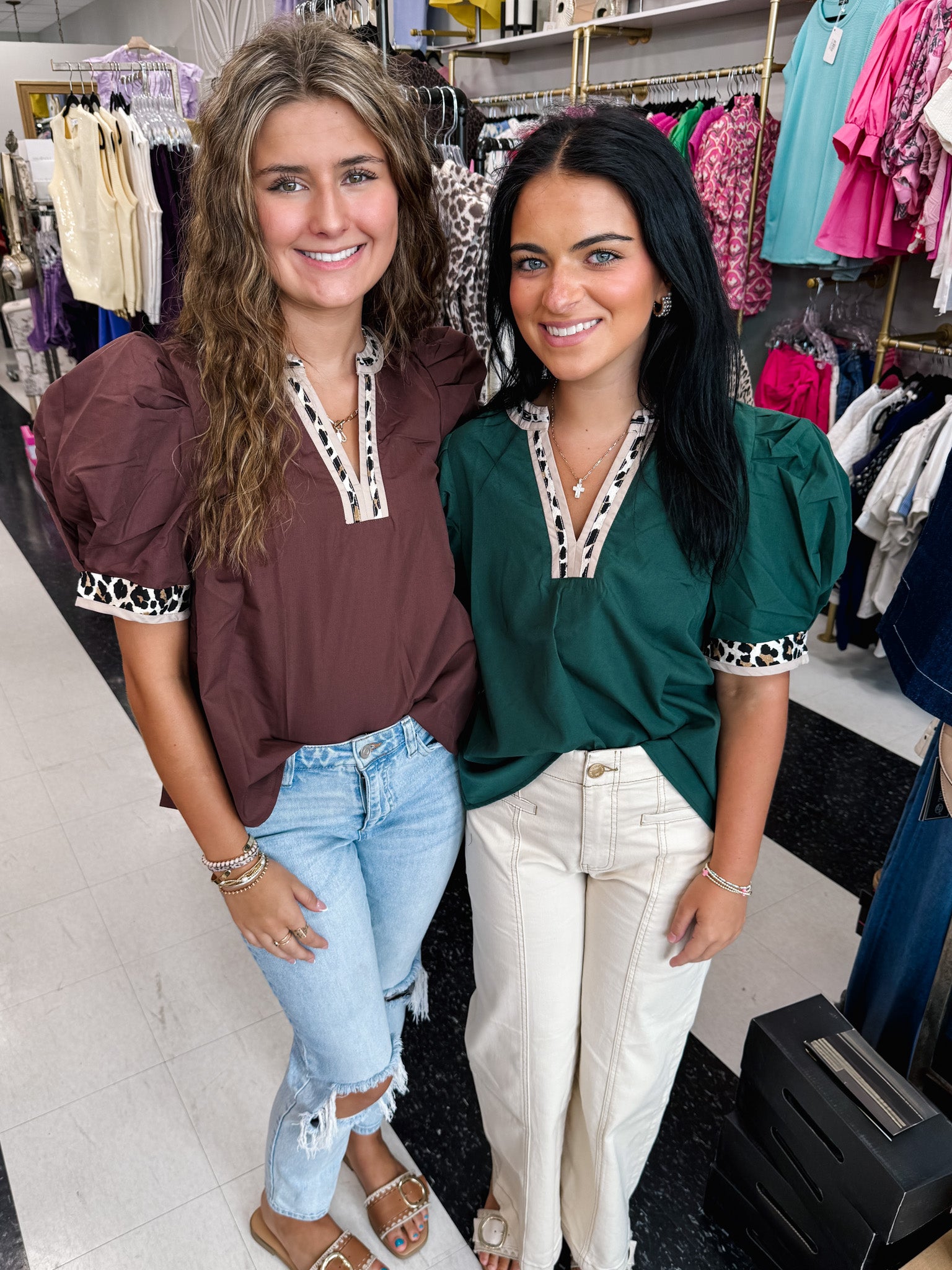 Introducing the Anna top - a solid top with a touch of wild elegance. Adorned with an accented leopard print split V neck and band, this top exudes luxury and sophistication. The puff sleeves add a touch of playfulness to this otherwise refined piece. Elevate your wardrobe with the Anna top.