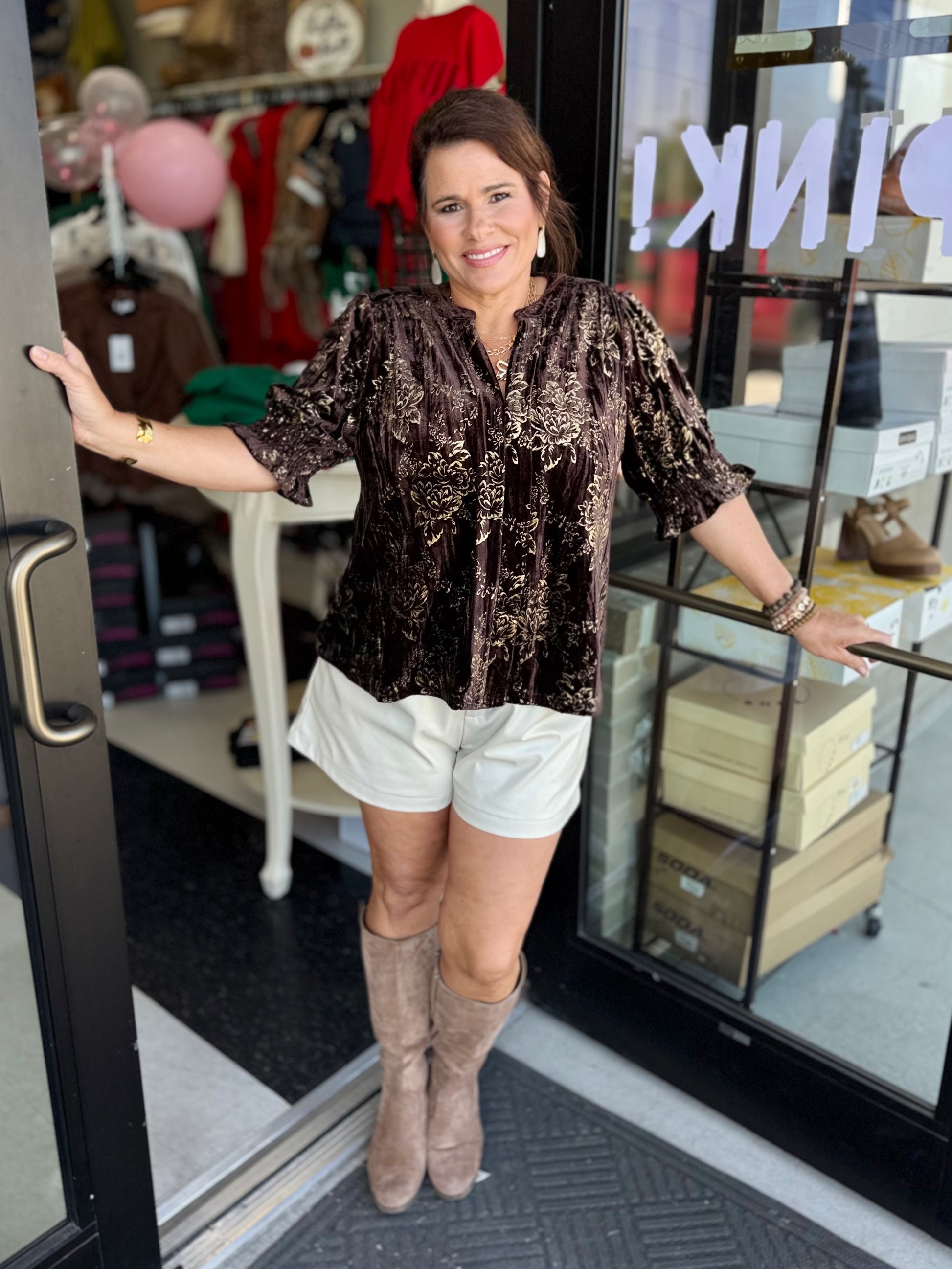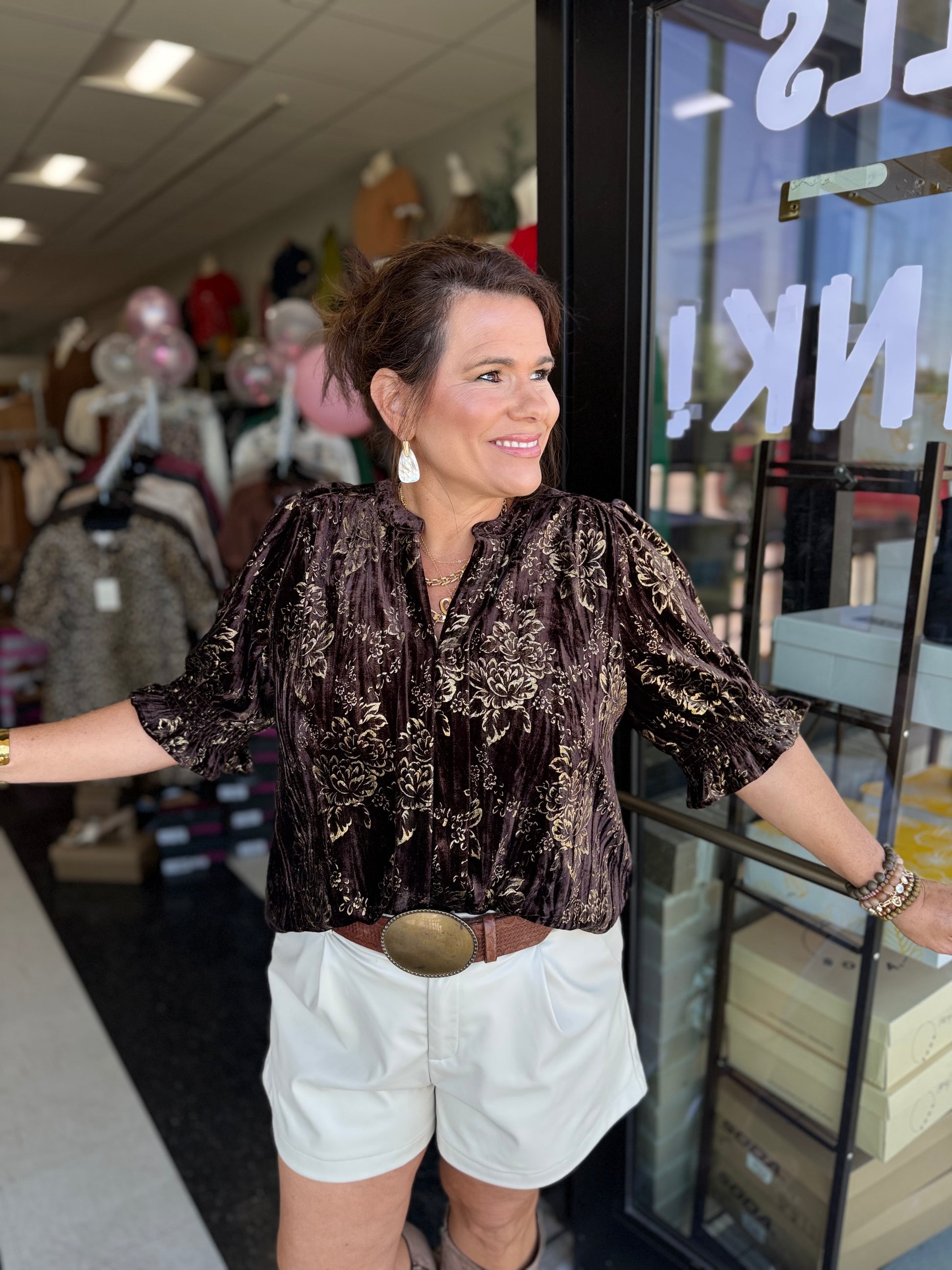Add a touch of luxe to your wardrobe with this brown metallic floral velveteen top. The soft, textured fabric is adorned with subtle metallic floral details, creating a sophisticated shimmer that catches the light. Designed for a flattering fit, it’s perfect for dressing up your favorite trousers or skirts for both day and evening occasions.