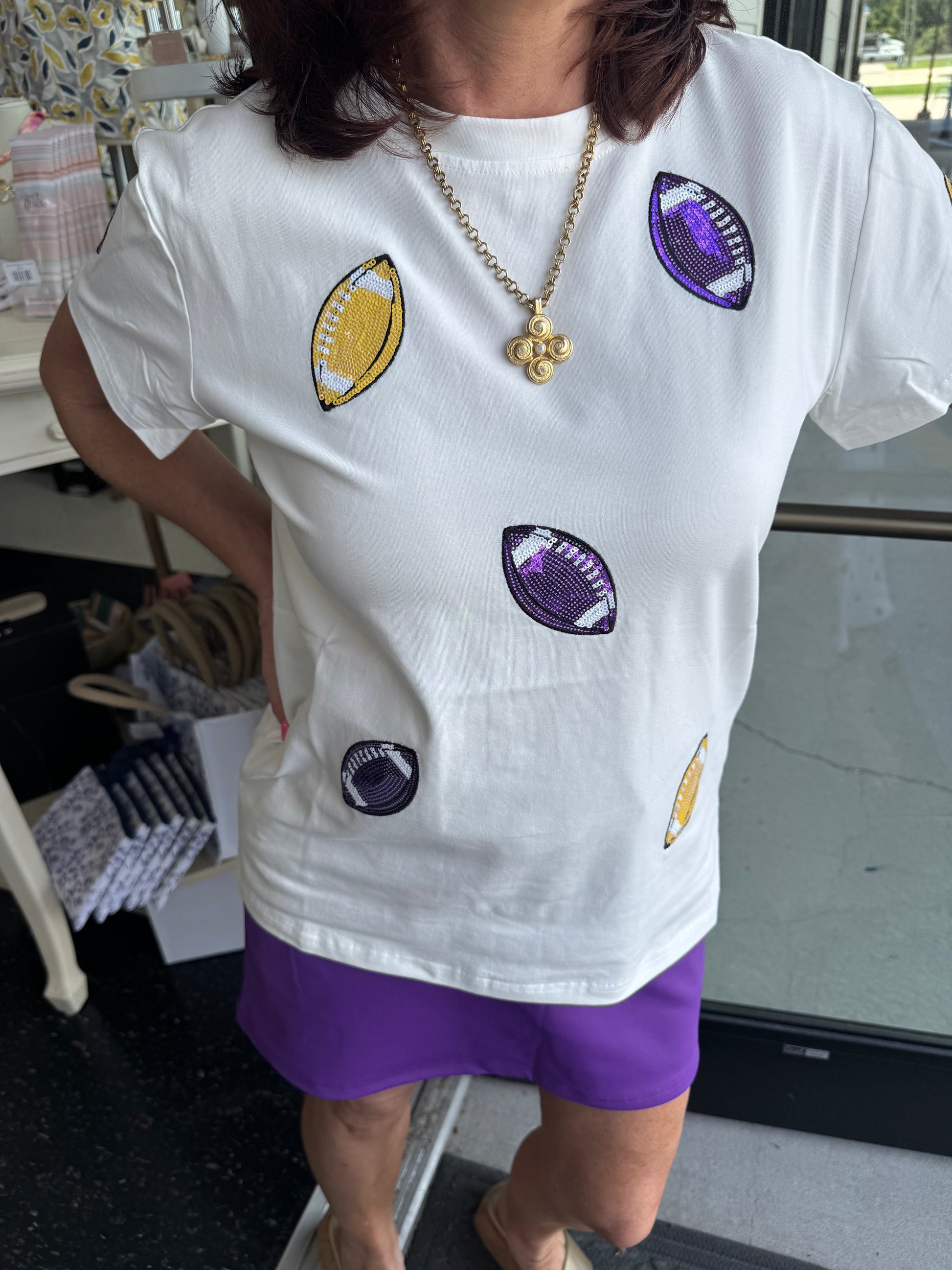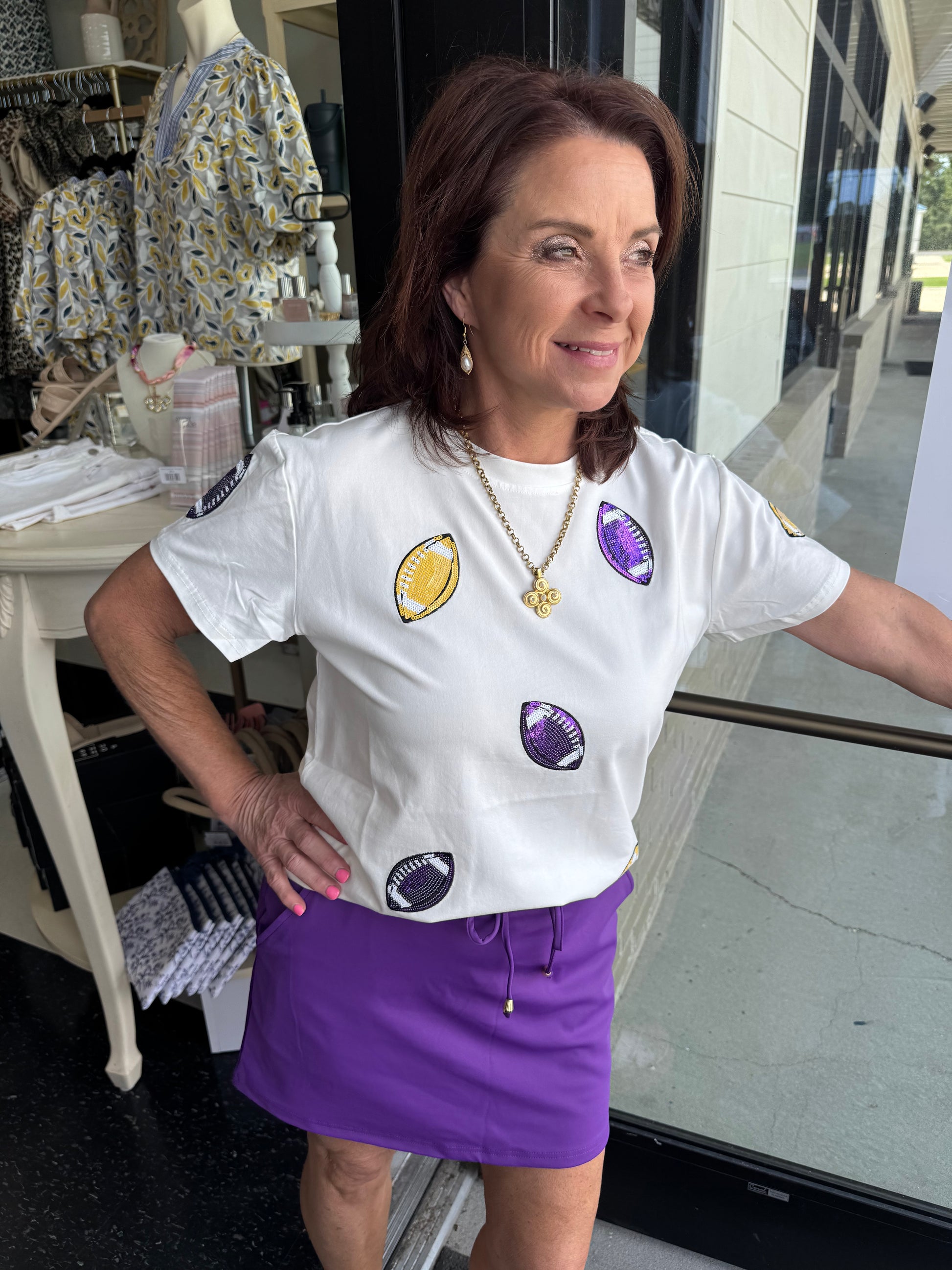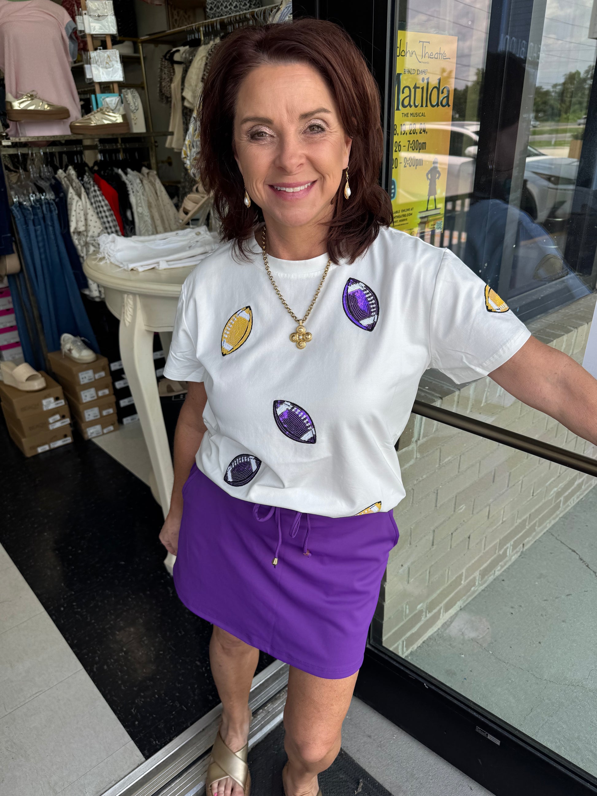 Score a "touchdown" in style and comfort with our BC Touchdown Football Tee! Perfect for gameday, this super cute and stretchy tee features a fun football sequin design. Get ready to cheer on your team in the most fashionable way possible!