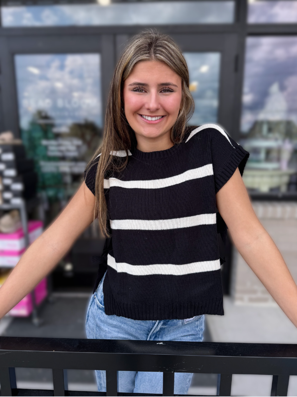 The BP Cozy Up Sweater Top features a refined round neckline and short sleeves, complemented by a relaxed fit and drop shoulder design for effortless elegance. Its subtle stripe pattern and side tie strap detail add a touch of sophistication, making this knit pullover a versatile choice for both casual and polished looks.