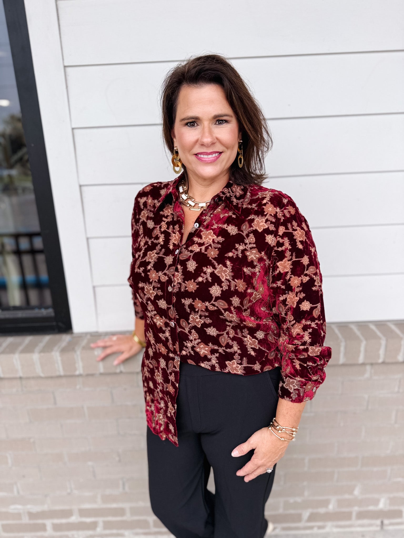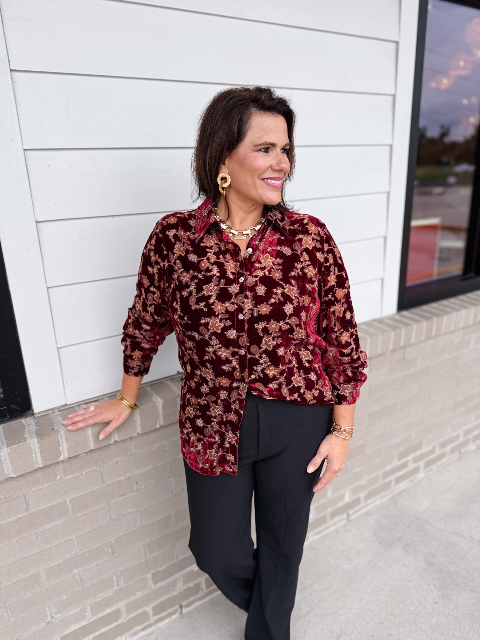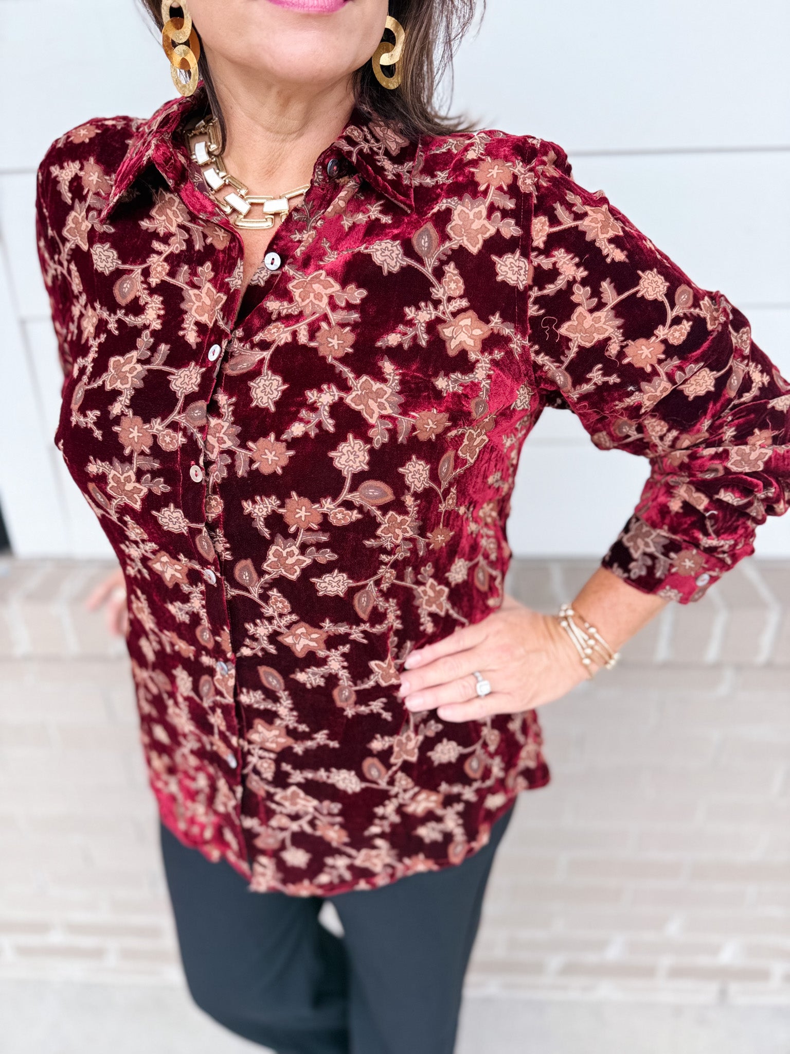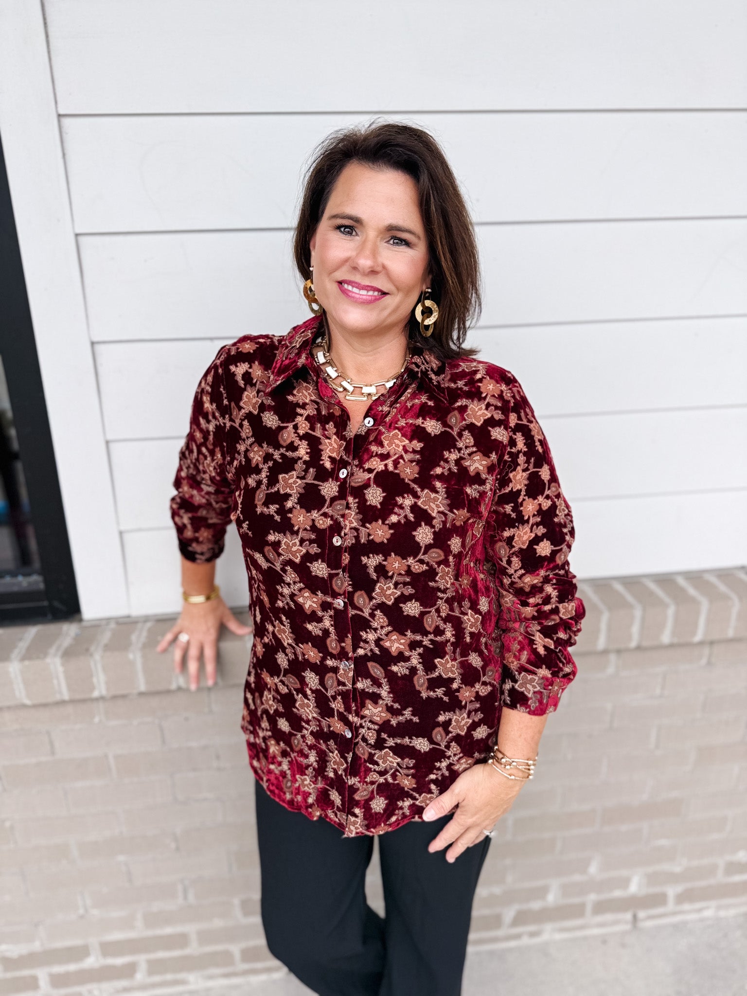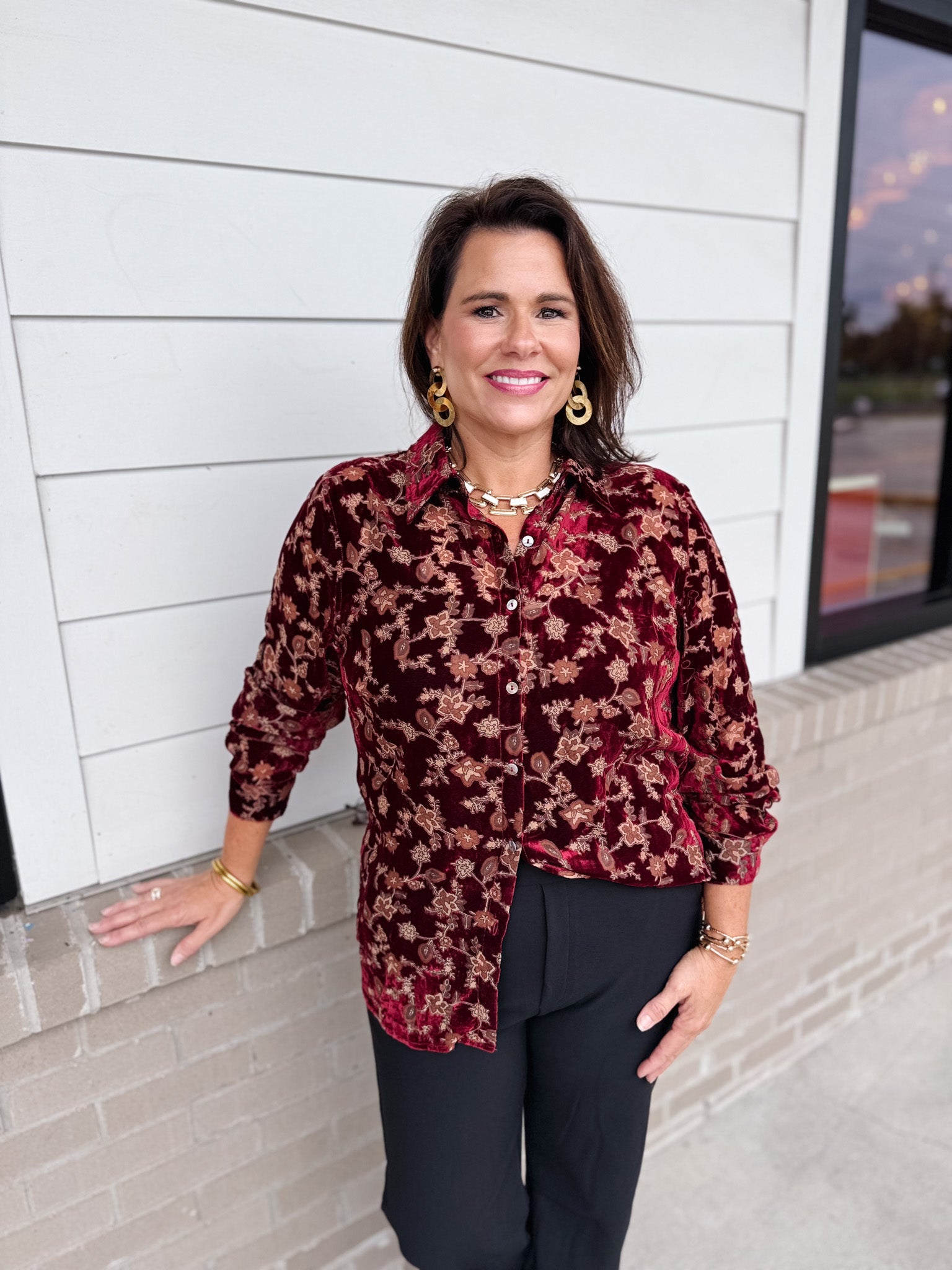 This women's shirt blends modern western style with elegance through its floral burnout velvet design. The long sleeves and classic collar create a refined silhouette, perfect for elevating everyday ensembles with understated sophistication.