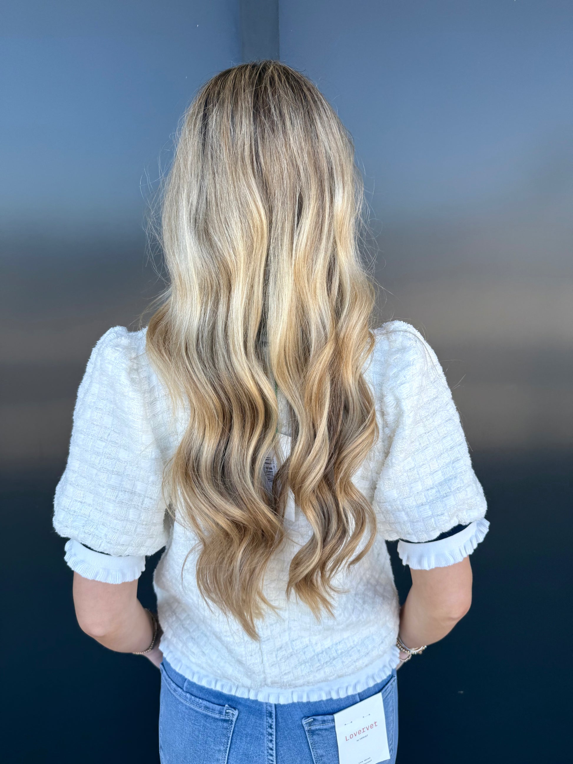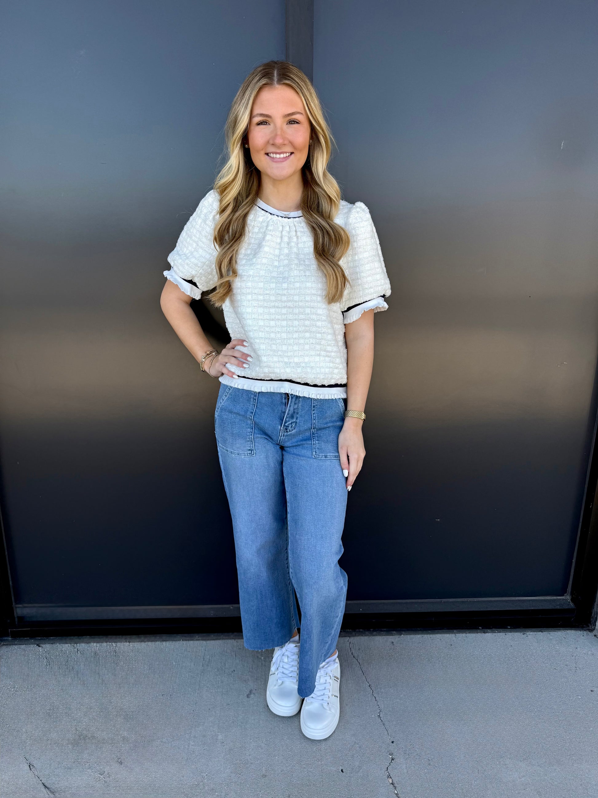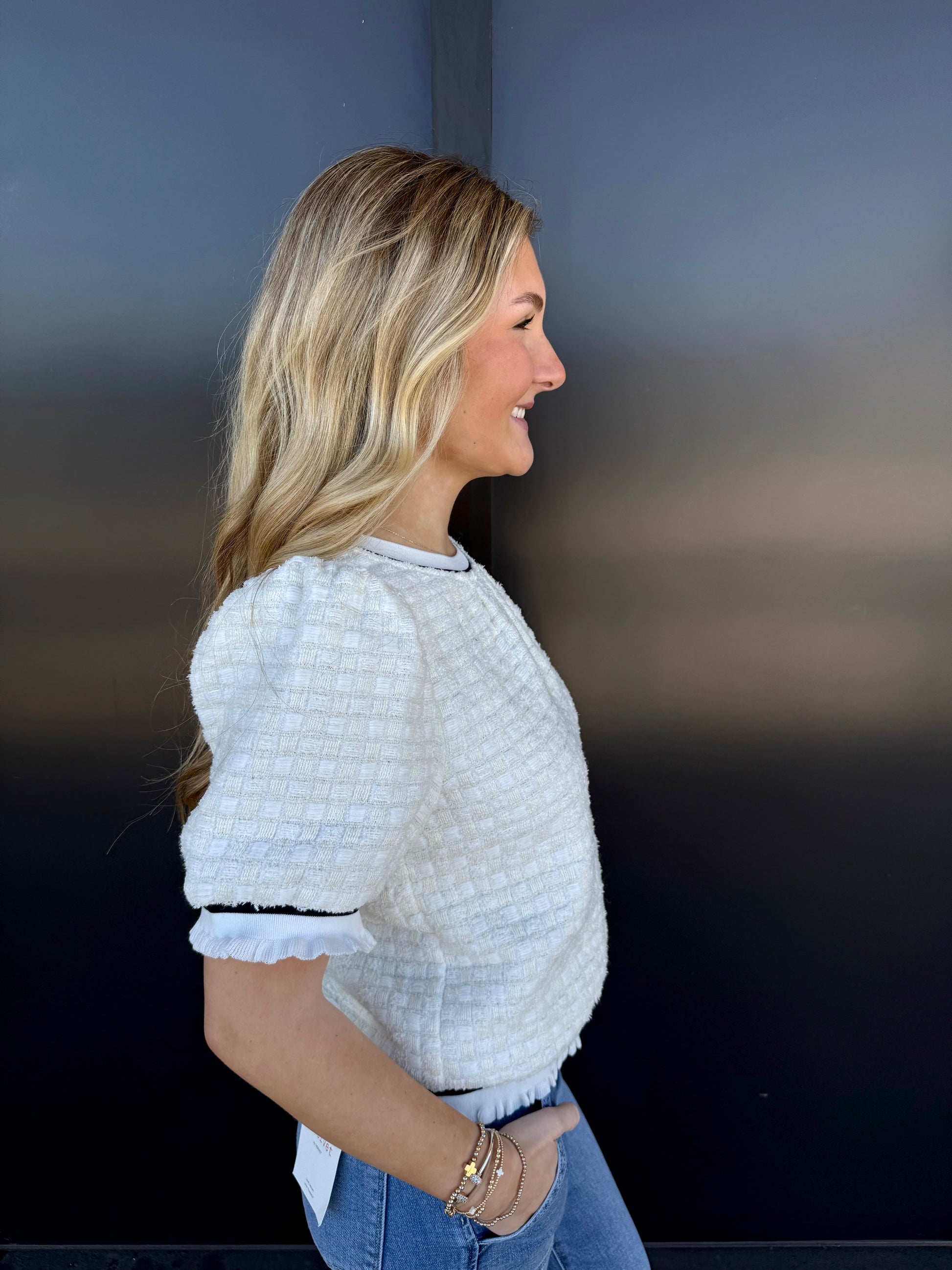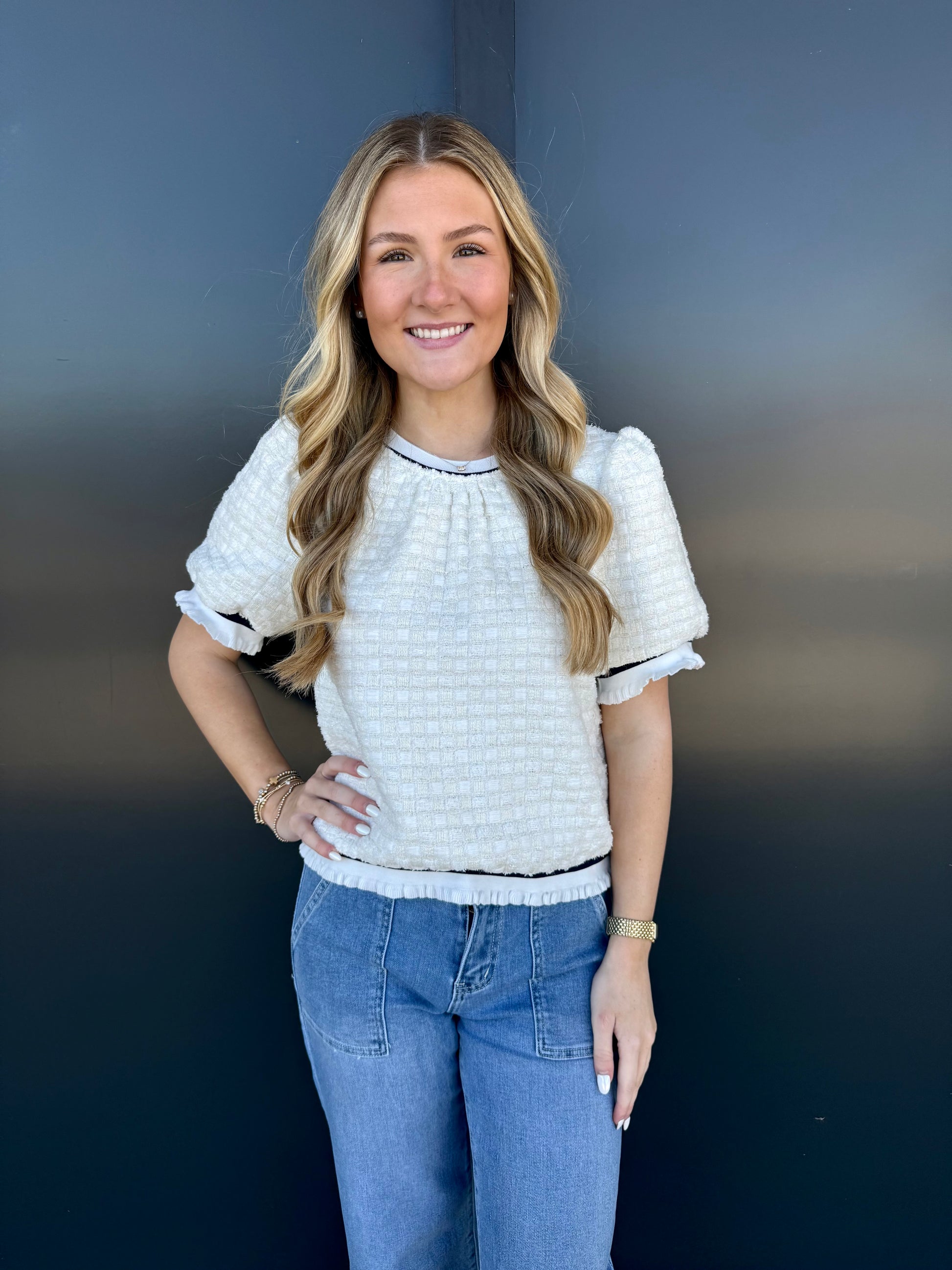 Indulge in luxury with our Cindy top. Crafted from a stunning checked tweed fabric with a hint of gold shimmer, this piece exudes elegance. Short sleeves and a contrasting neckline, sleeve, and hem add a touch of sophistication to your outfit. Elevate your wardrobe with this exclusive top.