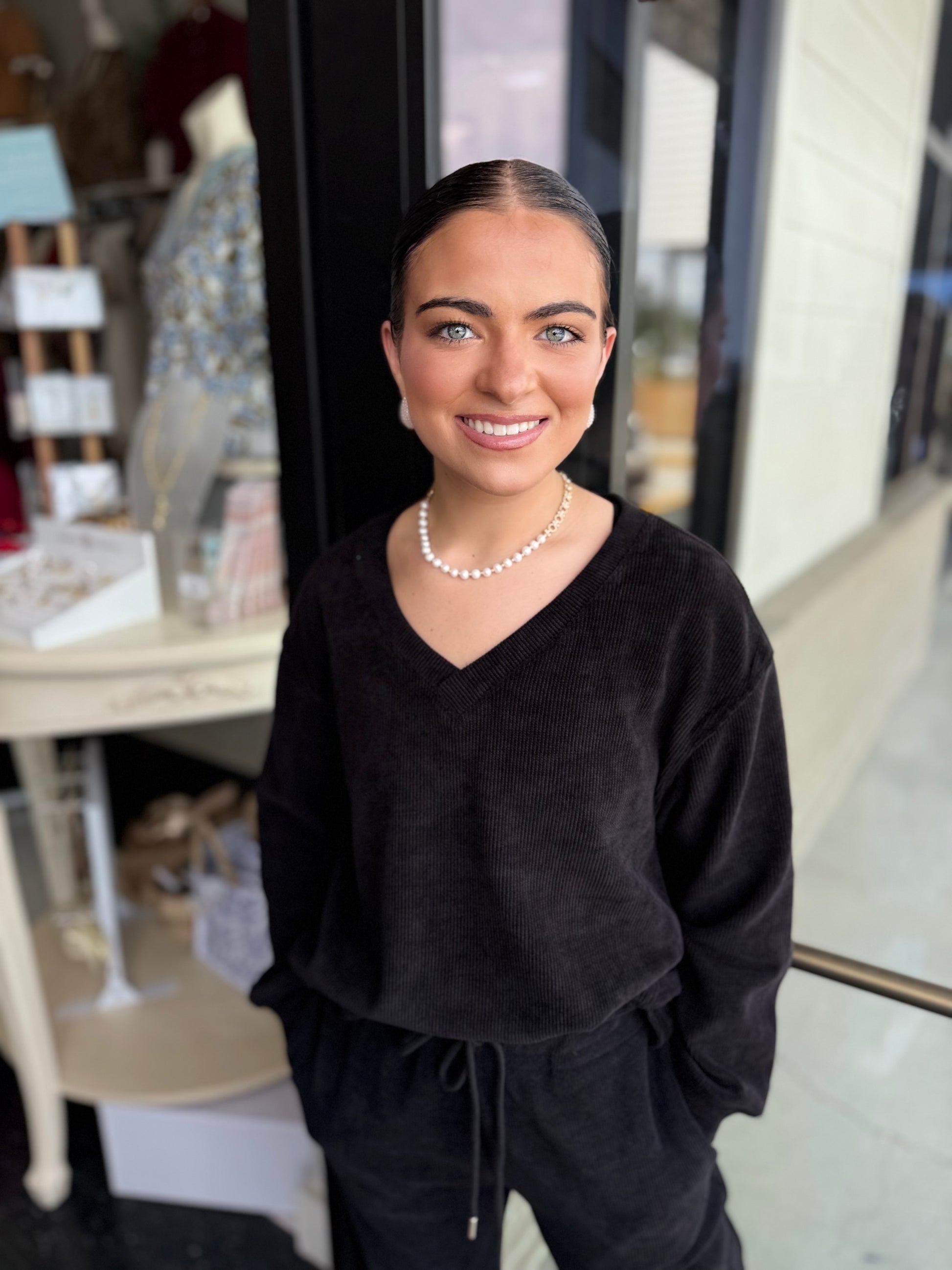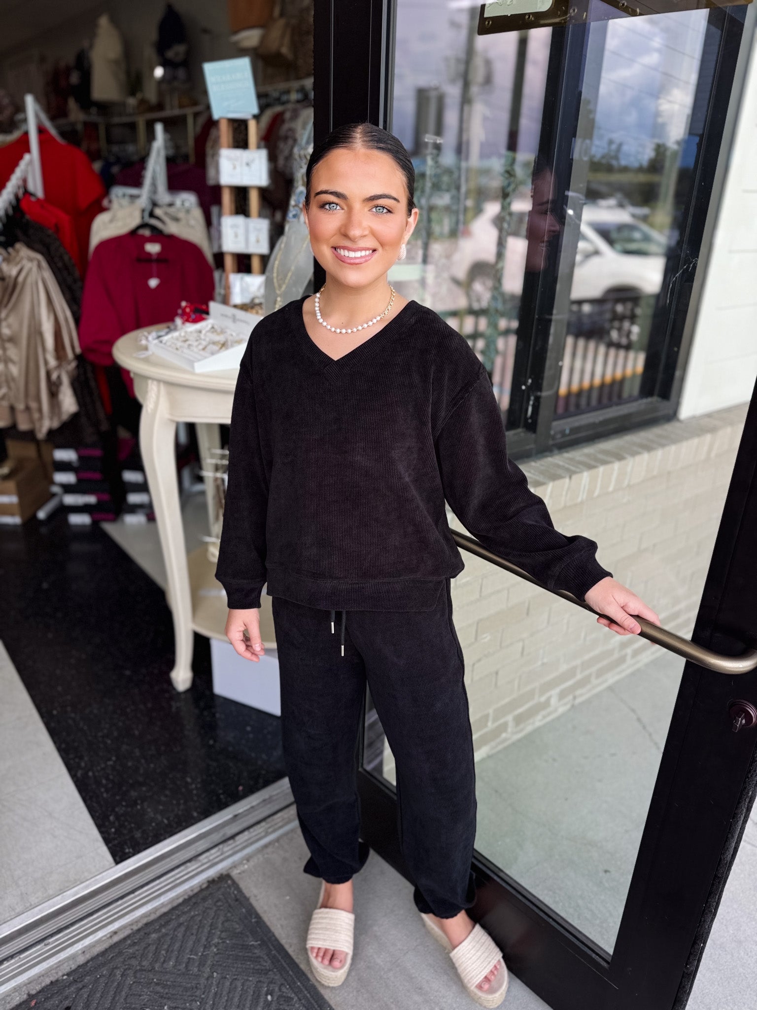 Elevate your casual wardrobe with the Courtney Cord set, featuring a refined corduroy V-neck top paired with matching jogger pants. Crafted for comfort and style, this coordinated set offers a smooth silhouette and a textured finish, perfect for sophisticated yet relaxed occasions.
