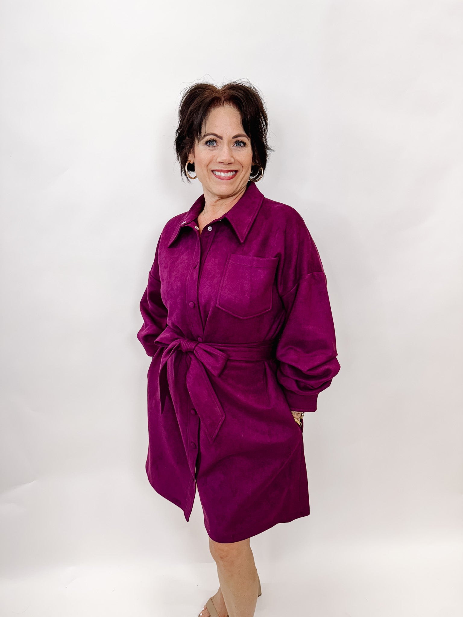 Indulge in the rich color and luxurious texture of our DC Maya Dress. This merlot-hued dress features long sleeves and a button-down design for a sophisticated touch. The soft suede material adds a touch of elegance, while the pocket detail adds both style and convenience. Elevate your wardrobe with this exclusive piece.
