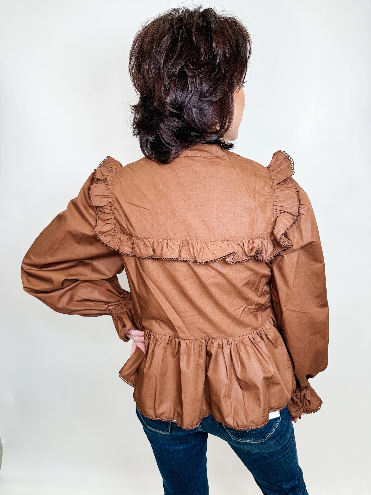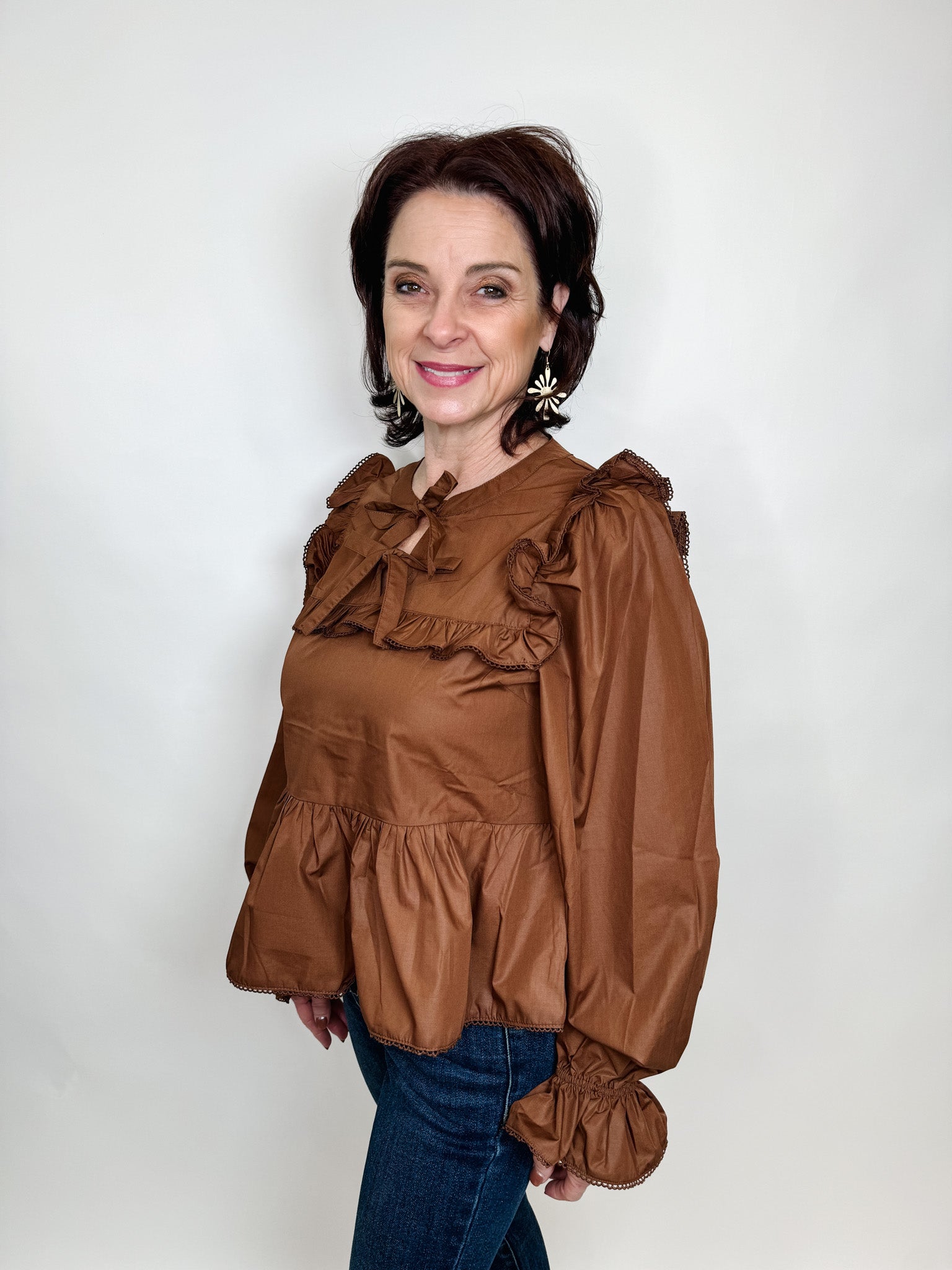 Indulge in luxury with our solid round neck long sleeve peplum top. A delicate bow adorns the neckline, while ruffle details add a touch of femininity. Crafted from a lightweight and non-sheer knit, this top is perfect for any occasion. Elevate your wardrobe with this exclusive piece