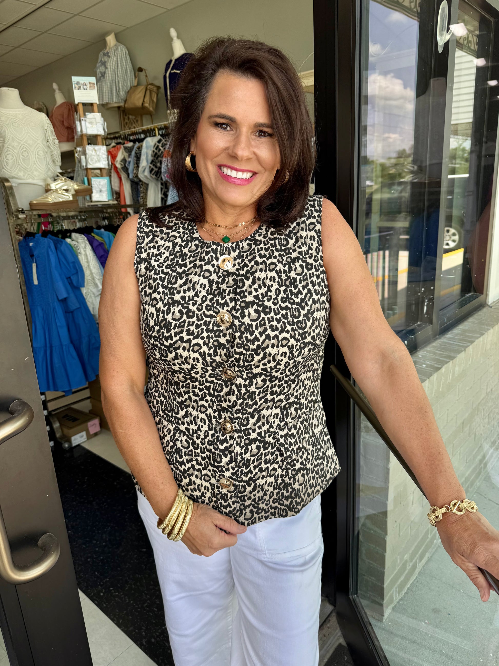 Unleash your wild side with the Entro Amelia Top. This luxurious leopard print vest top is adorned with gold accented buttons for a touch of glamour. Its faux pockets and lightweight, non-sheer material make it both stylish and practical. Add a touch of sophistication to any outfit with this woven and lined top.