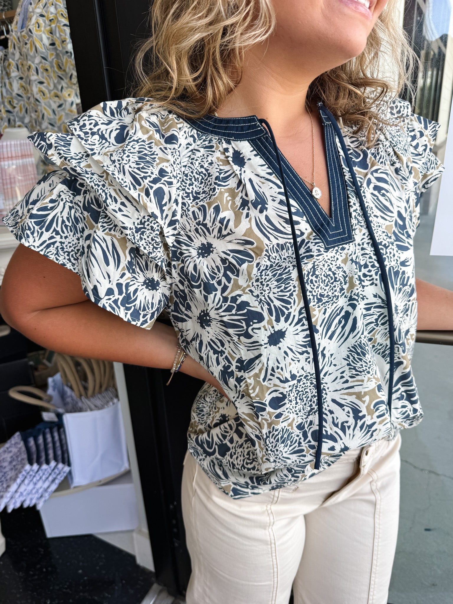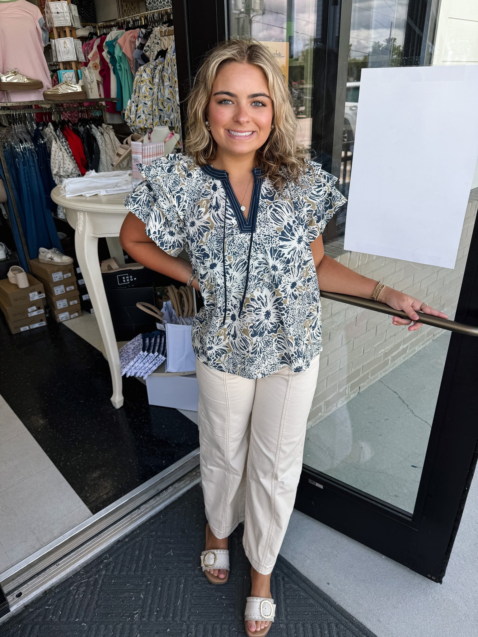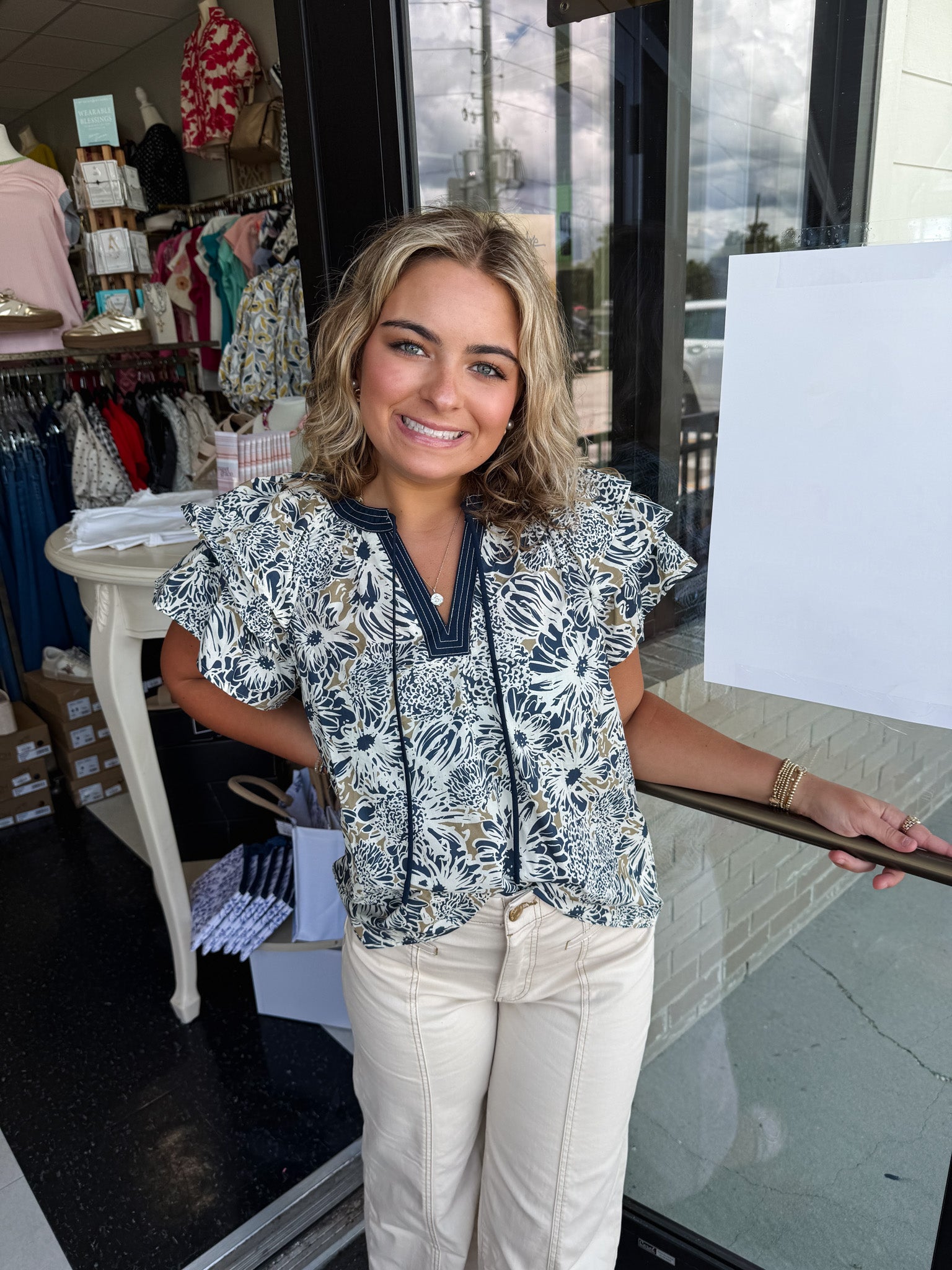 The Entro AnnaBelle Top features elegant ruffled sleeves and a versatile string neckline that can be styled open or closed. Its subtle v-neck design adds a refined touch, making it perfect for sophisticated, effortless looks.