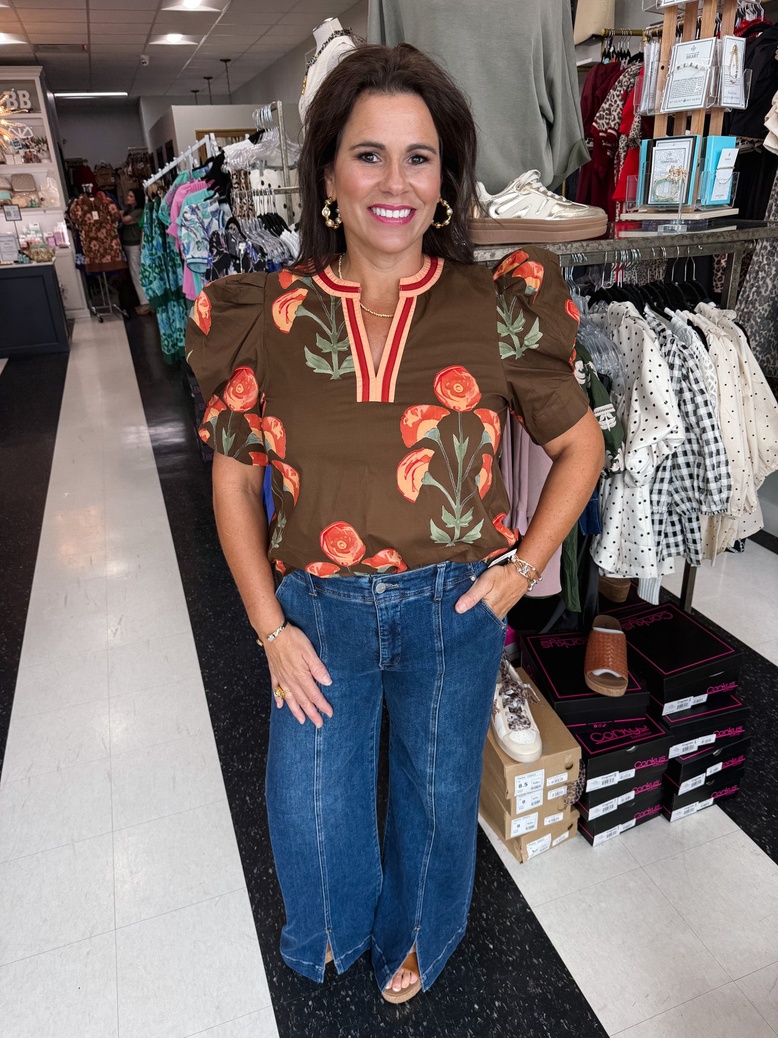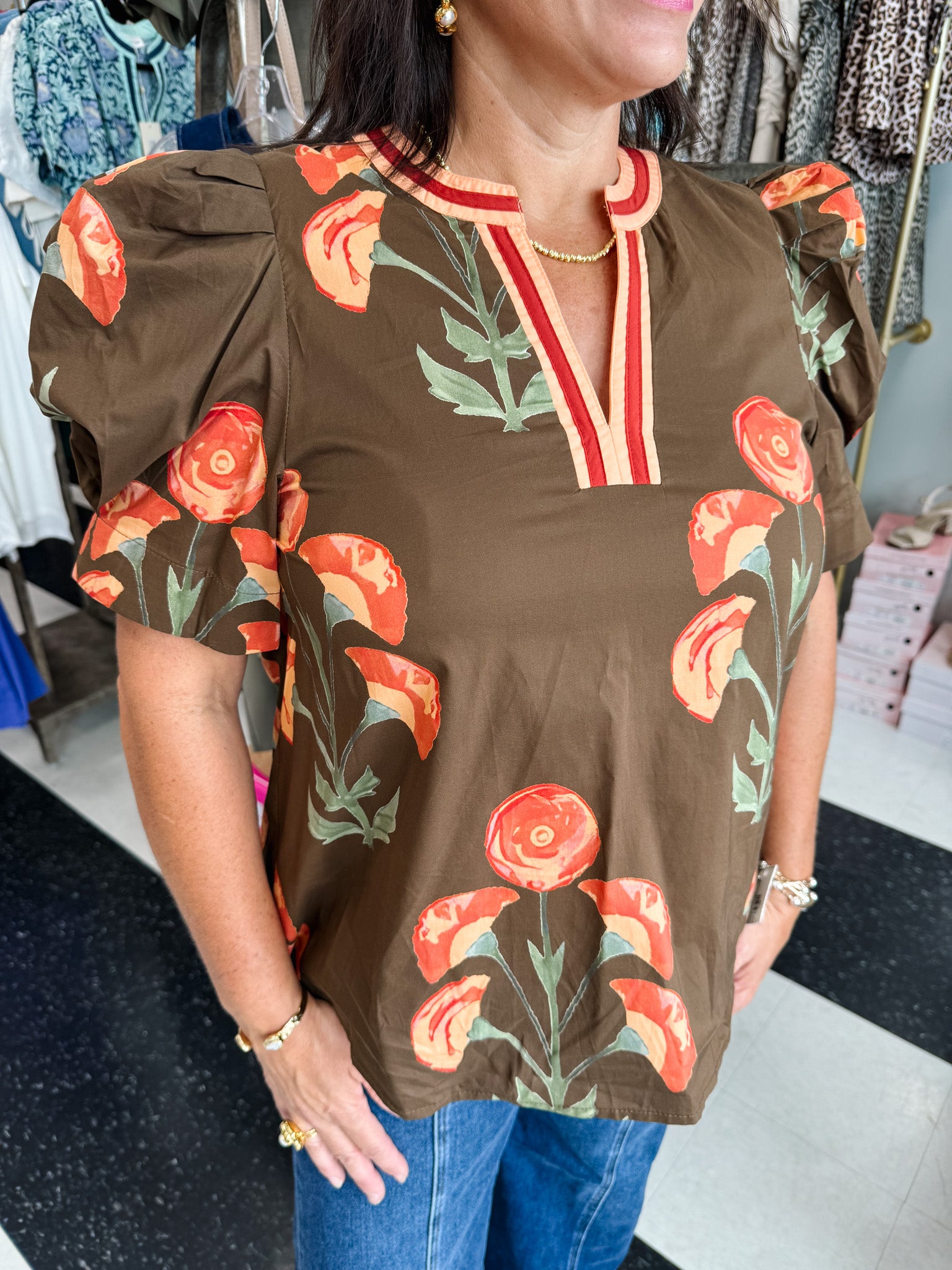 Brighten your wardrobe with the Entro Autumn Is Calling Top, a playful floral print blouse that brings charm to any outfit. Its structured shoulder puff sleeves and multicolor band accent around the round V-neck add a fun, flirty touch. Crafted from lightweight woven fabric, this unlined, non-sheer top keeps you comfortable and stylish all day long. Perfect for embracing the season with a splash of color and personality.