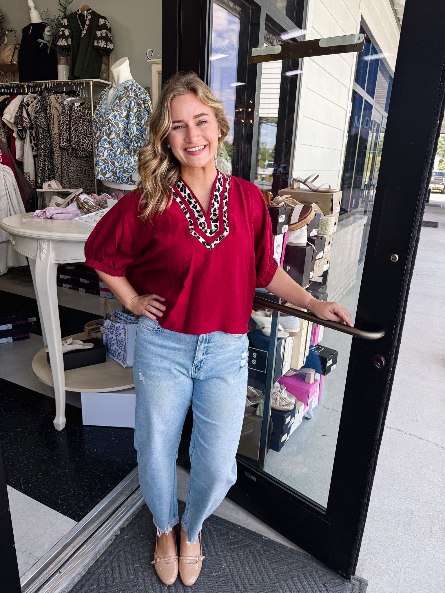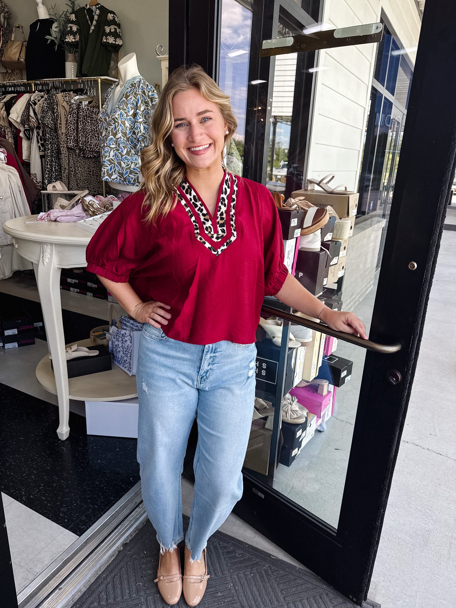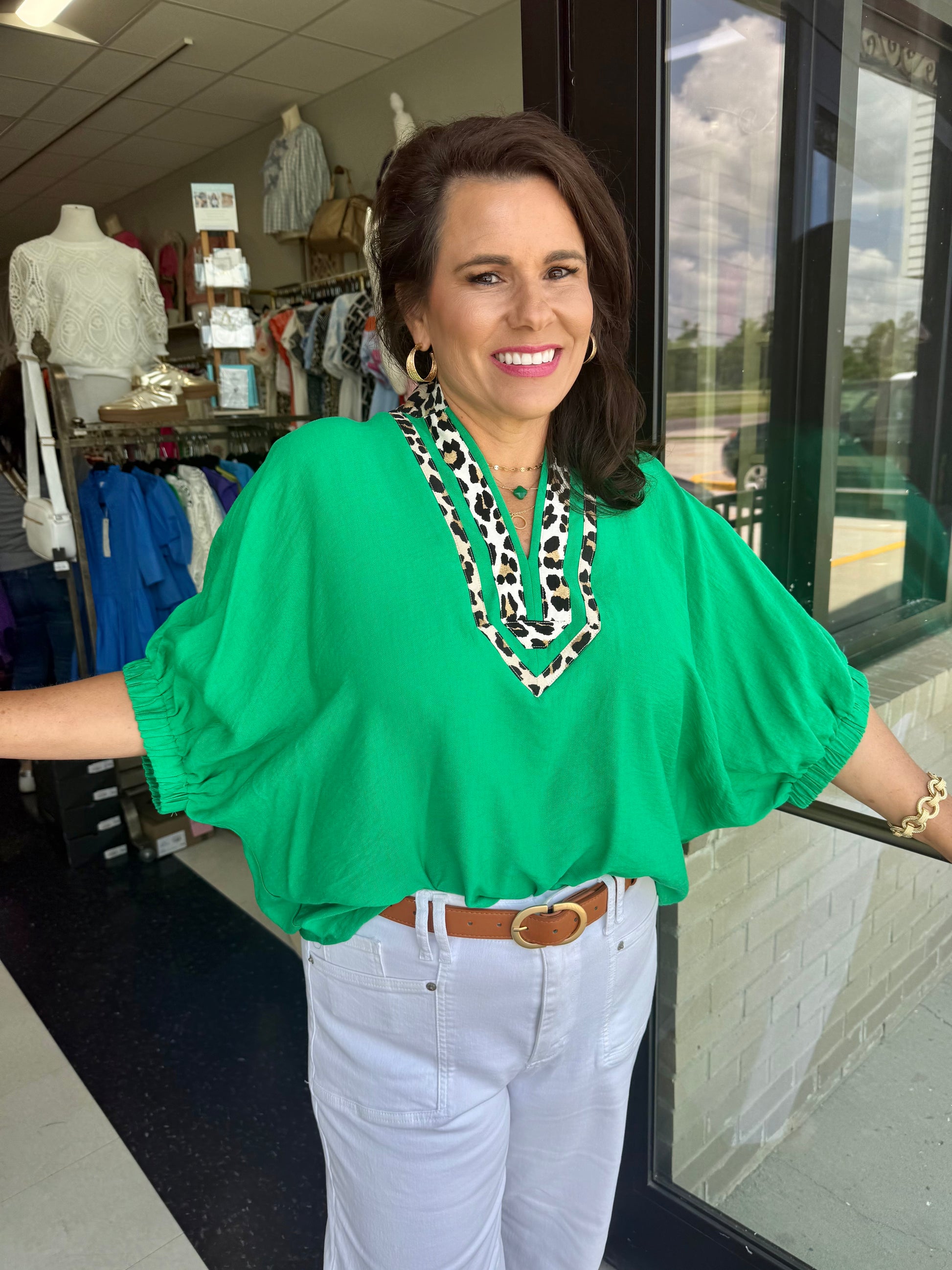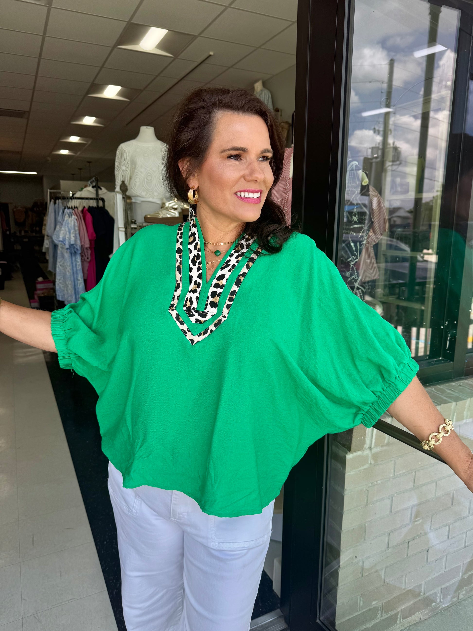 Indulge in luxurious comfort with our Solid Elasticated Sleeve Band Dolman Top. Featuring a beautifully detailed leopard print accented caftan-inspired split neck placket, our top is perfect for any occasion. The woven non-sheer fabric is lightweight and unlined, providing a chic and sophisticated look. Elevate your wardrobe with this exclusive, one-of-a-kind piece that exudes elegance and style.