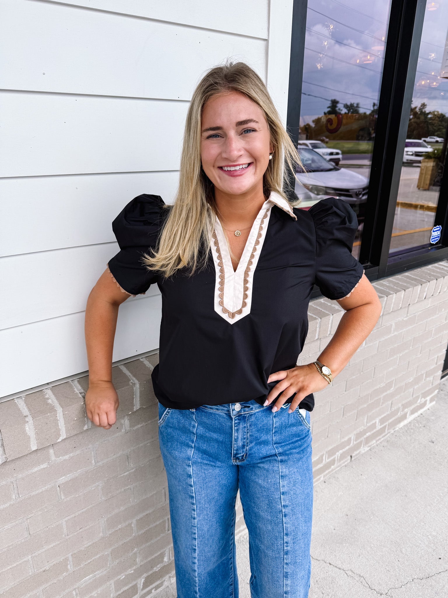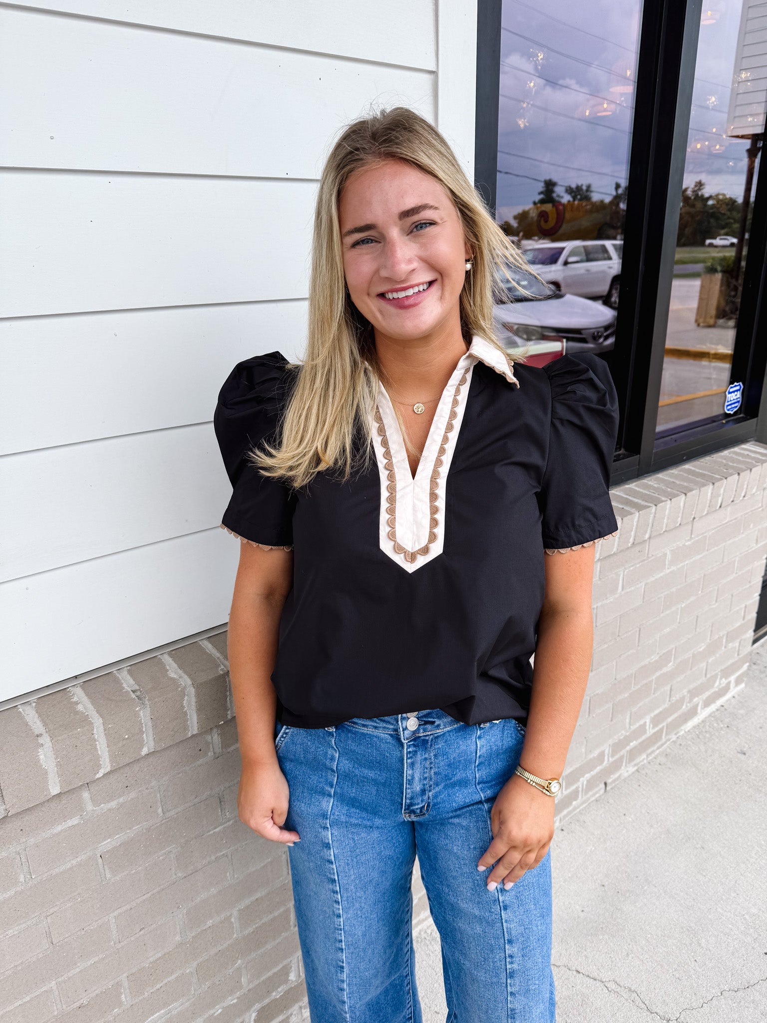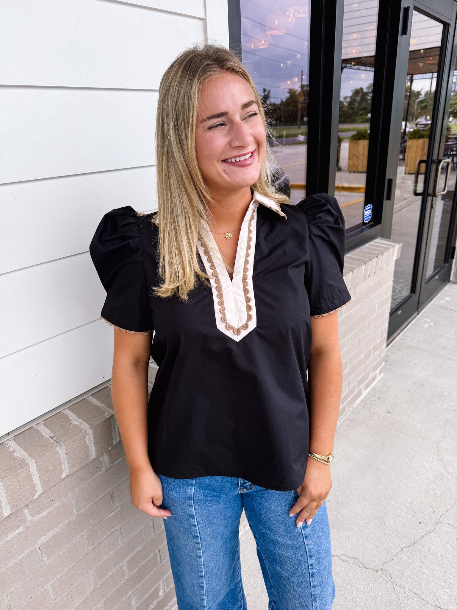 Elevate your style with the Entro Charlie Top, featuring charming pleated puff sleeves and a scalloped edge that adds a whimsical touch. The caftan-inspired high neck band collar brings a unique flair, while the lightweight woven fabric keeps you comfortable all day. Unlined and non-sheer, this playful pullover top is perfect for adding a fun, flirty vibe to any outfit.