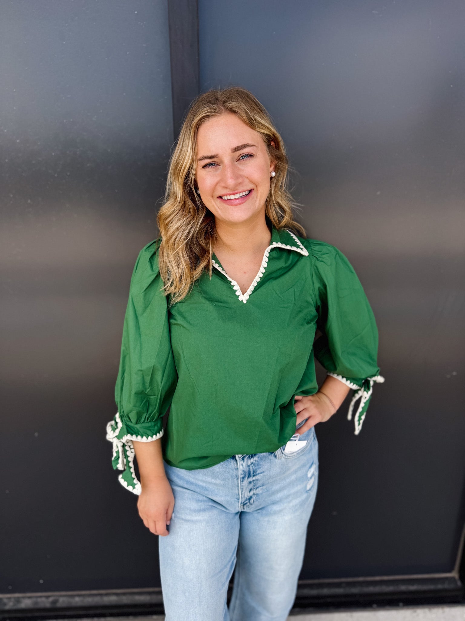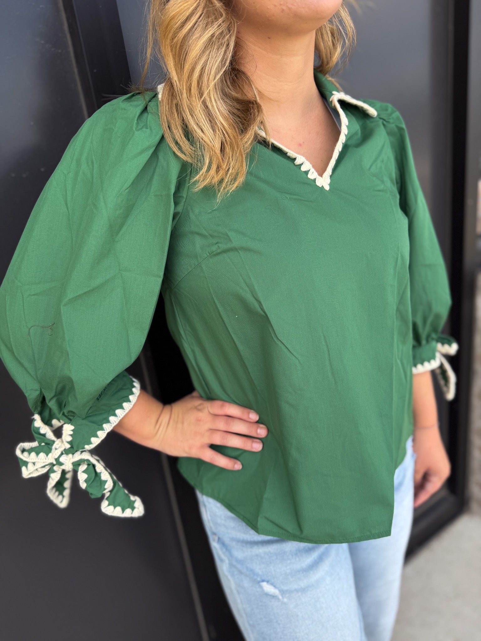 Elevate your wardrobe with the Entro Cutting Edge Top, a sophisticated piece featuring solid 3/4 sleeves accented by contrast scallop trim at the collar. The split neckline and bow tie cuffs with gathered sleeve detail add refined charm, while the lightweight woven fabric ensures comfort without sheerness. Unlined for a clean silhouette, this top blends elegance with modern style effortlessly.