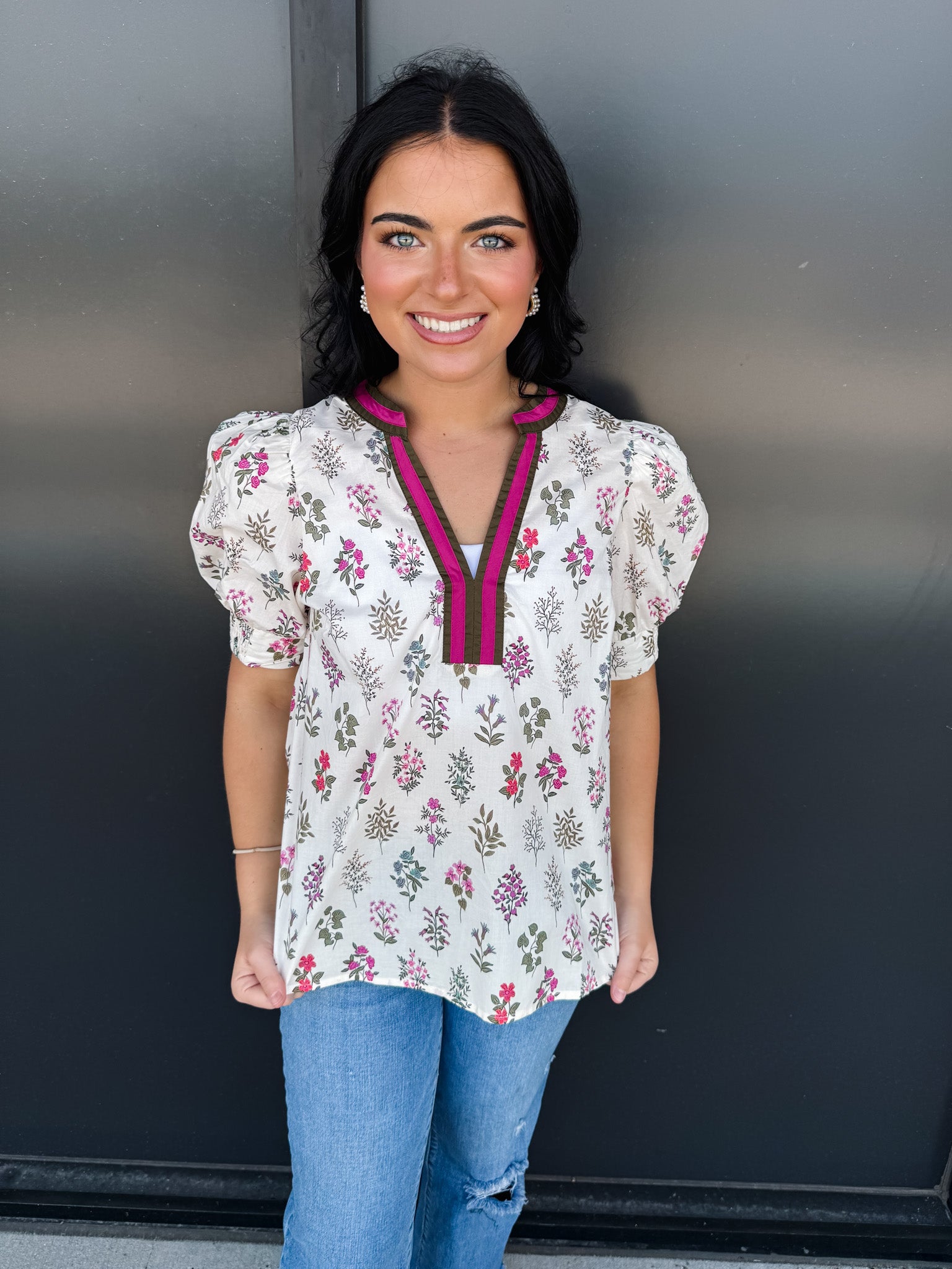 Elevate your wardrobe with the Entro Fall Fables Top, a sophisticated piece featuring a floral print and short puff sleeves. Its V-neckline is accented with a striking multicolor contrast trim, adding refined detail to the lightweight woven fabric. Designed unlined and non-sheer, this top offers effortless elegance and comfortable wear throughout the day.