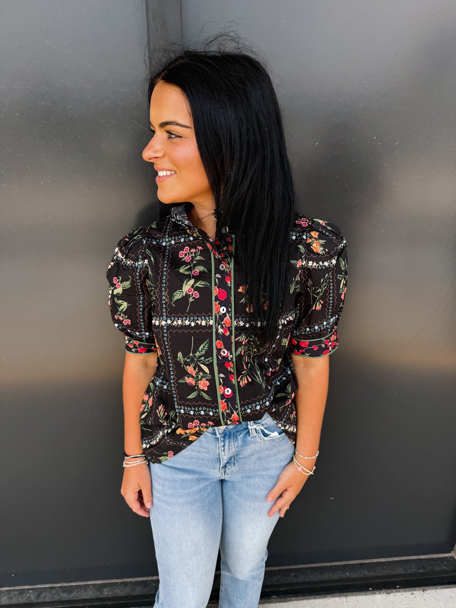 This elegant top features a delicate floral print with a ruffle neck band collar and a button-front closure, enhanced by contrast binding accents. The short puff sleeves add a refined touch, while the lightweight woven fabric ensures comfort without sheerness. Unlined for a breathable fit, this piece effortlessly combines sophistication with subtle charm.