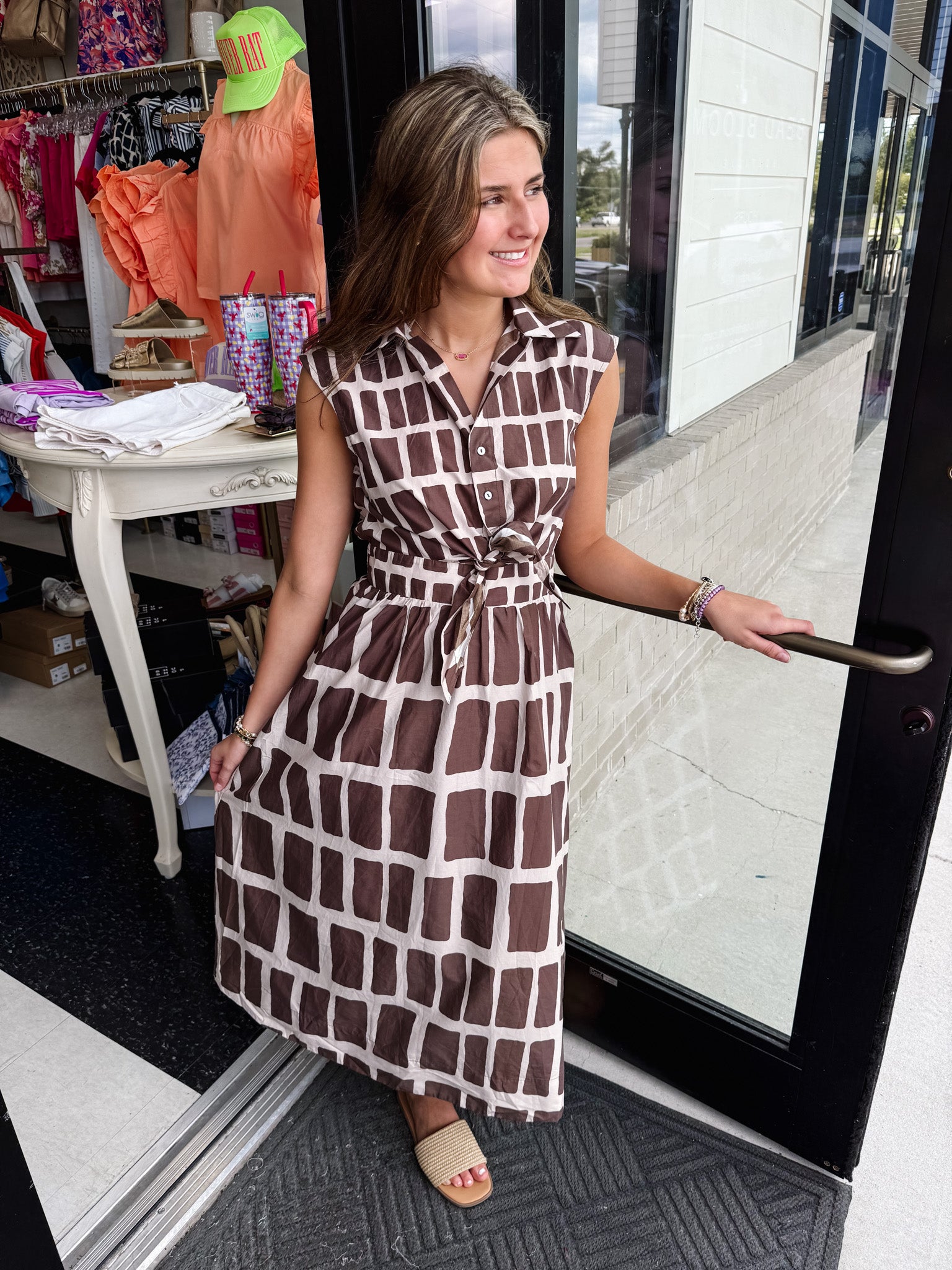 Elevate your wardrobe with the Entro Harper Dress. This sleeveless midi dress features an abstract print and a sophisticated collar button front with a knot closure. The smocked back waistband flatters your figure, while pockets at the side provide functionality. Lined and lightweight, this woven dress is perfect for any occasion.