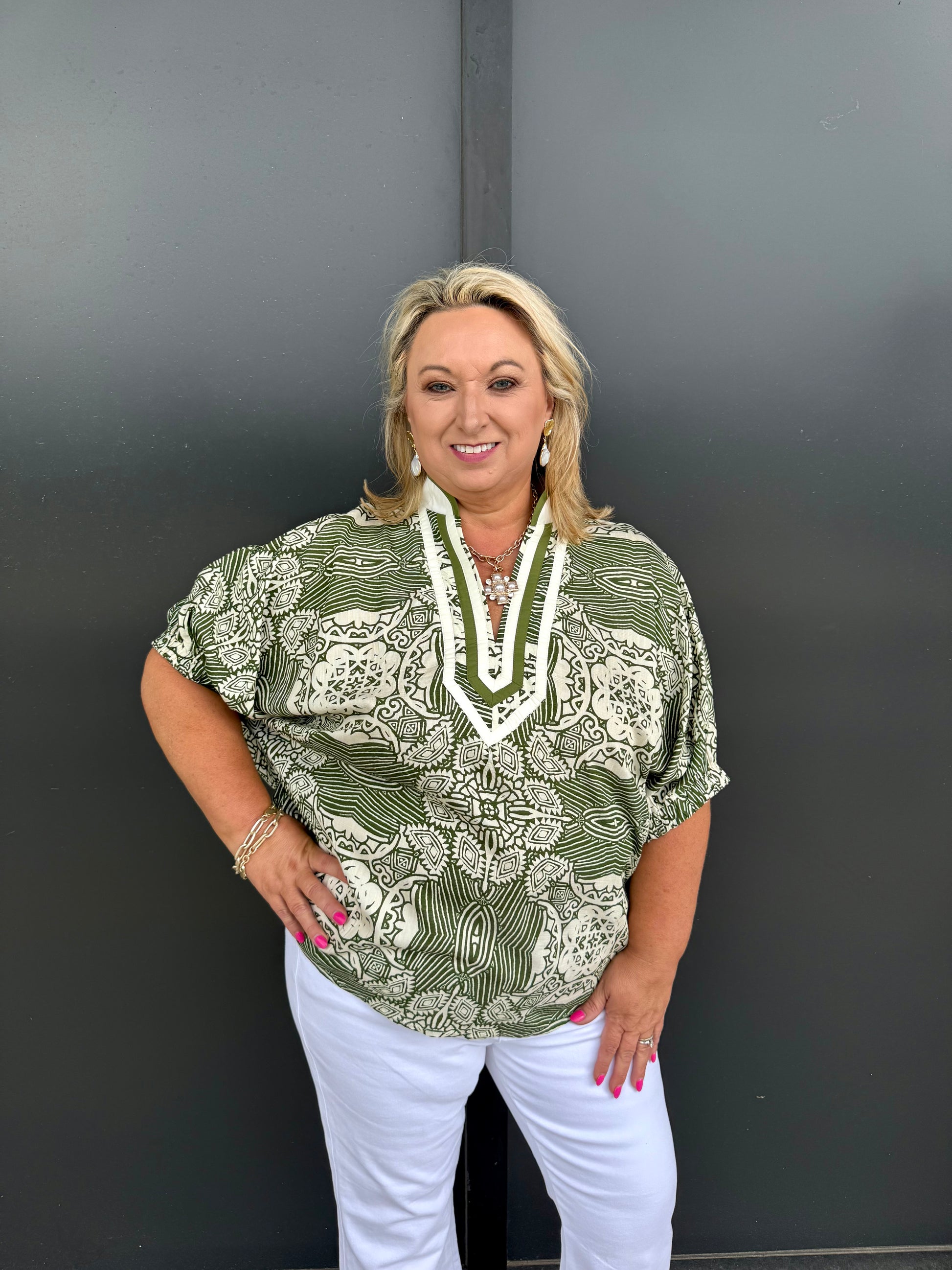 Brighten your wardrobe with the Entro Hello Laday Top, a playful blend of multi-patterned charm and caftan-inspired style. This lightweight, woven top features a colorful V-neck band and breezy short dolman sleeves, perfect for effortless, fun days. Unlined and non-sheer, it offers comfort and coverage without weighing you down.