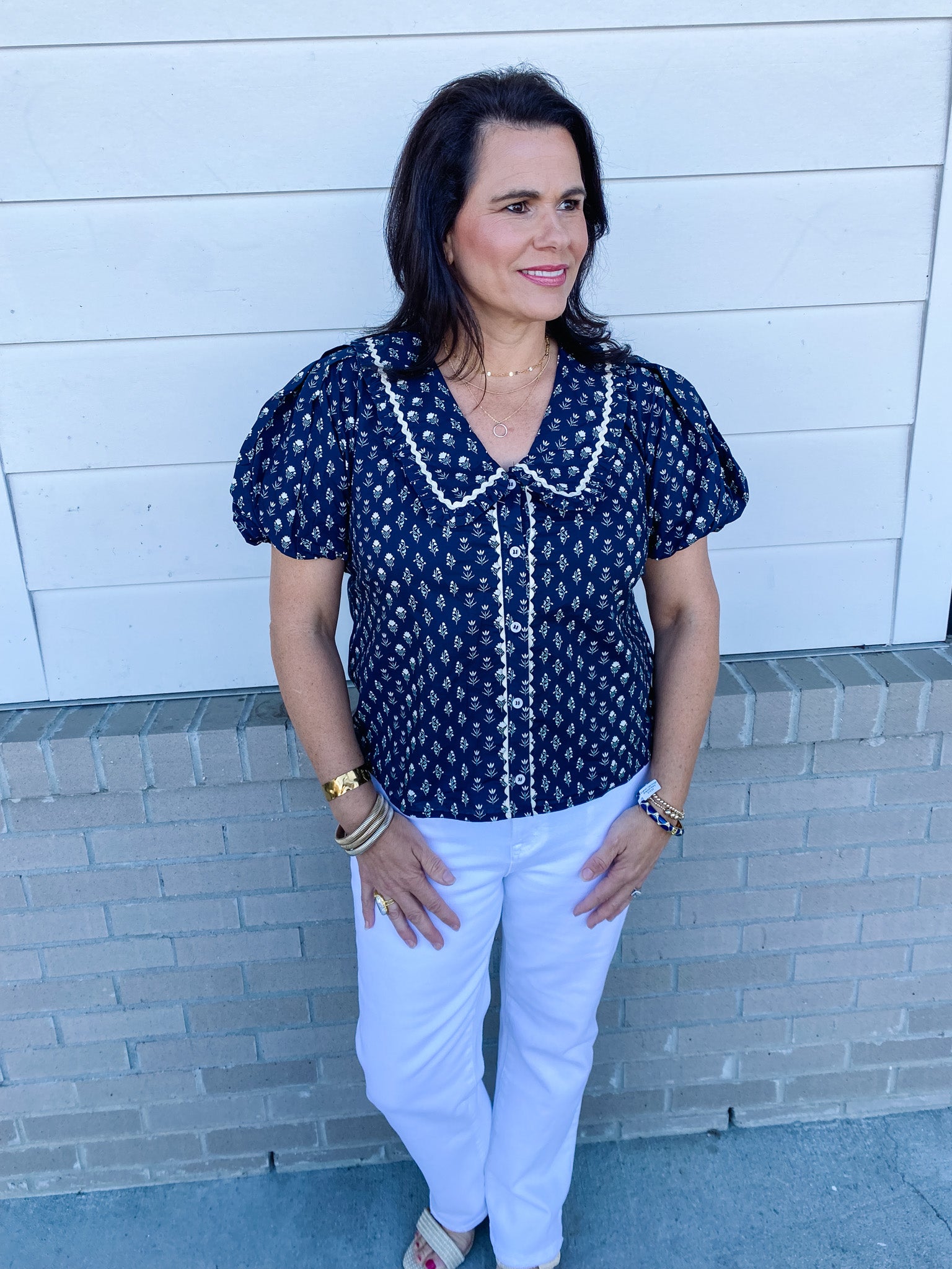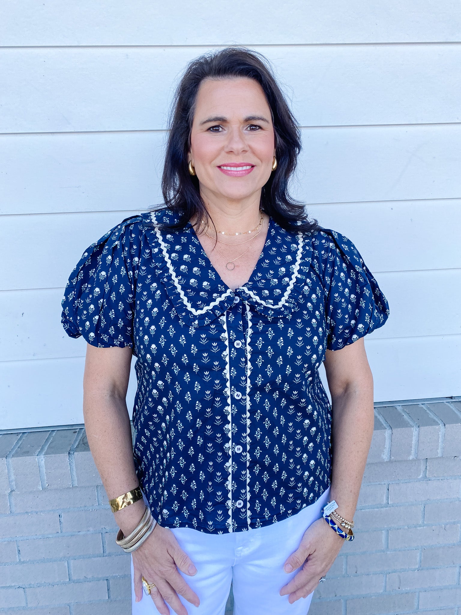 Effortlessly chic and elegant, the Entro Mandy Top features a charming floral print and delicate bubble sleeves. The button front closure is adorned with a ruffle finish and scallop trim inset, adding a touch of sophistication. Crafted with a lightweight woven fabric, this top is non-sheer and perfect for any occasion.