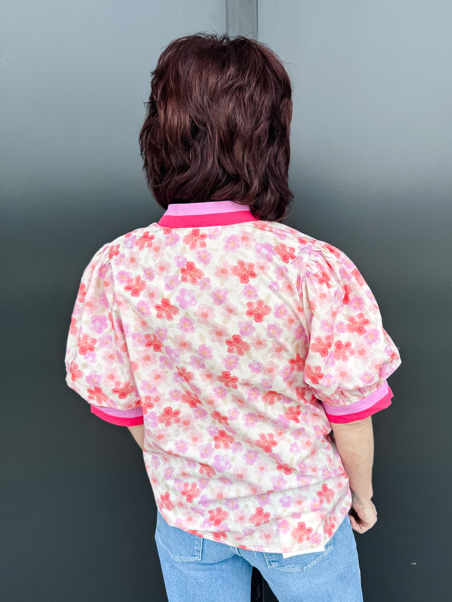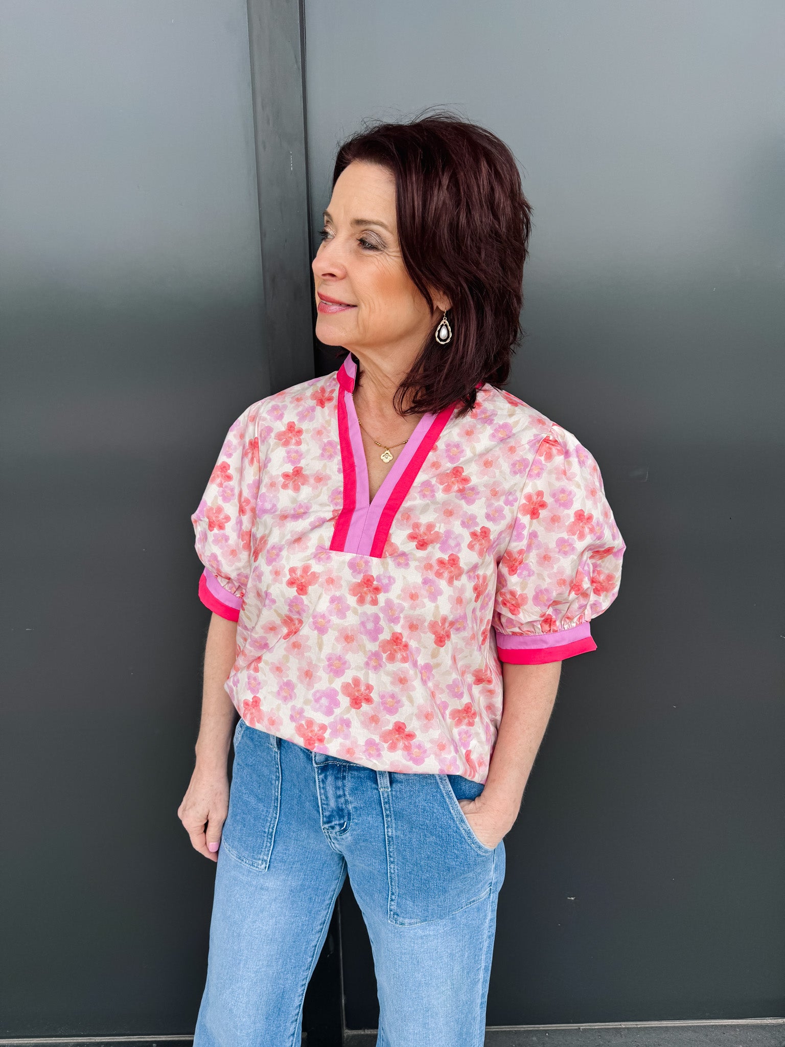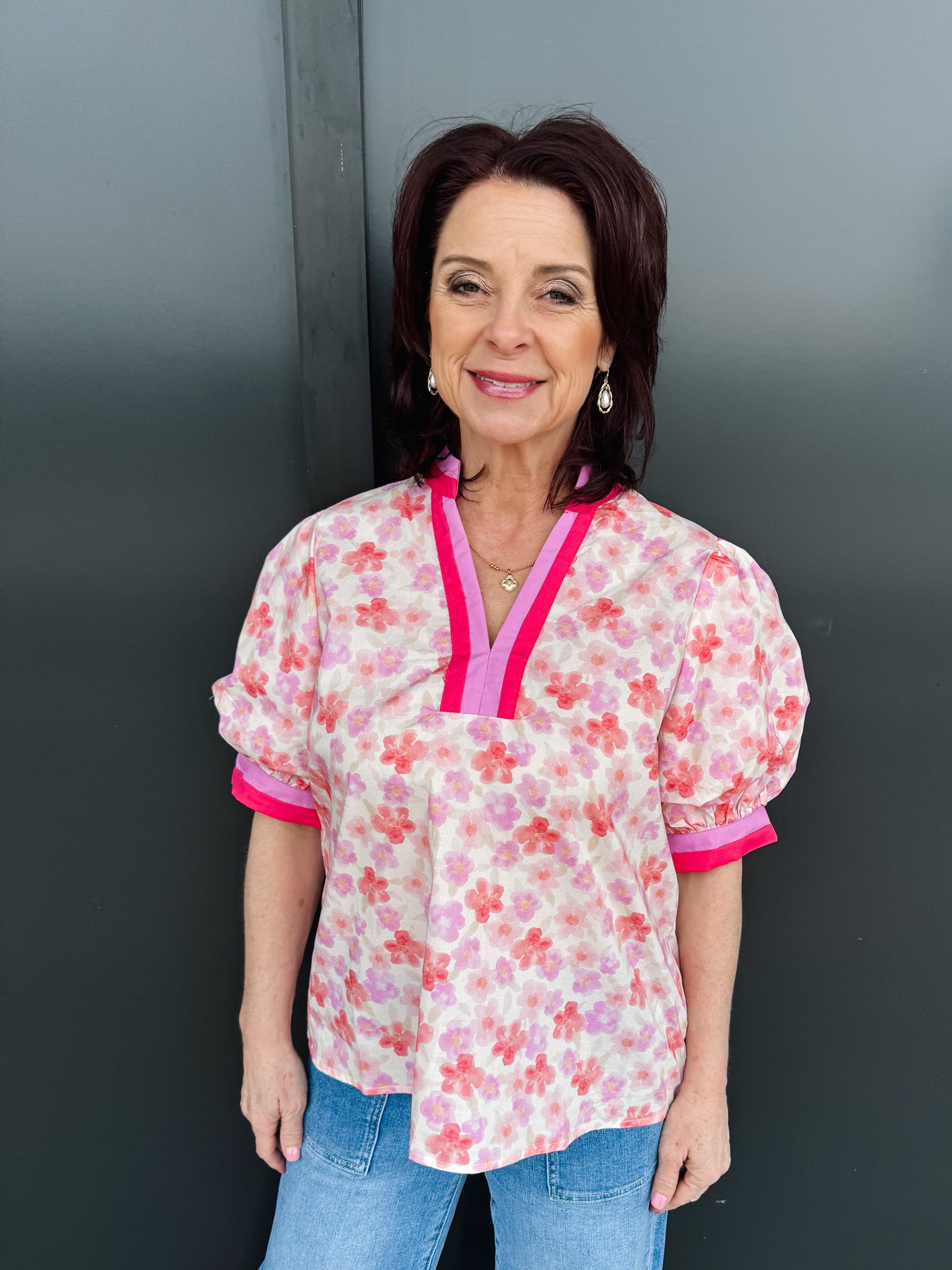 Get ready to turn heads with the Entro Melly Top! This stunning floral top features a gorgeous striped V-neckline and puffed sleeves with a fun striped detail. Perfect for any spring or summer event, this top is not sheer and will keep you looking fabulous all day long.