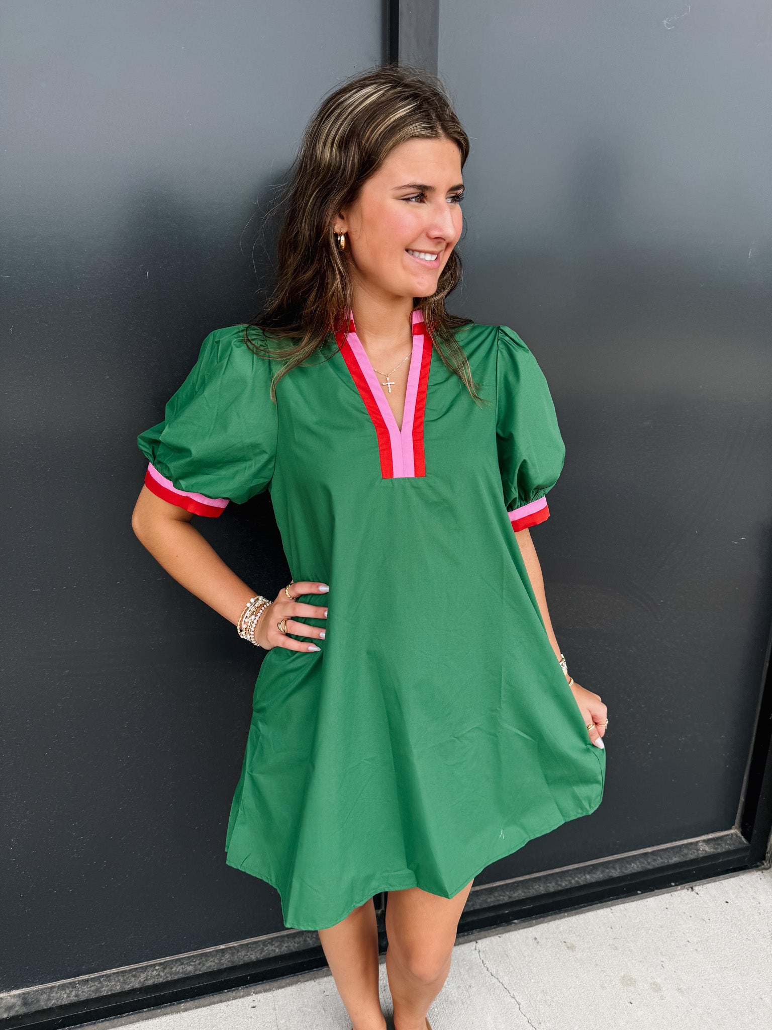 Step into charm with the Entro Multi Collar Dress, featuring playful puff sleeves and a vibrant pink and red striped collar that adds a pop of fun. Crafted in a rich hunter green, this lightweight dress is double lined for comfort and confidence. Perfect for days when you want to feel effortlessly stylish and spirited.