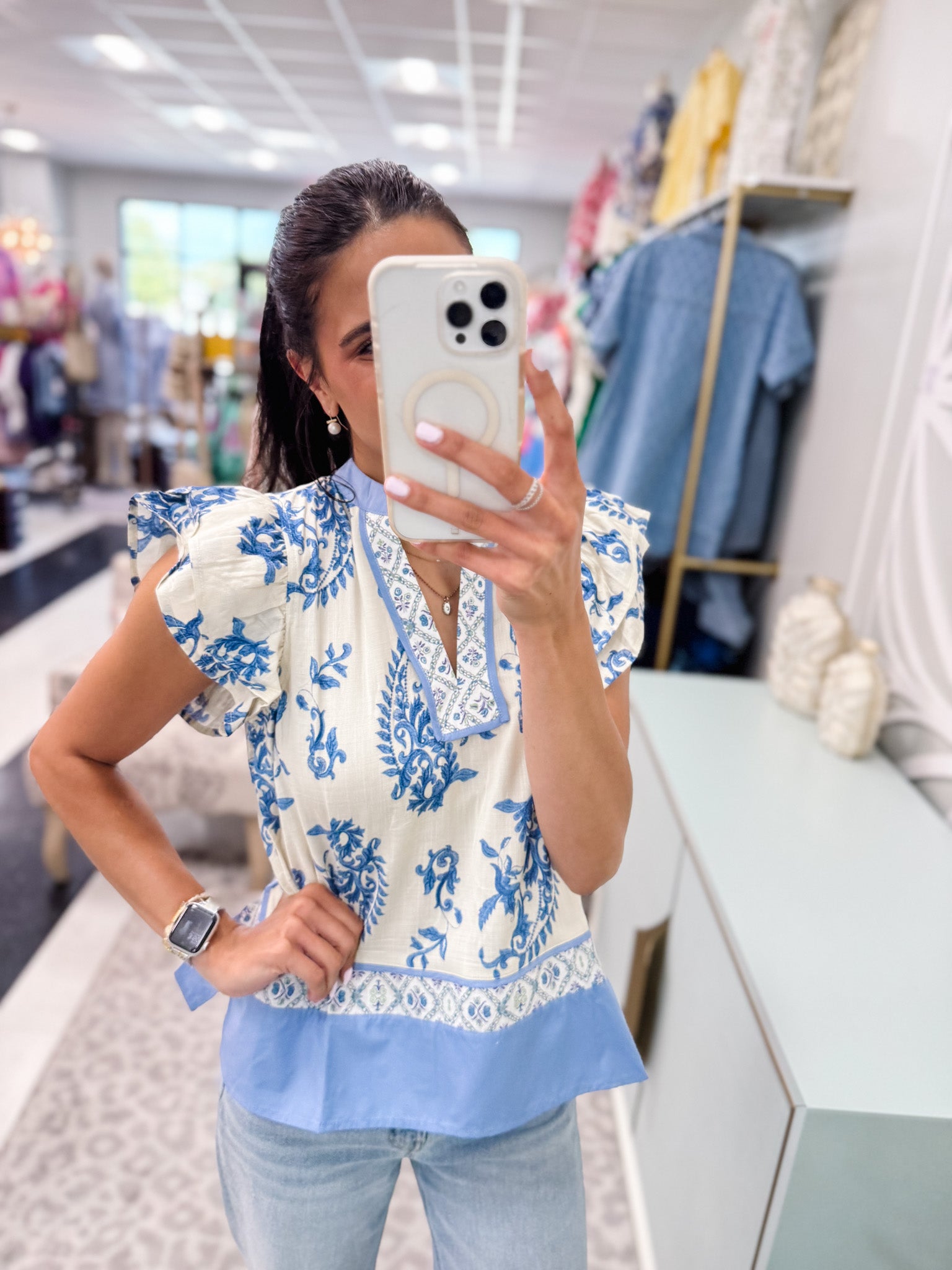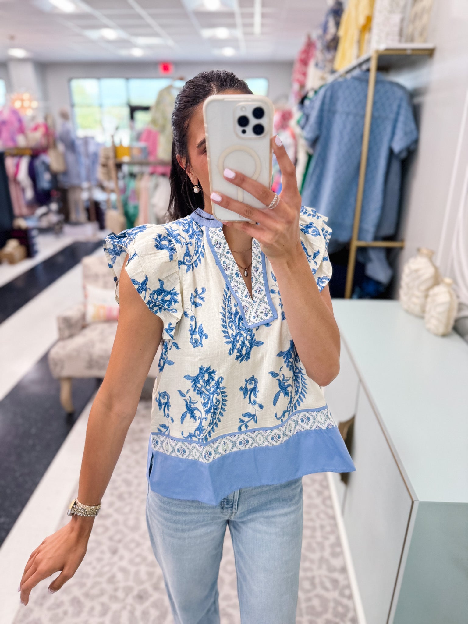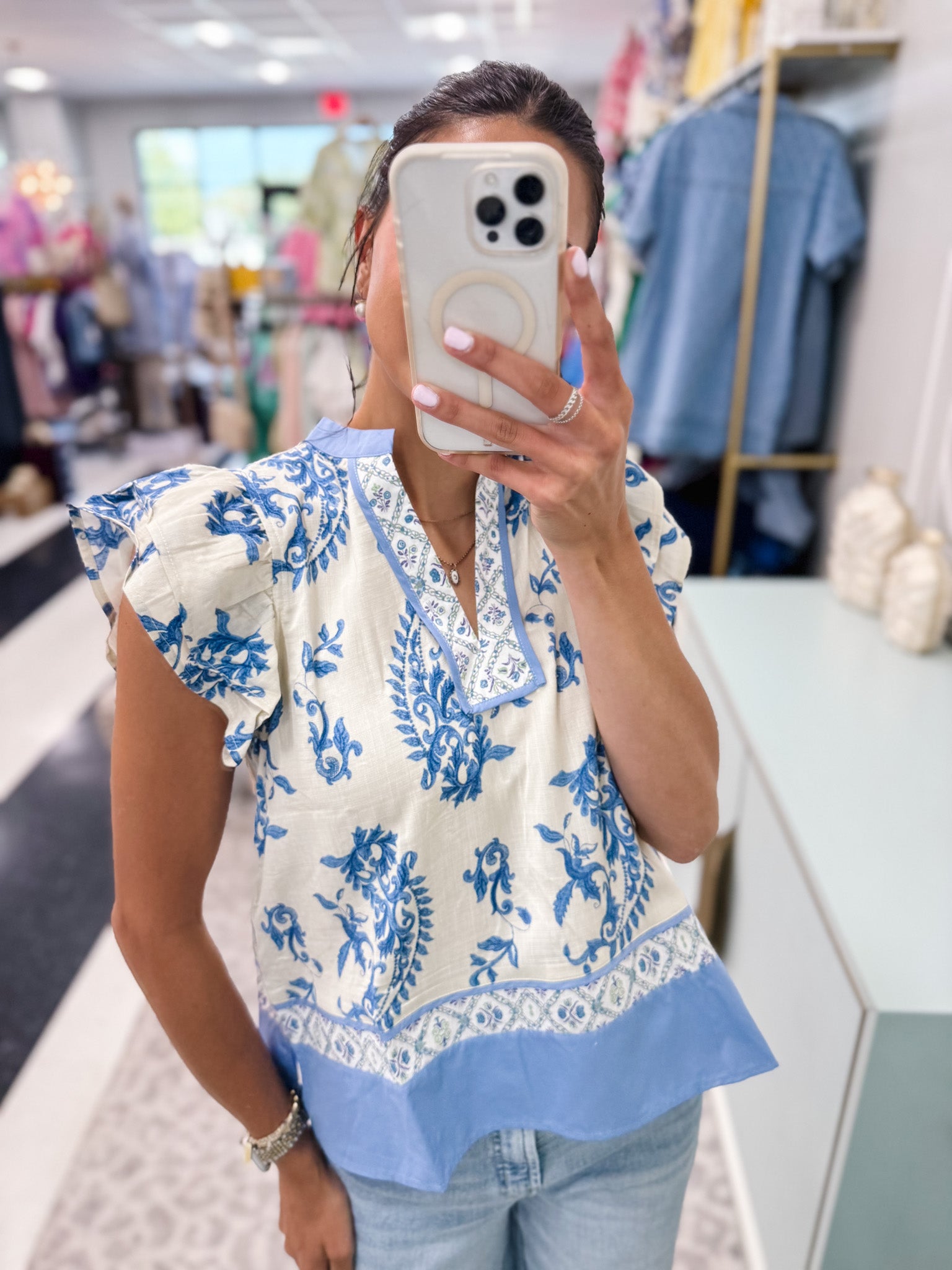 The Entro Rissa Top brings a fresh burst of fun with its green and white pattern and playful riffle sleeves. Light and breezy, it’s perfect for adding a splash of whimsy to your everyday look while keeping you comfortable all day long.