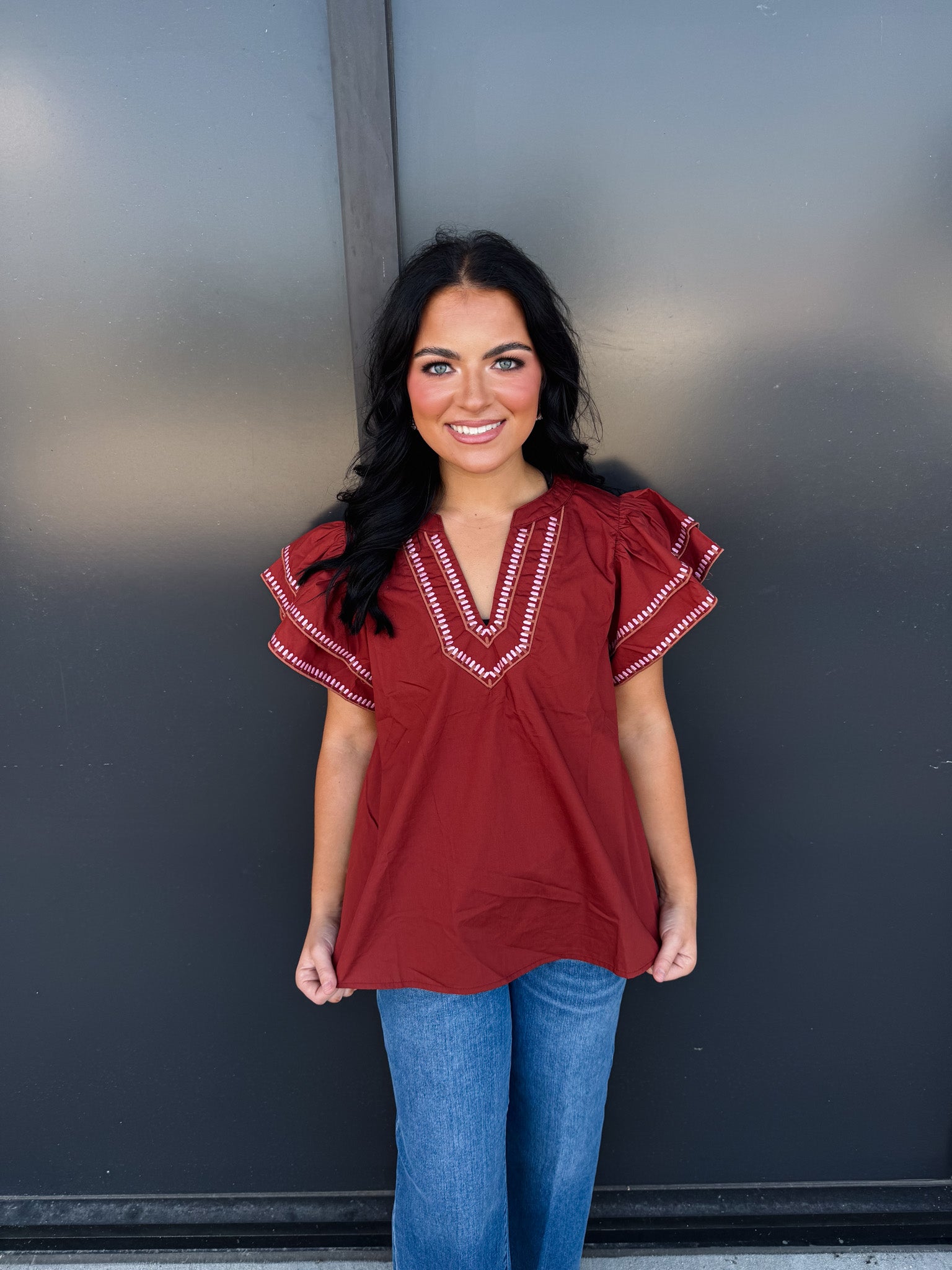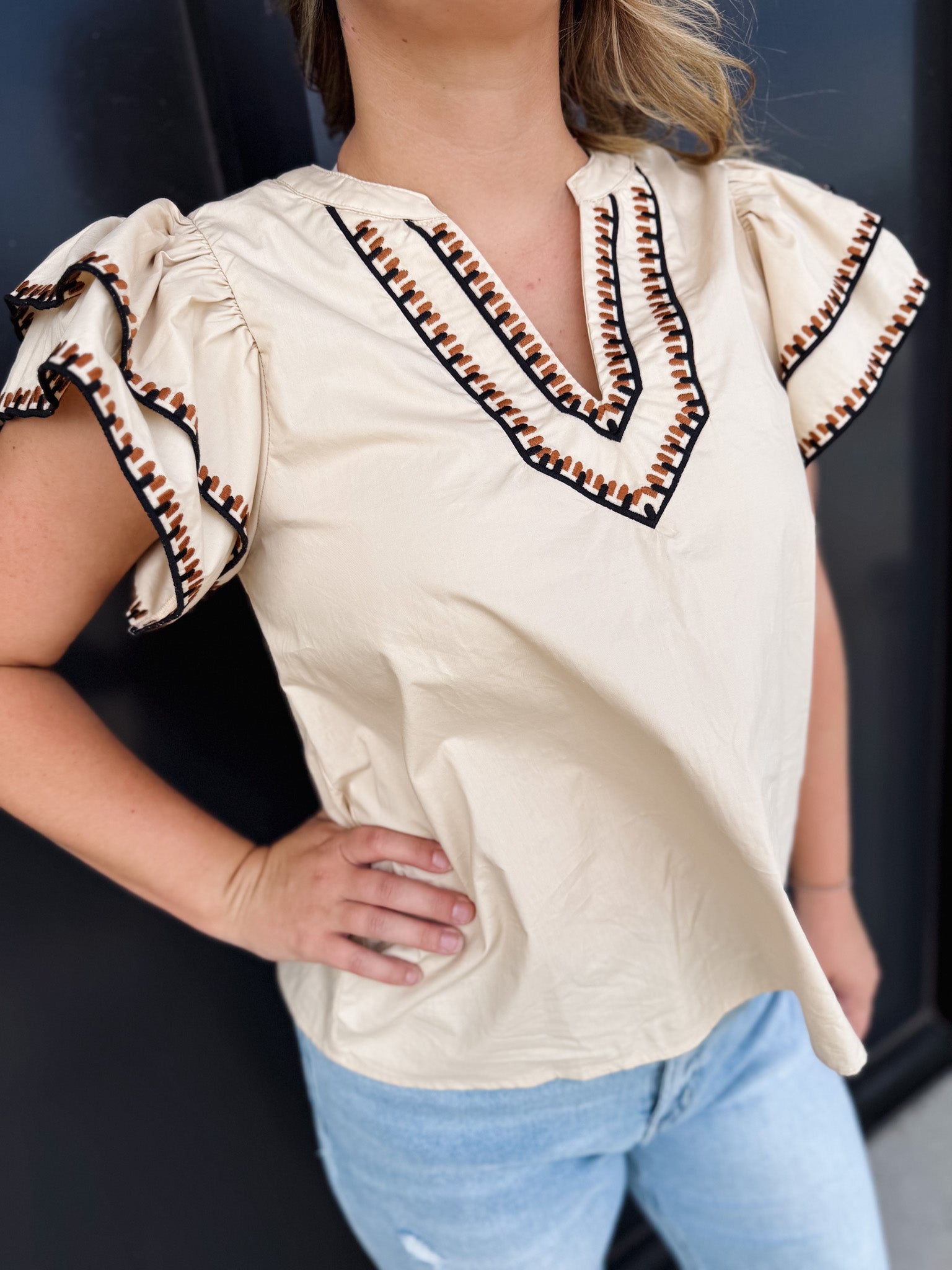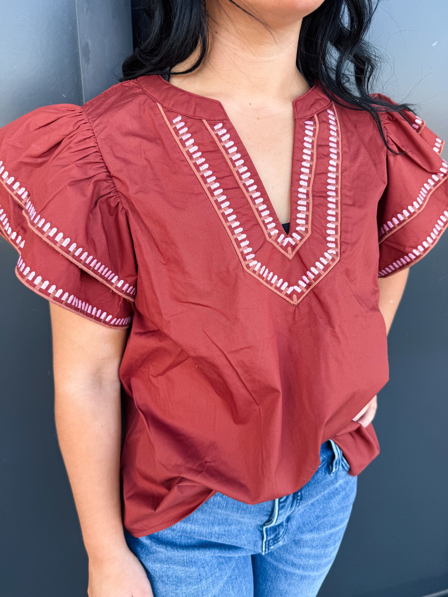 Elevate your wardrobe with the Entro Slow Burn Top, a sophisticated choice featuring delicate layered ruffle flutter sleeves that add graceful movement. Its contrast embroidered trim along the V-neck enhances subtle elegance, while the lightweight woven fabric offers comfort without compromising structure. Unlined and non-sheer, this top provides an effortlessly refined look perfect for both day and evening occasions.