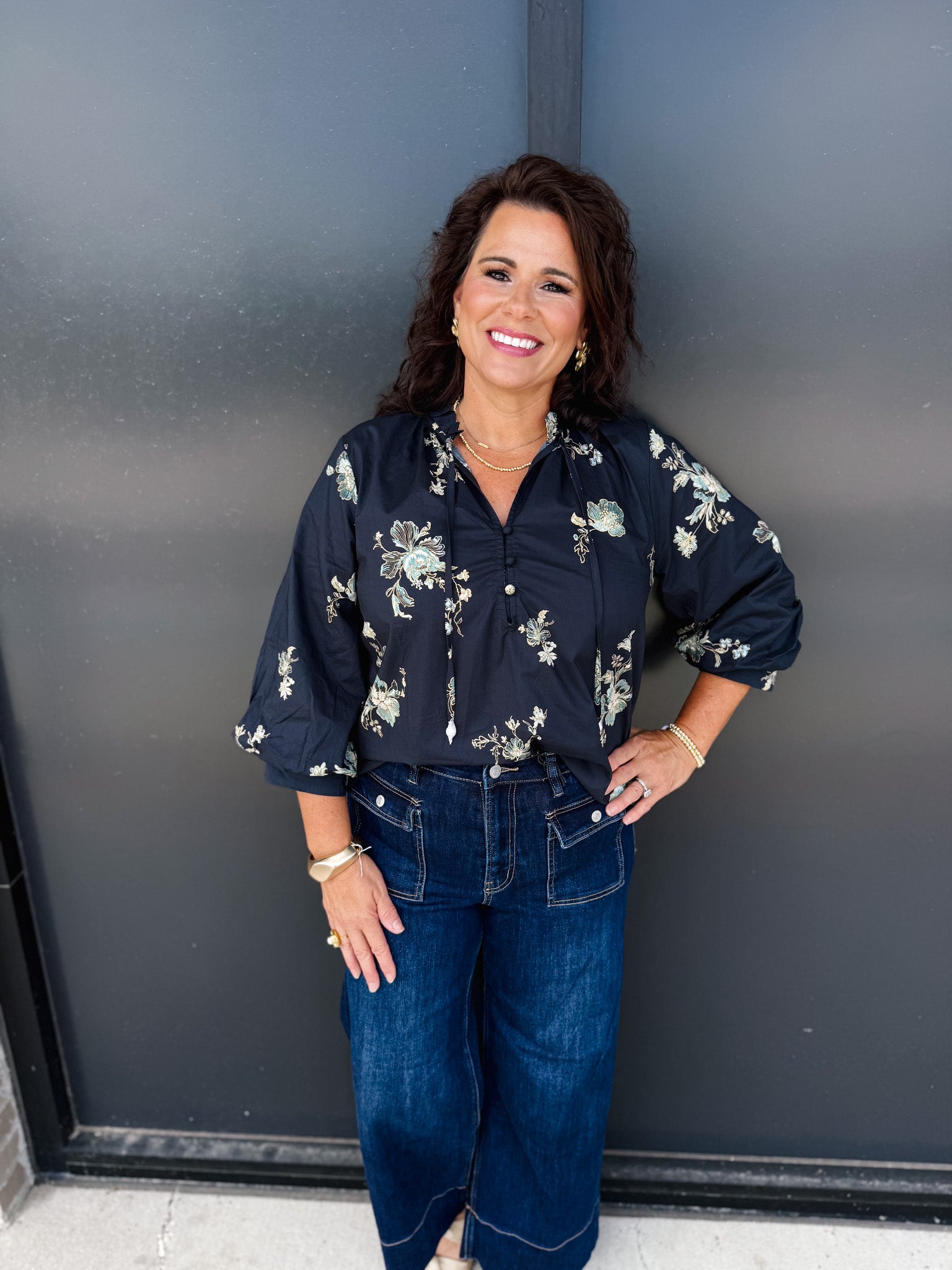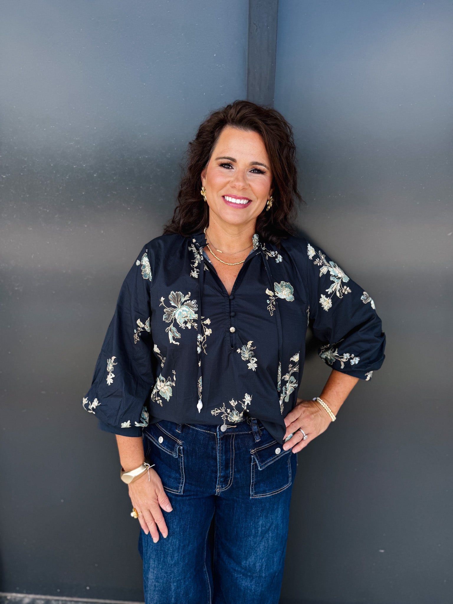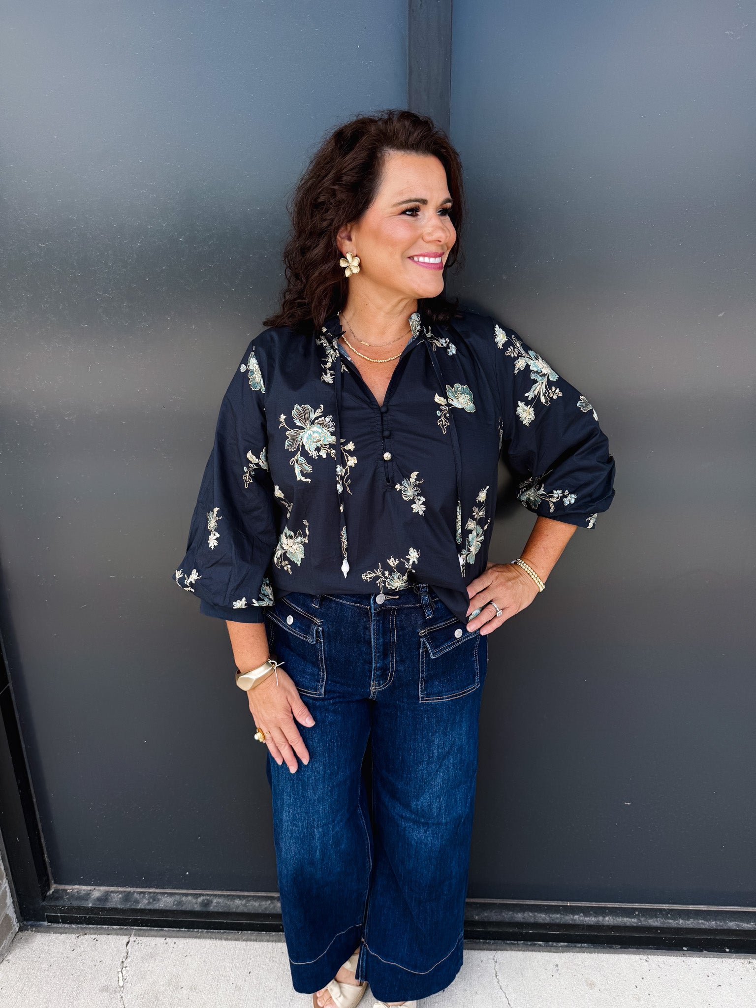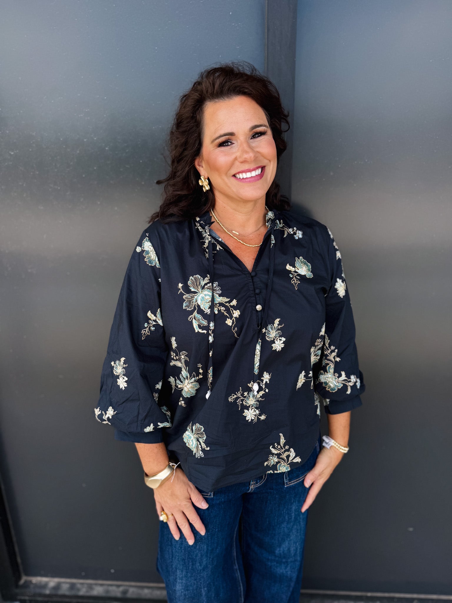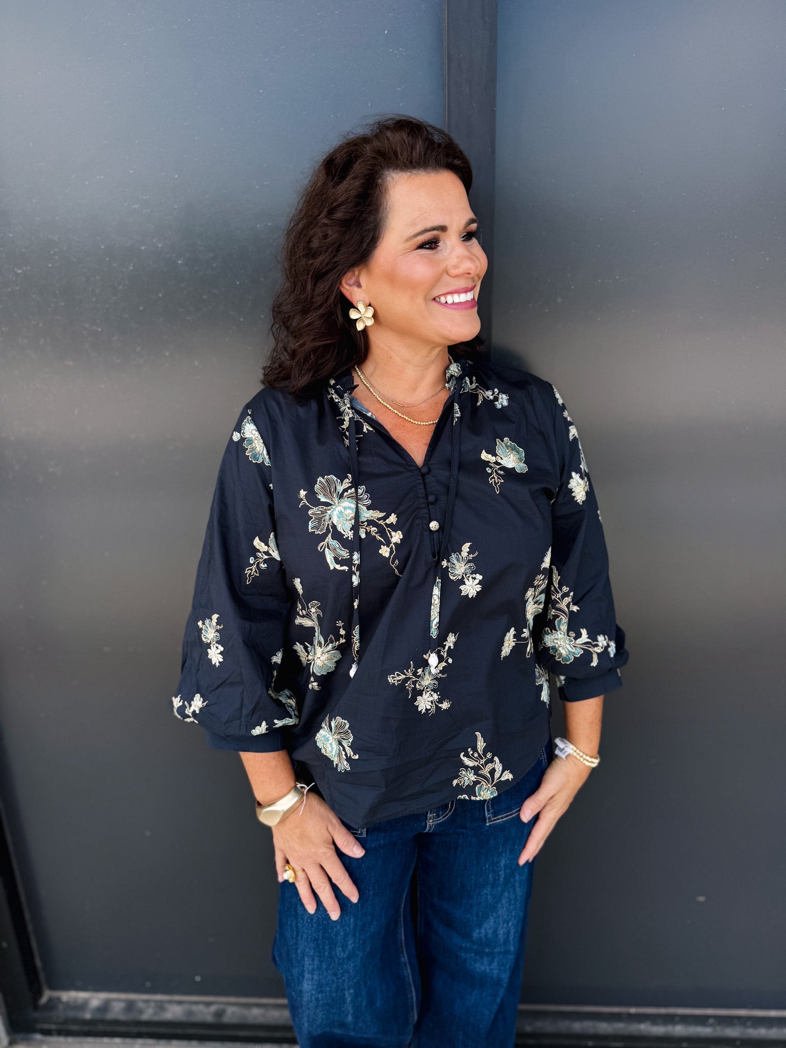 Elevate your wardrobe with the Entro Stay Awhile Top, featuring an elegant black base adorned with a delicate flower pattern encircling the entire garment. This sophisticated design offers timeless style with a touch of natural charm, perfect for both casual and refined occasions. Crafted to enhance your silhouette, it’s an ideal choice for those who appreciate subtle details that make a lasting impression.