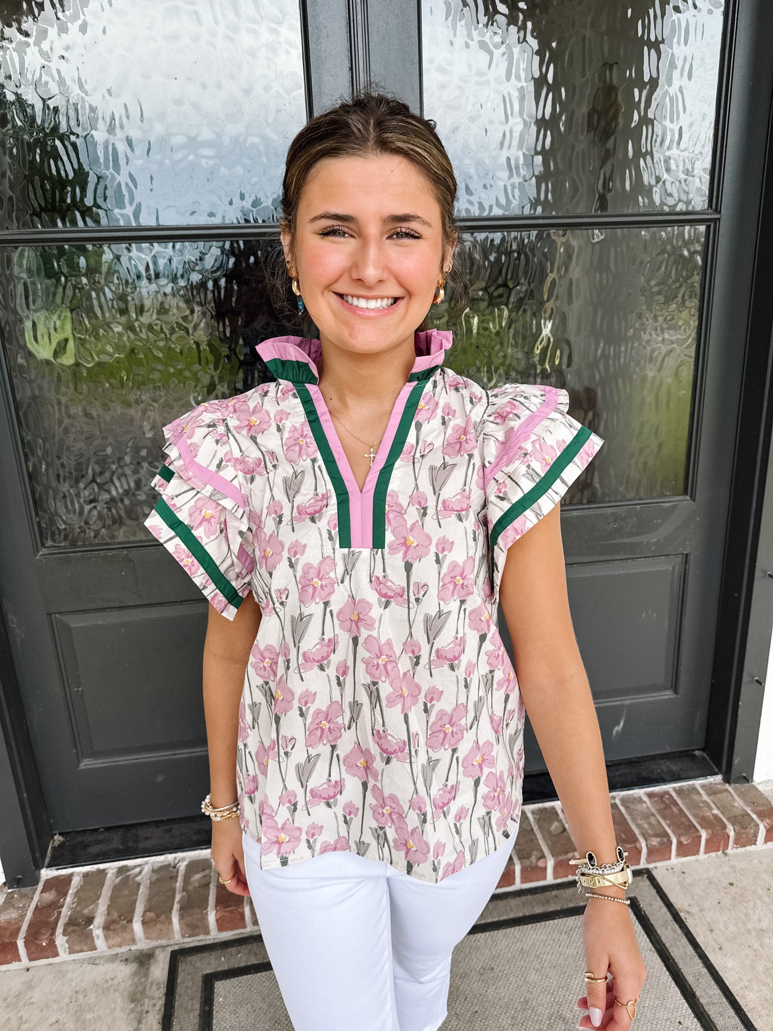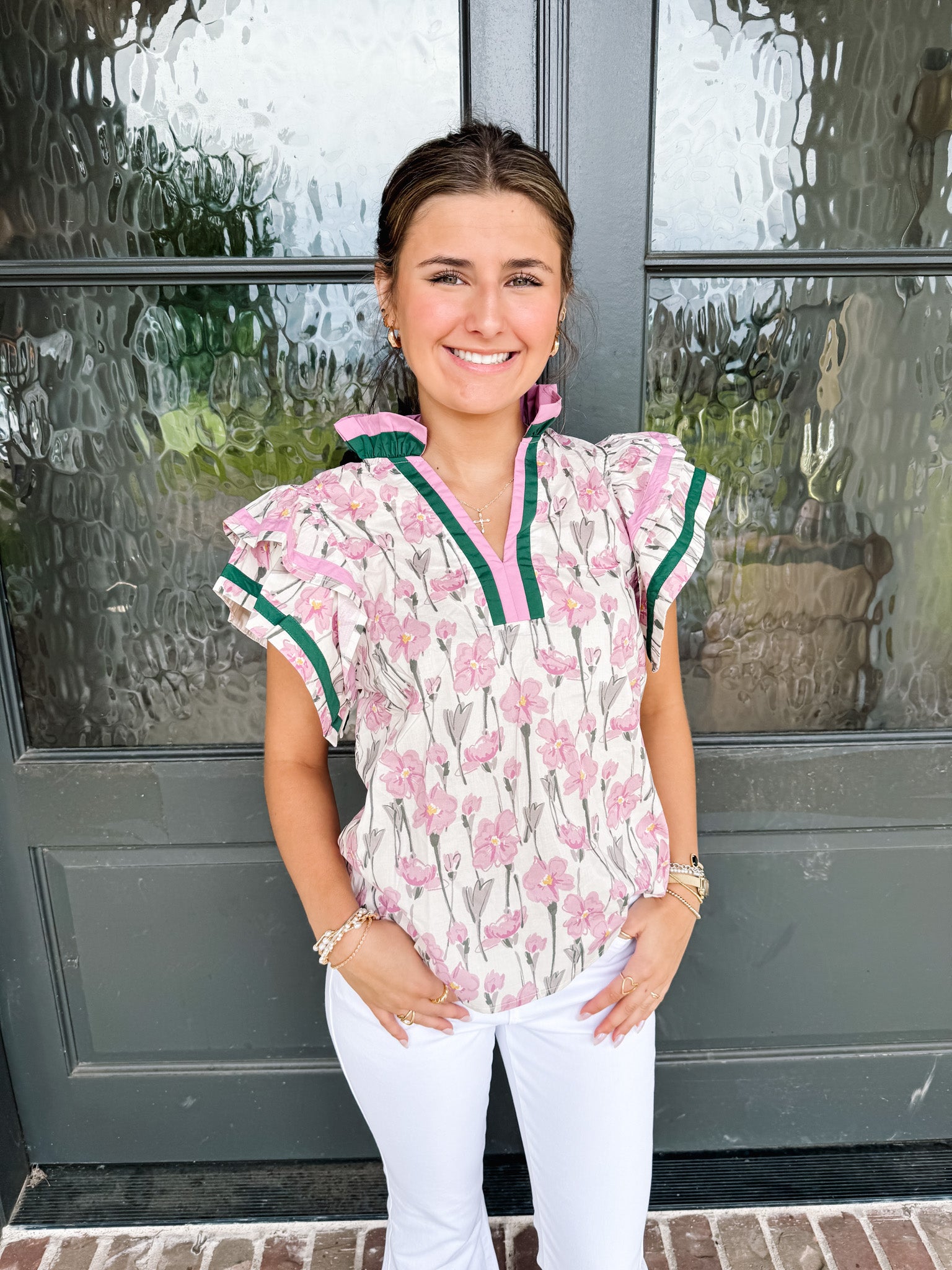 The Entro Monica Top brings a playful touch to your wardrobe with its floral print and tiered flutter sleeves. Lightweight and woven for comfort, it features a multicolor ruffle trim around the neck and sleeves that adds a fun, flirty vibe. Unlined and non-sheer, this pullover top is perfect for breezy days when you want to feel effortlessly stylish.