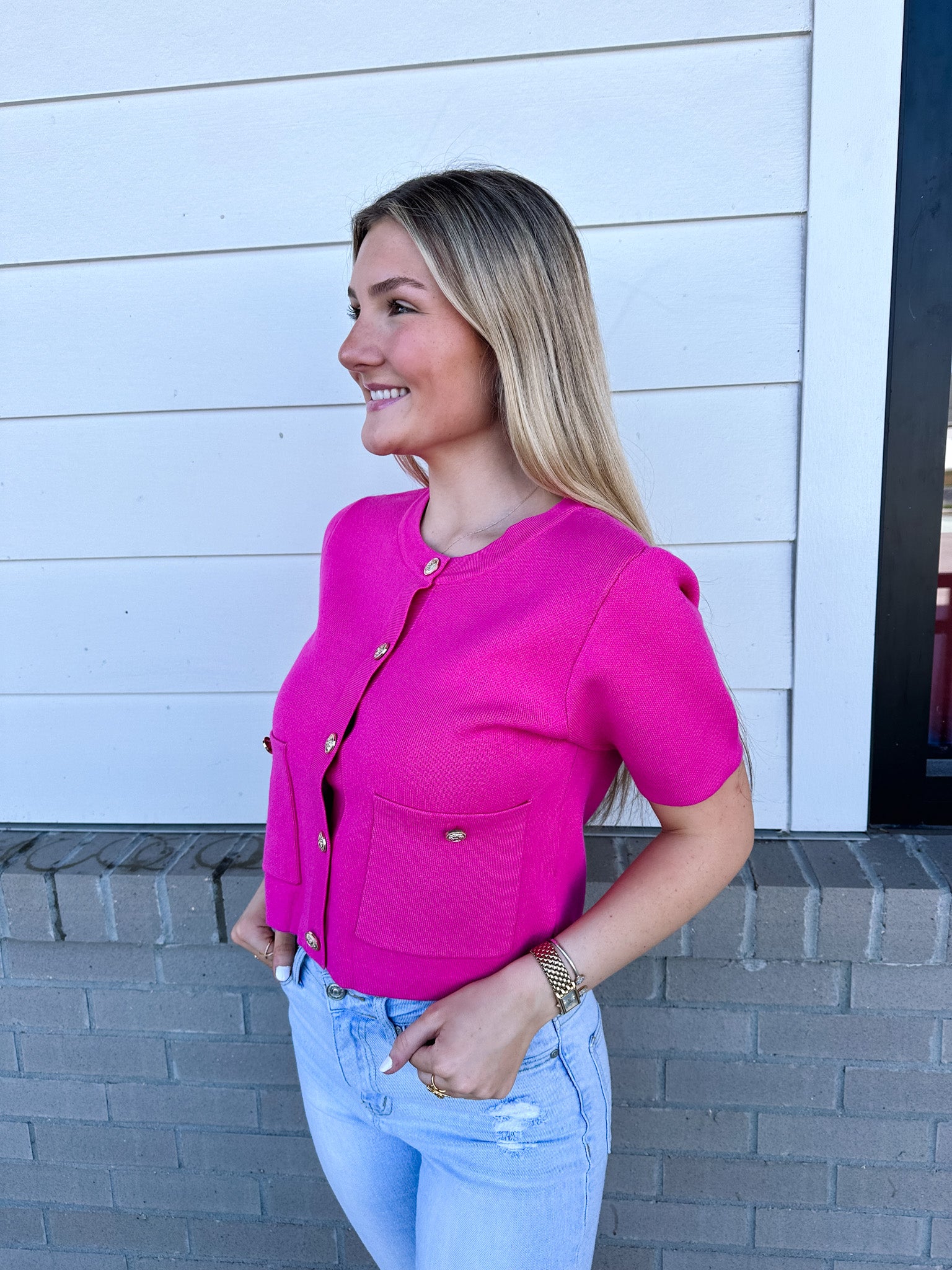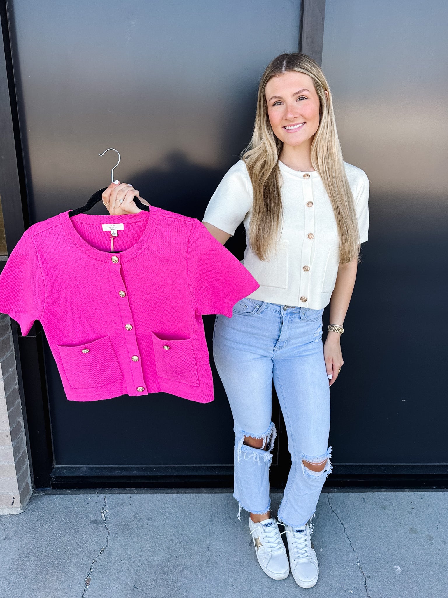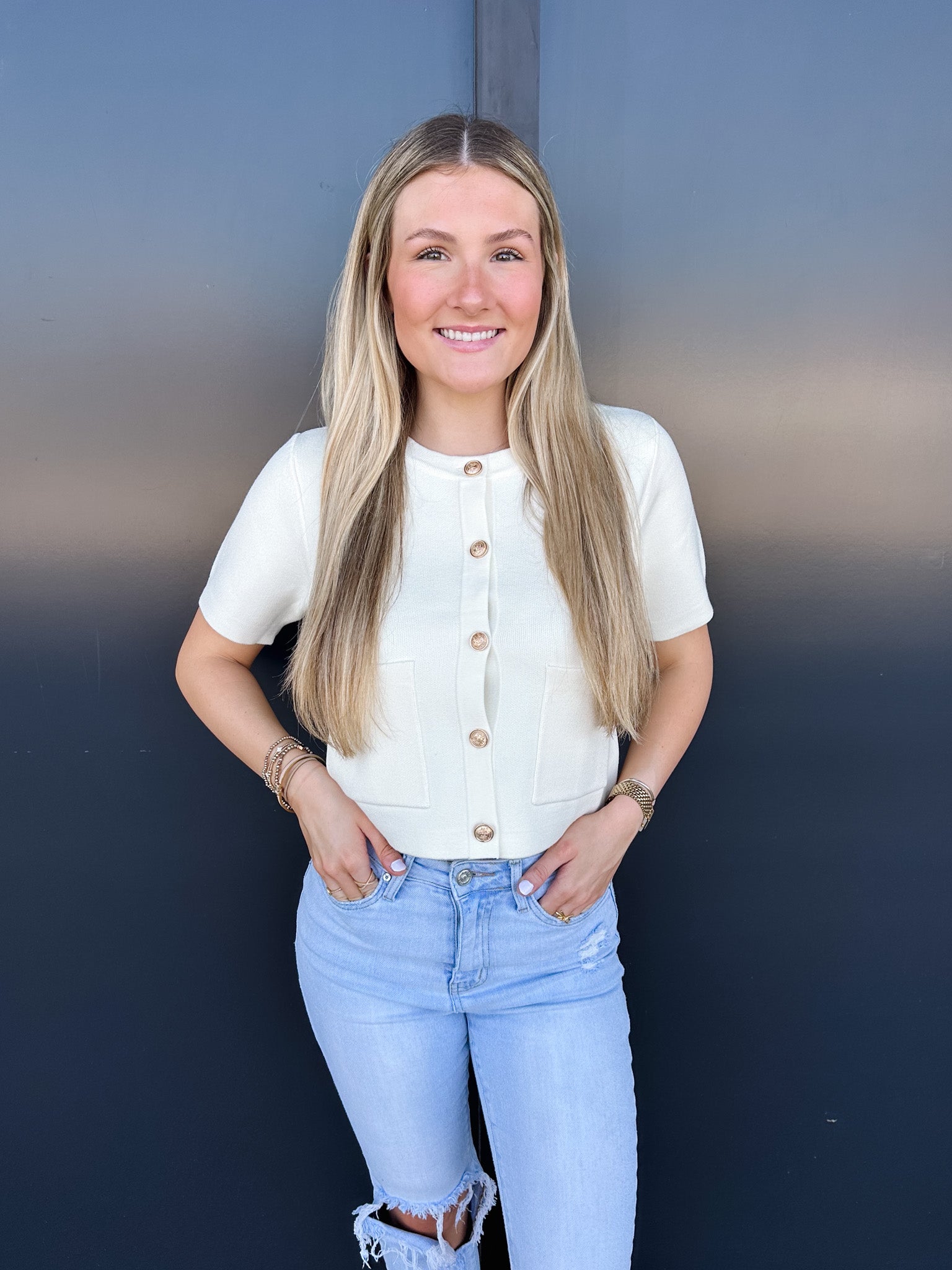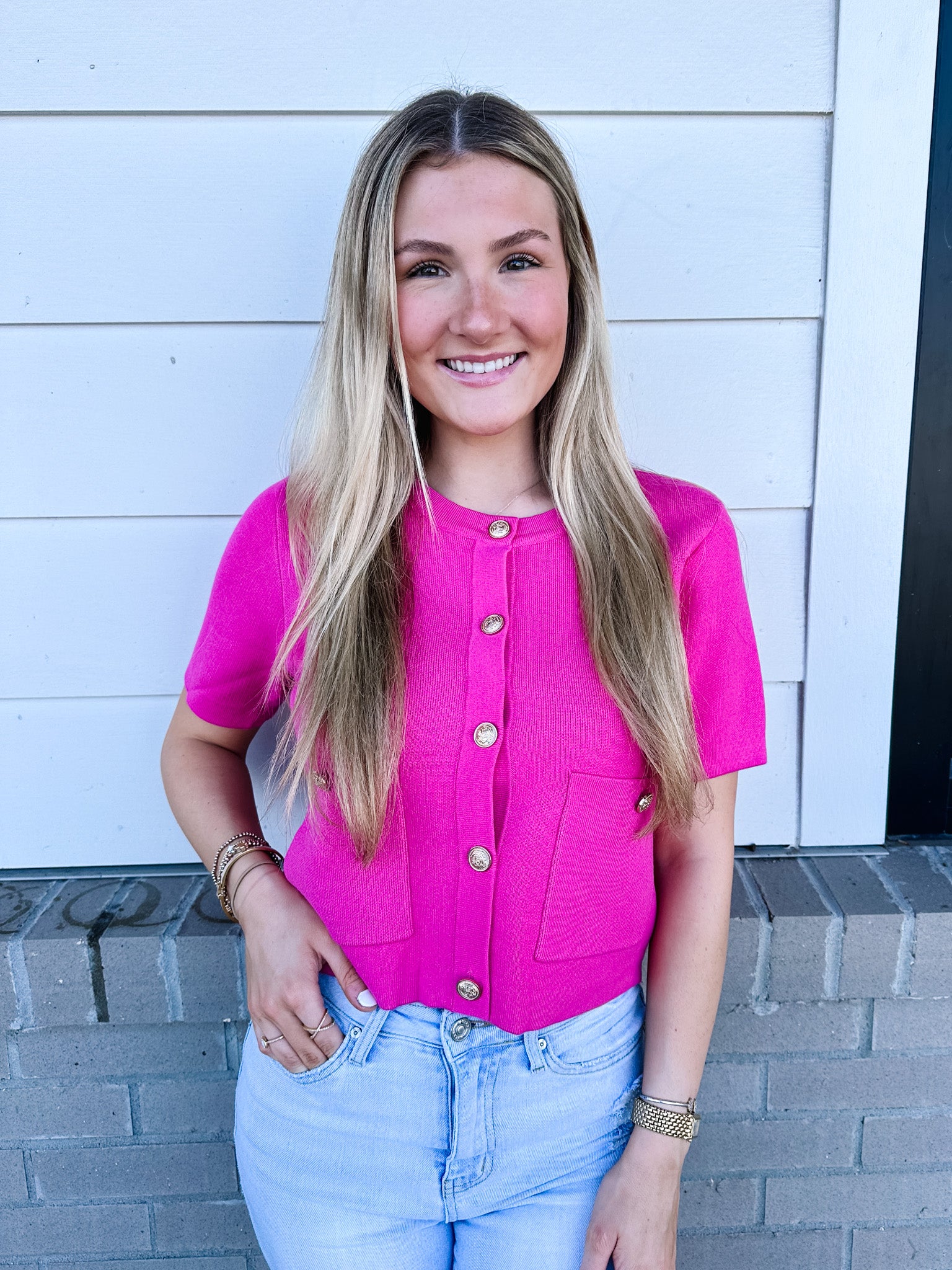 Add a touch of luxury to your wardrobe with the Entro Tina Top. This solid short sleeve sweater knit cardigan is accented with gold button front closure and features convenient patch pockets. Made from lightweight, non-sheer fabric, this unlined knit top is both chic and comfortable. Elevate your style with this exclusive piece.