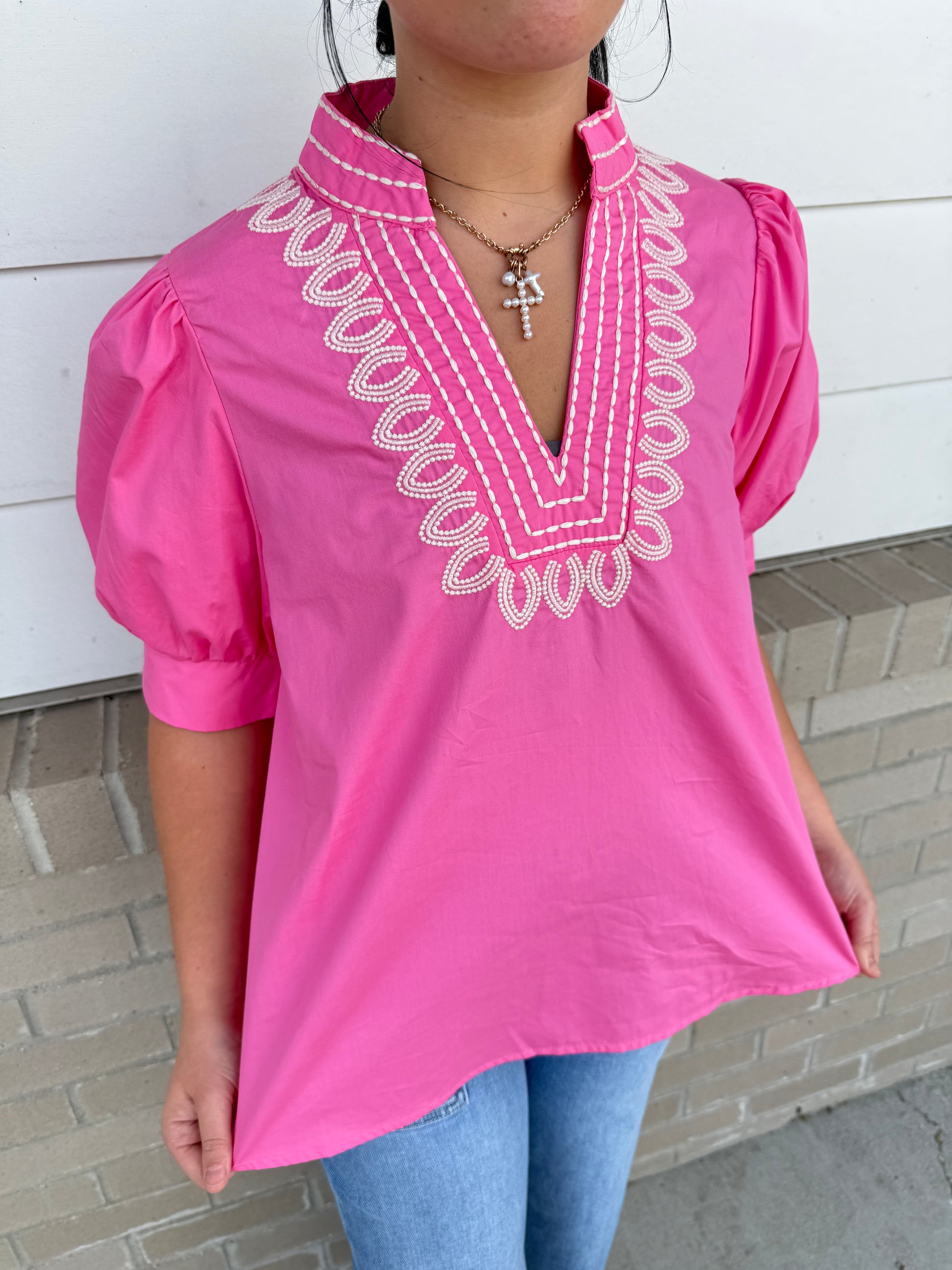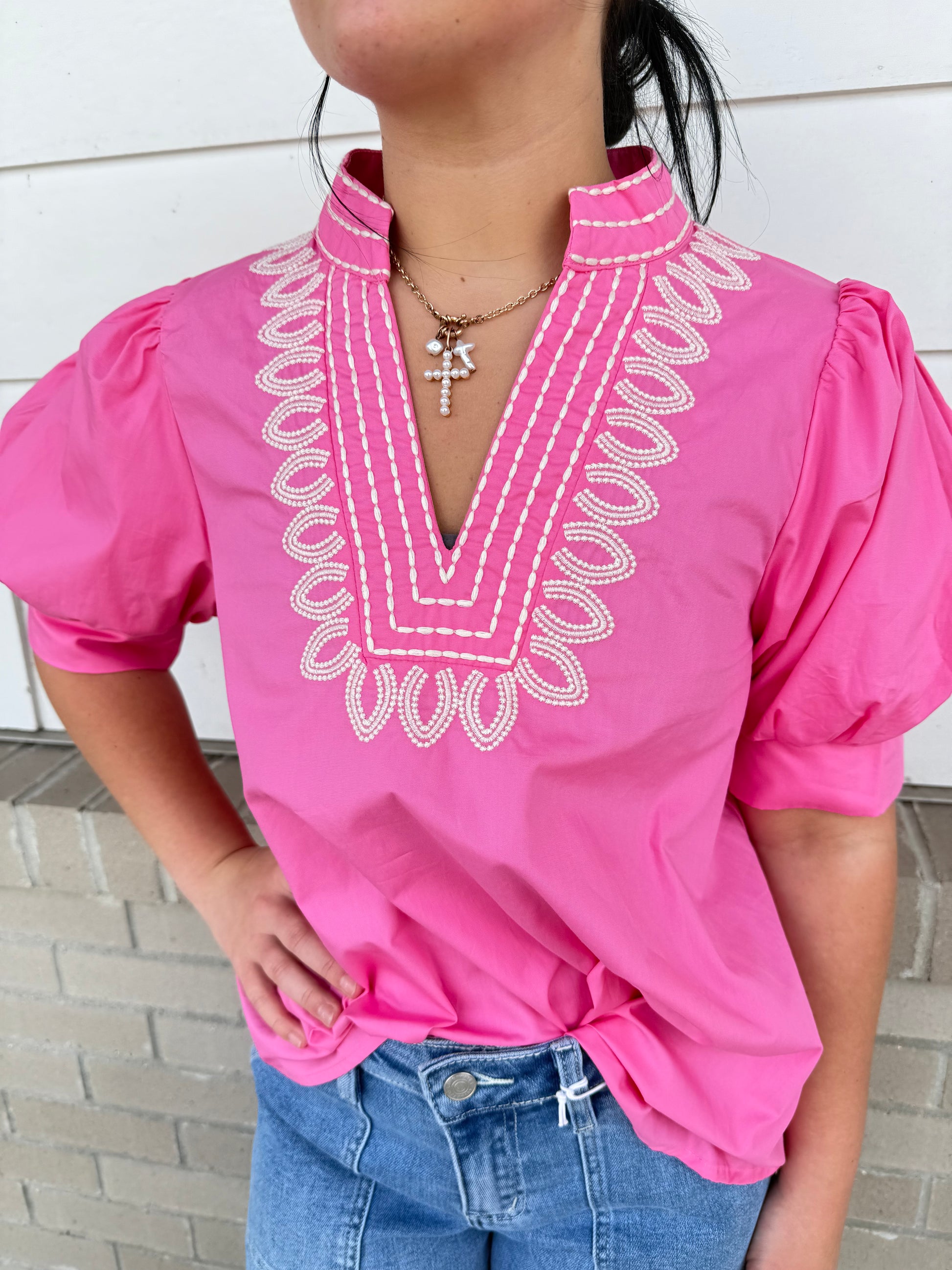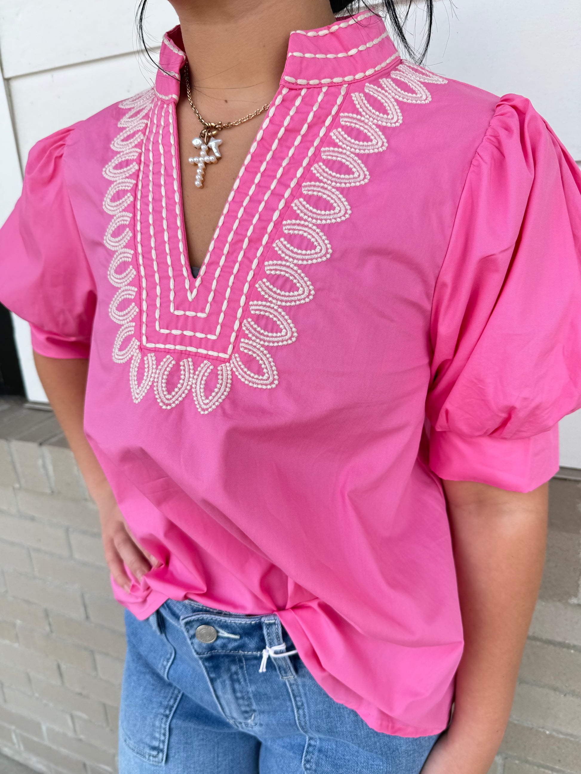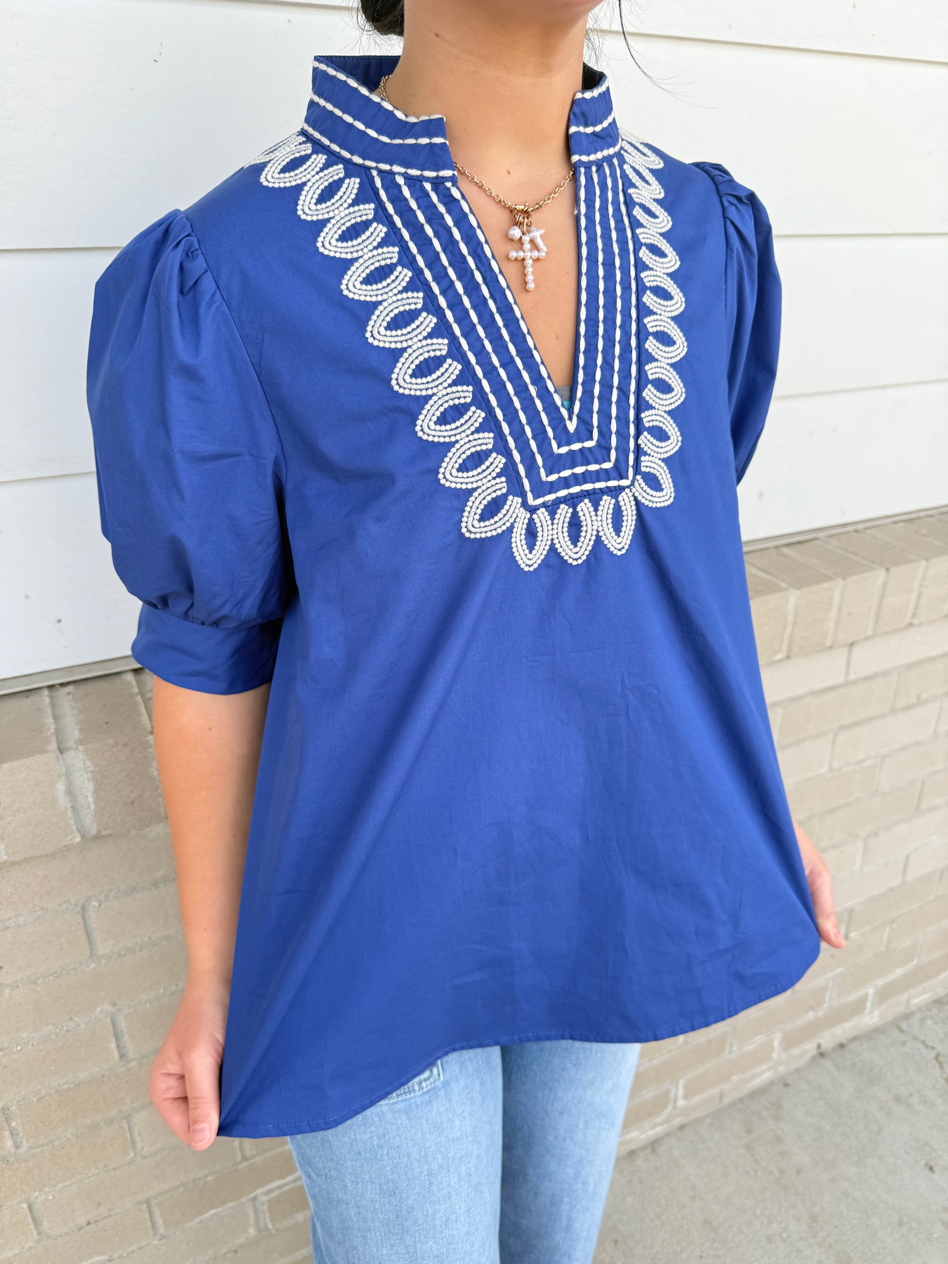 Introduce sophistication to your wardrobe with our solid cuff band pullover top. The short puff sleeves and embroidered V-neck band collar elevate this piece to a work of art. Featuring a lightweight, woven fabric that drapes gracefully, this top is perfect for any occasion. Experience luxury and exclusivity in every wear.