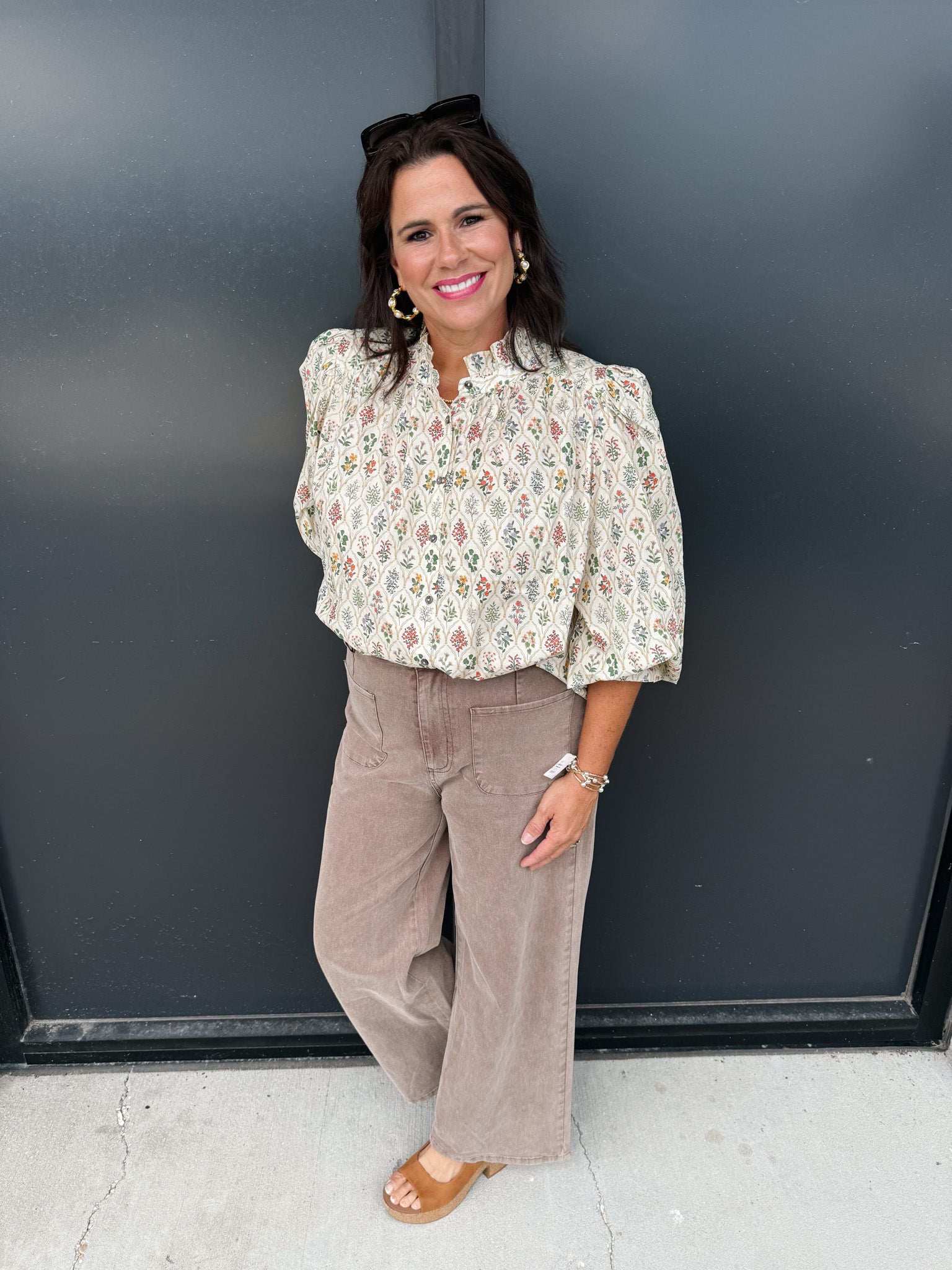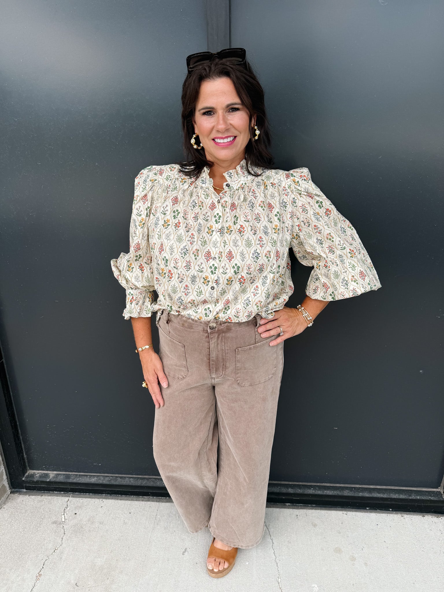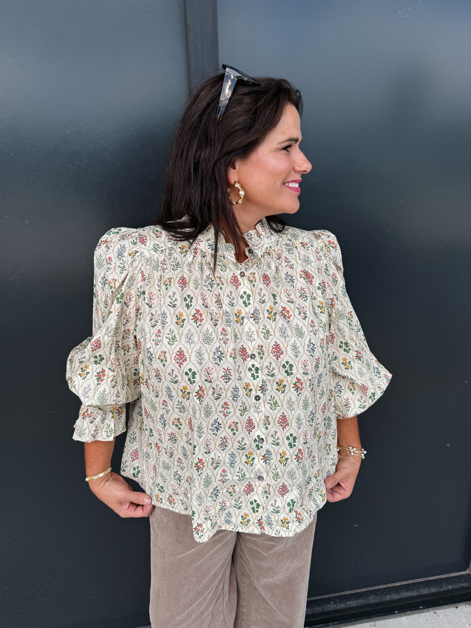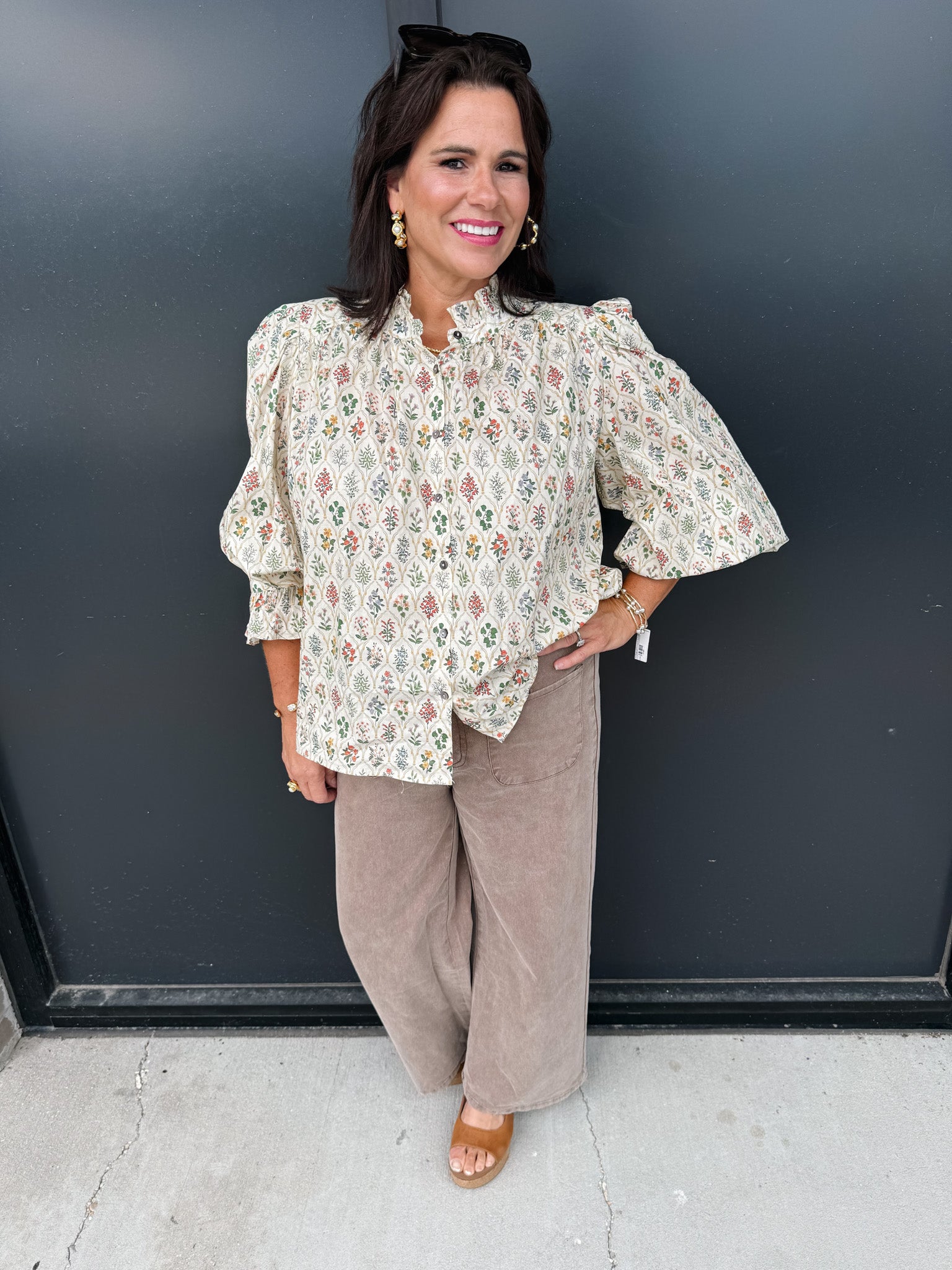 Elevate your wardrobe with the Floral Shake It Off Top, a sophisticated piece featuring a multi-floral print and elegant puff sleeves. The ruffle band collar and sleeve finishes add refined detail, while the lightweight woven fabric ensures comfort without sheerness. Unlined for a natural drape, this top blends classic charm with modern style effortlessly.