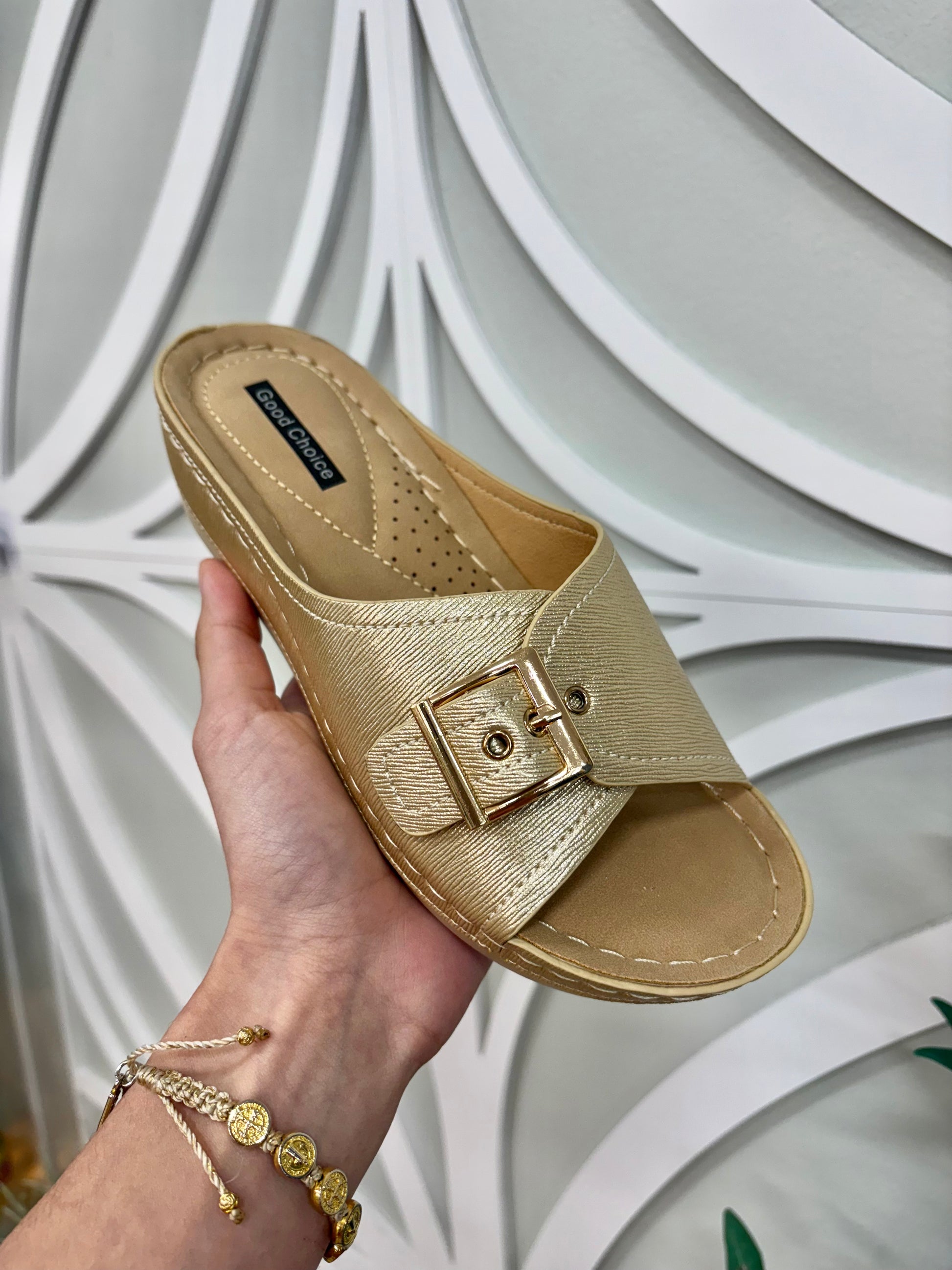 Elevate your style with the GC Justina Gold Sandals. These wedge sandals offer both comfort and style with adjustable buckle detail and a cushioned footbed that will support your feet all day. The faux leather upper and slip-on closure add an elegant touch. Perfect for any occasion.
