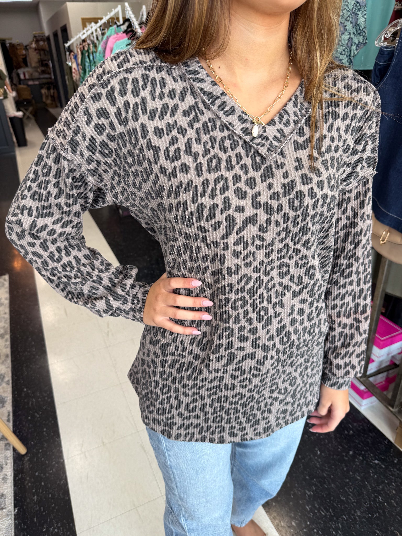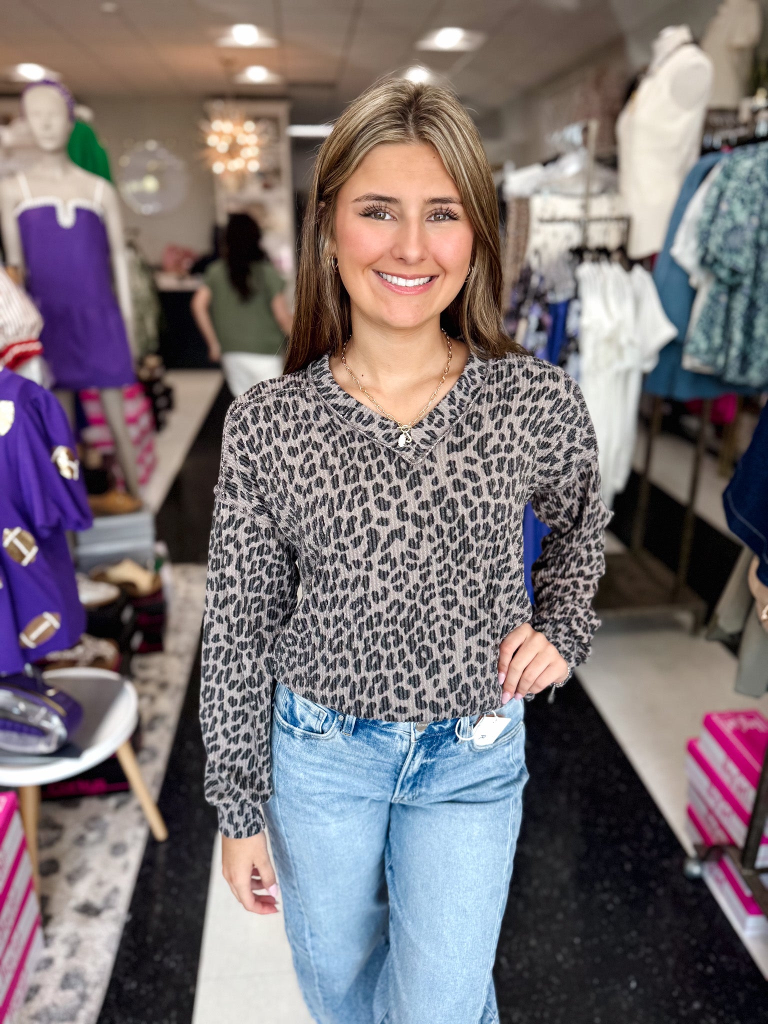 Elevate your wardrobe with this Long Puff Sleeve V-Neck Animal Urban Rib Top. Featuring a flattering V-neckline and voluminous puff sleeves, this top combines modern urban style with a subtle animal print for a refined yet edgy look. The ribbed fabric offers a comfortable, form-fitting silhouette that enhances your natural shape, making it perfect for both day and evening wear.