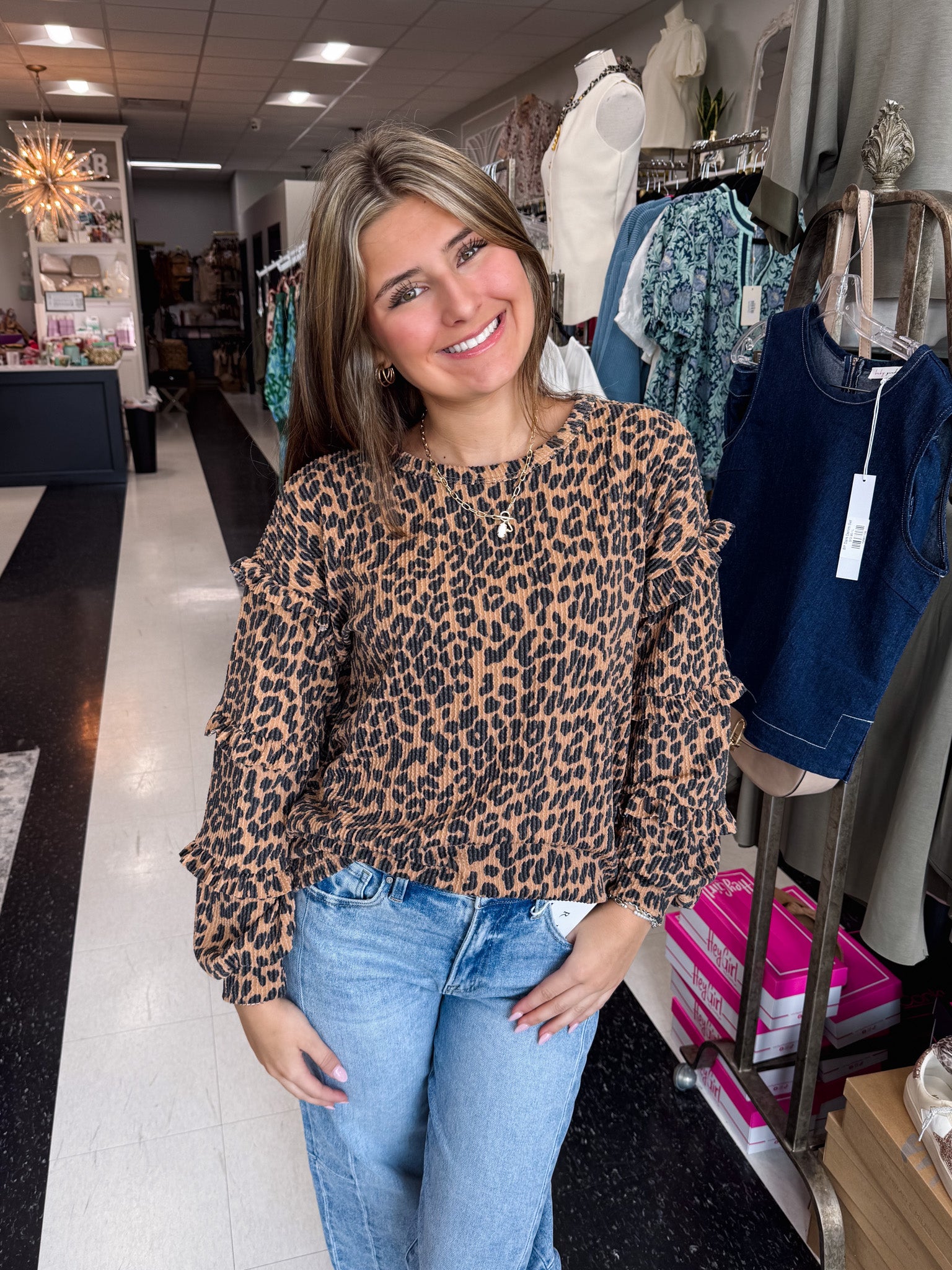 Elevate your wardrobe with the HM Wild Intentions Top, featuring a refined round neck and long sleeves adorned with layered ruffle details. Crafted from urban rib fabric, this top combines subtle animal-inspired patterns with a sophisticated silhouette, perfect for making a stylish statement in any setting.