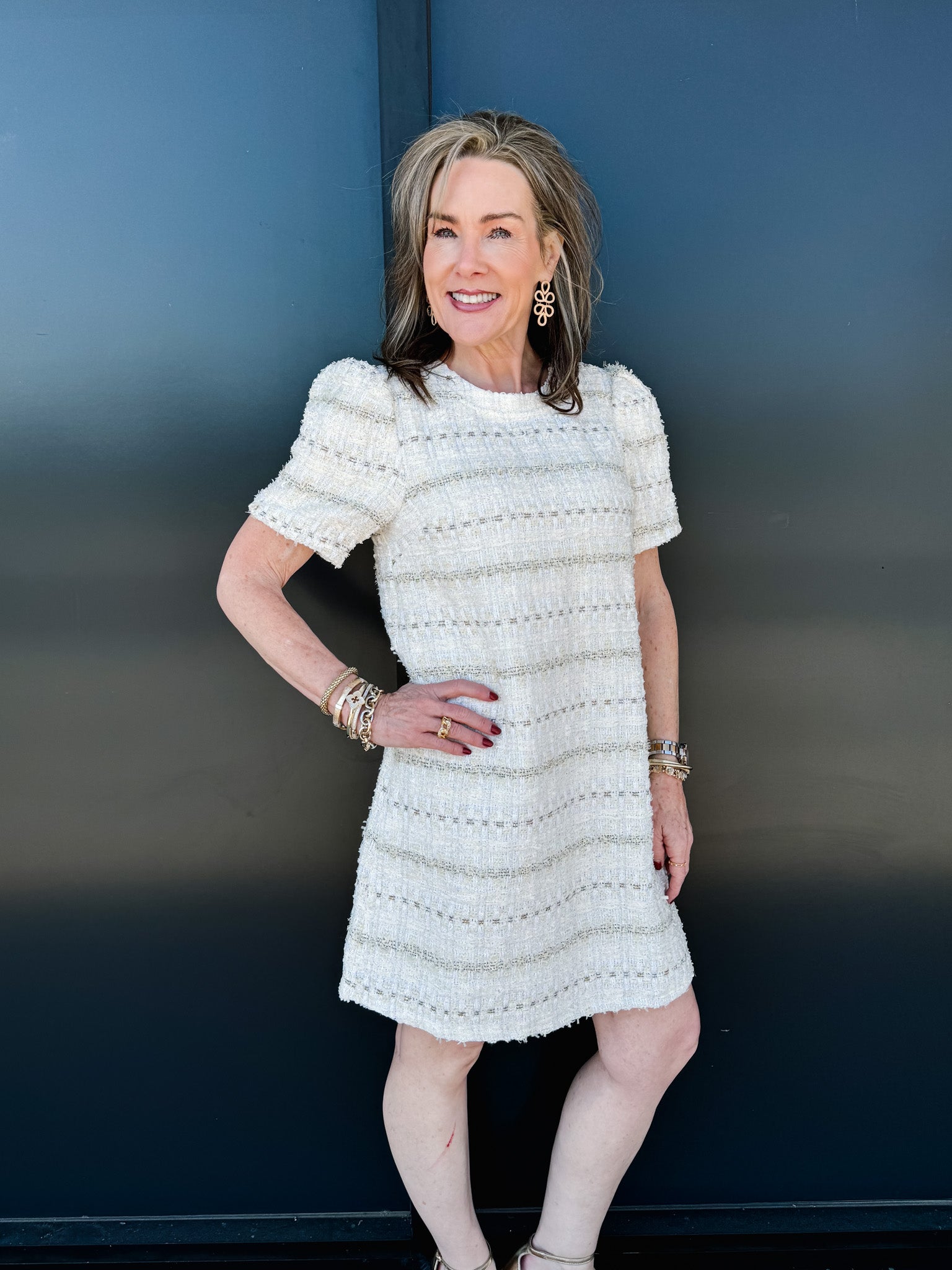 Indulge in refined elegance with our Jackie Tweed dress. Crafted from the finest tweed, this dress boasts round necklines, a back zipper closure, and short sleeves for a timeless and sophisticated look. Perfect for any occasion, it's a must-have for every luxury wardrobe.