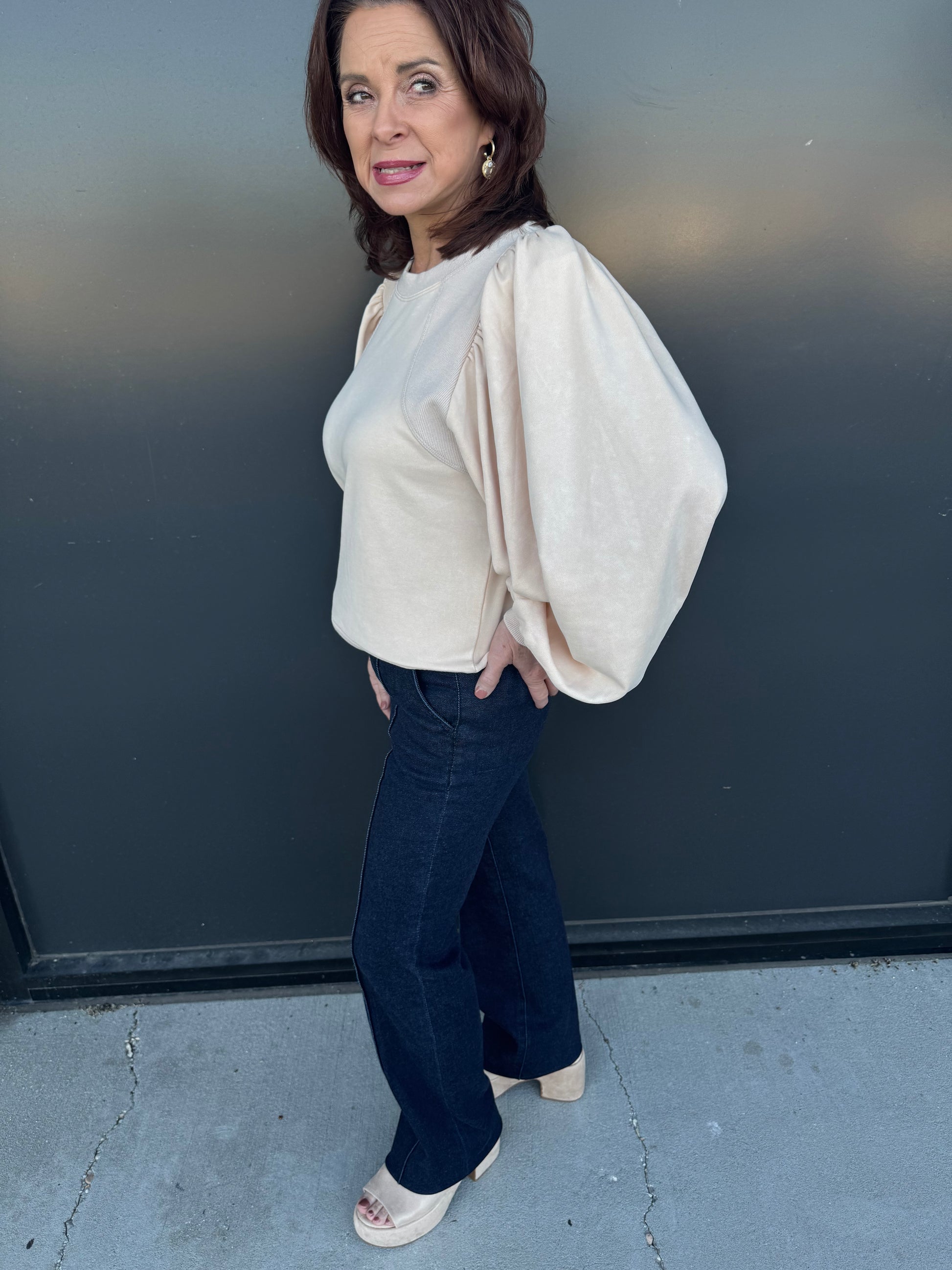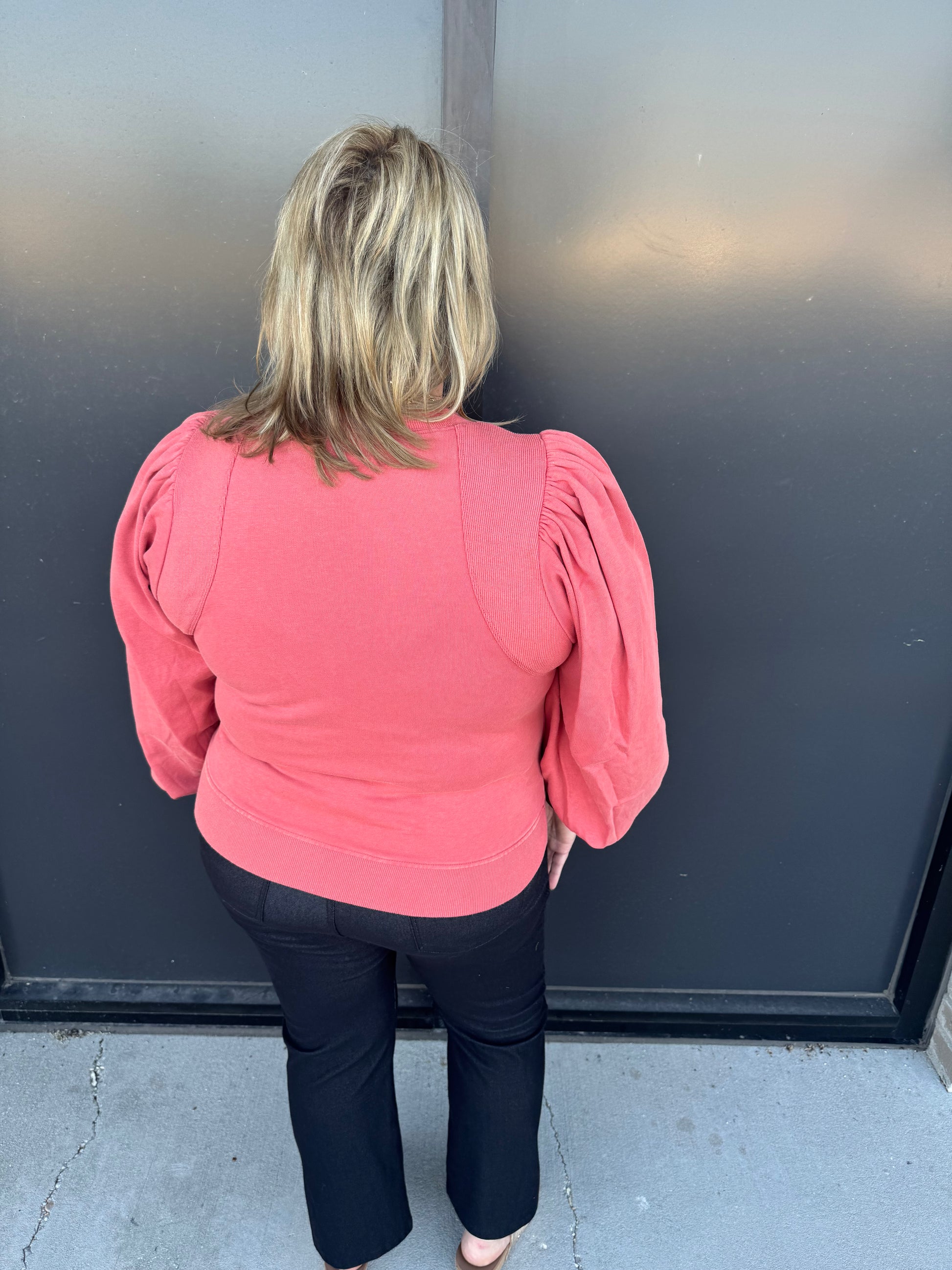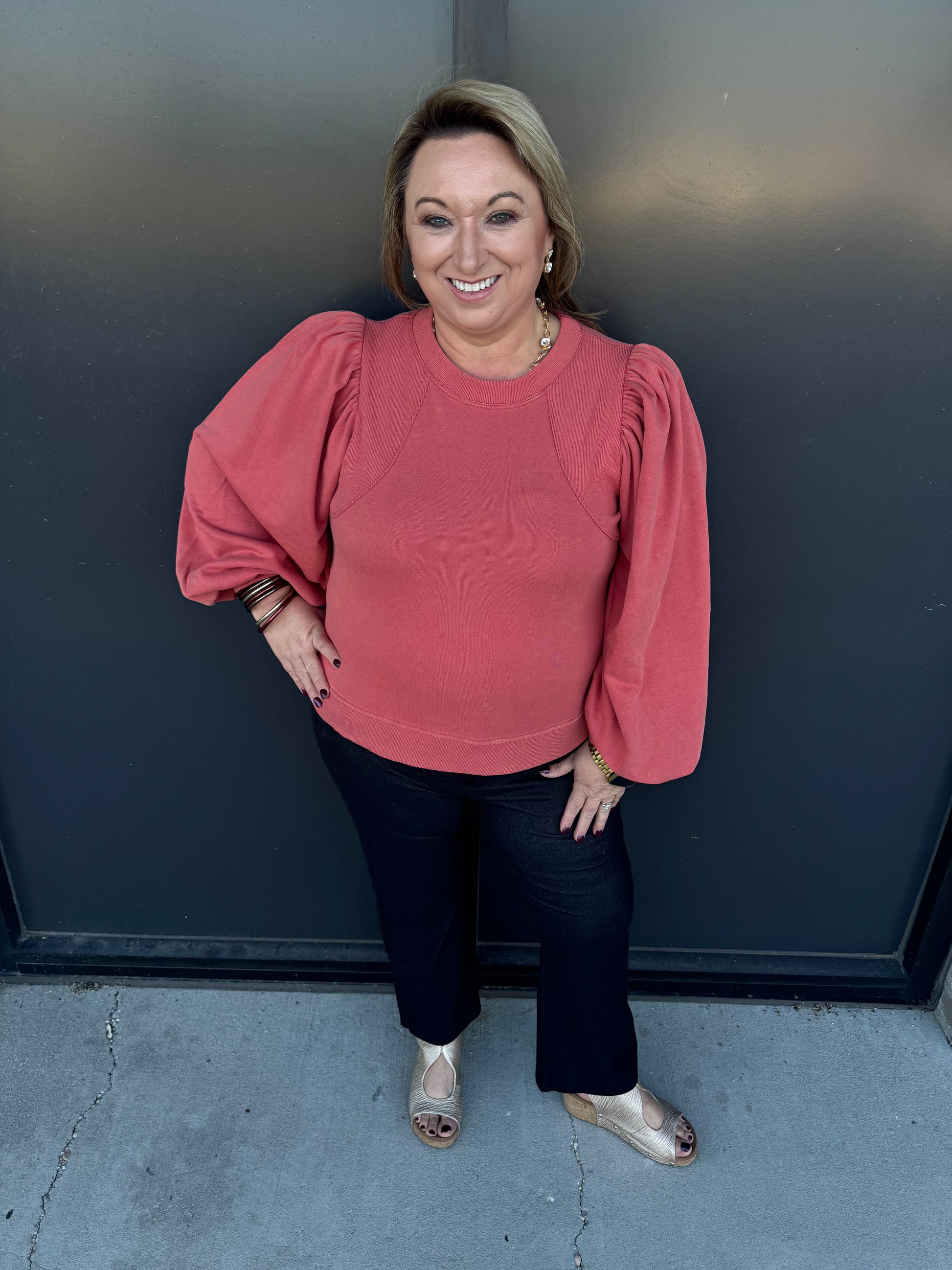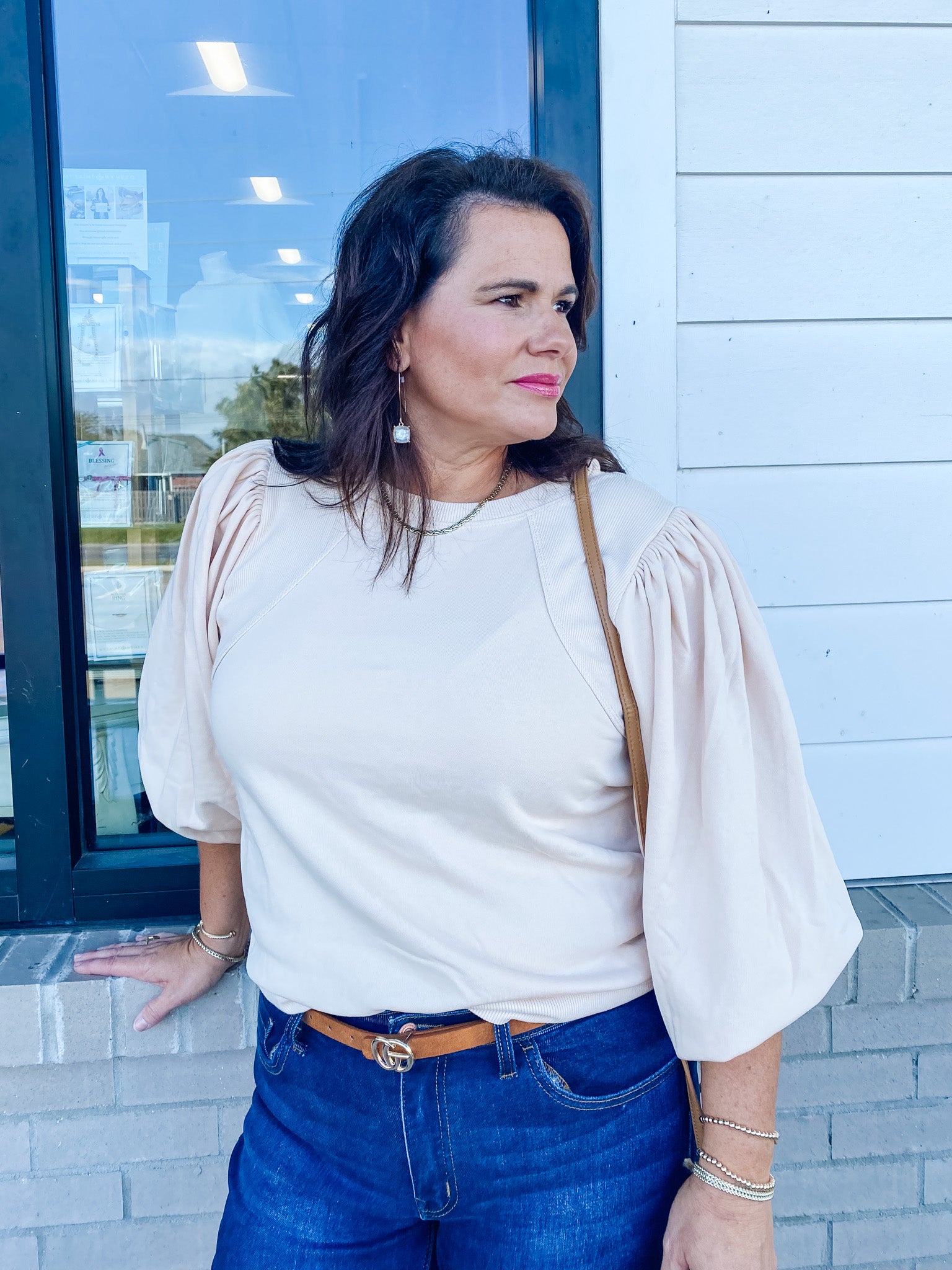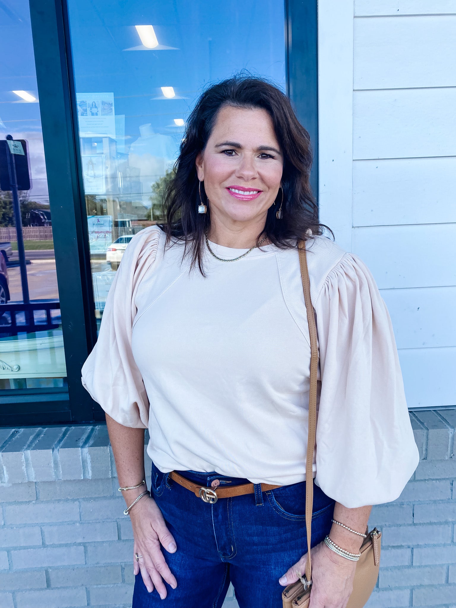 Indulge in luxury with the Jodifl Elise Top. Crafted from soft sweatshirt material, this top features elegant puff sleeves that add a touch of sophistication. The long sleeves provide both coverage and style, making it the perfect choice for a chic and comfortable look.