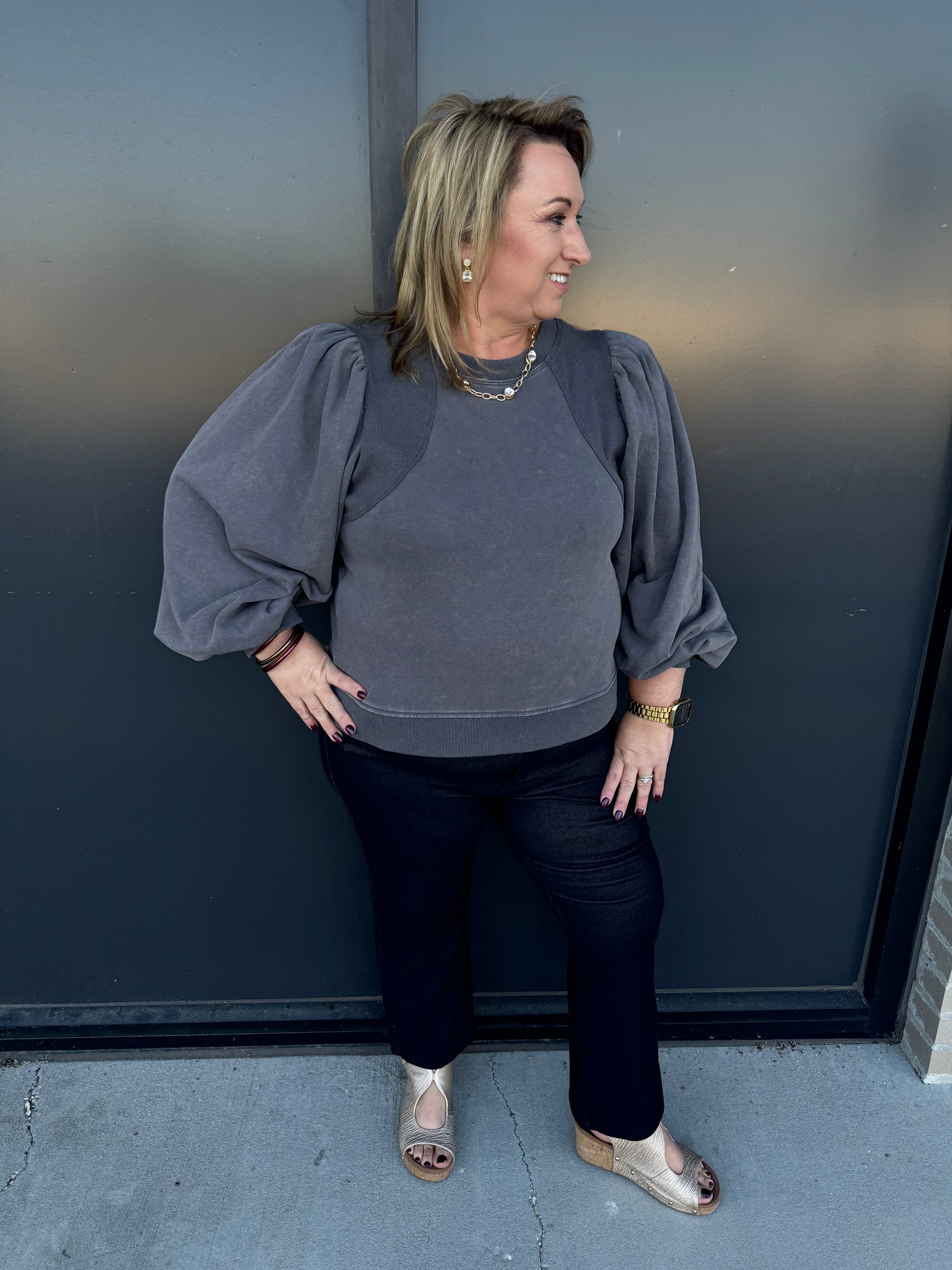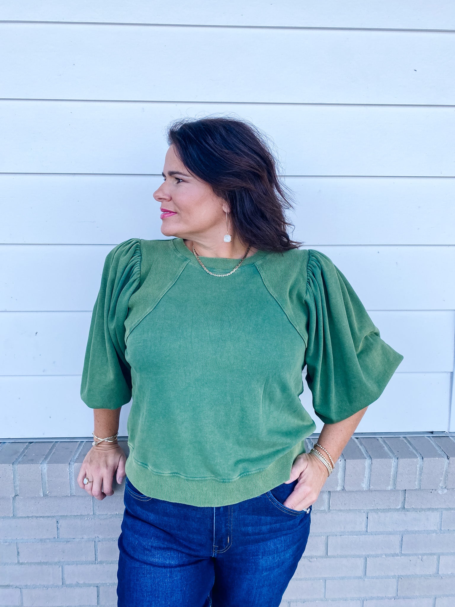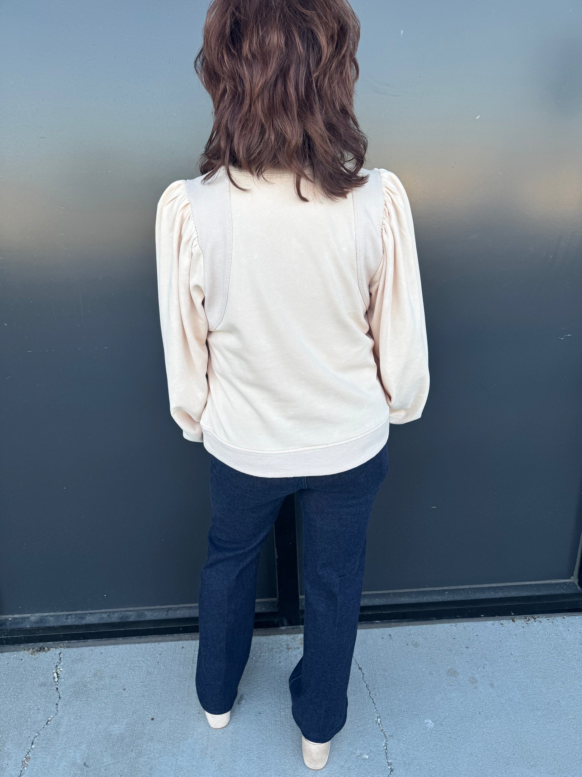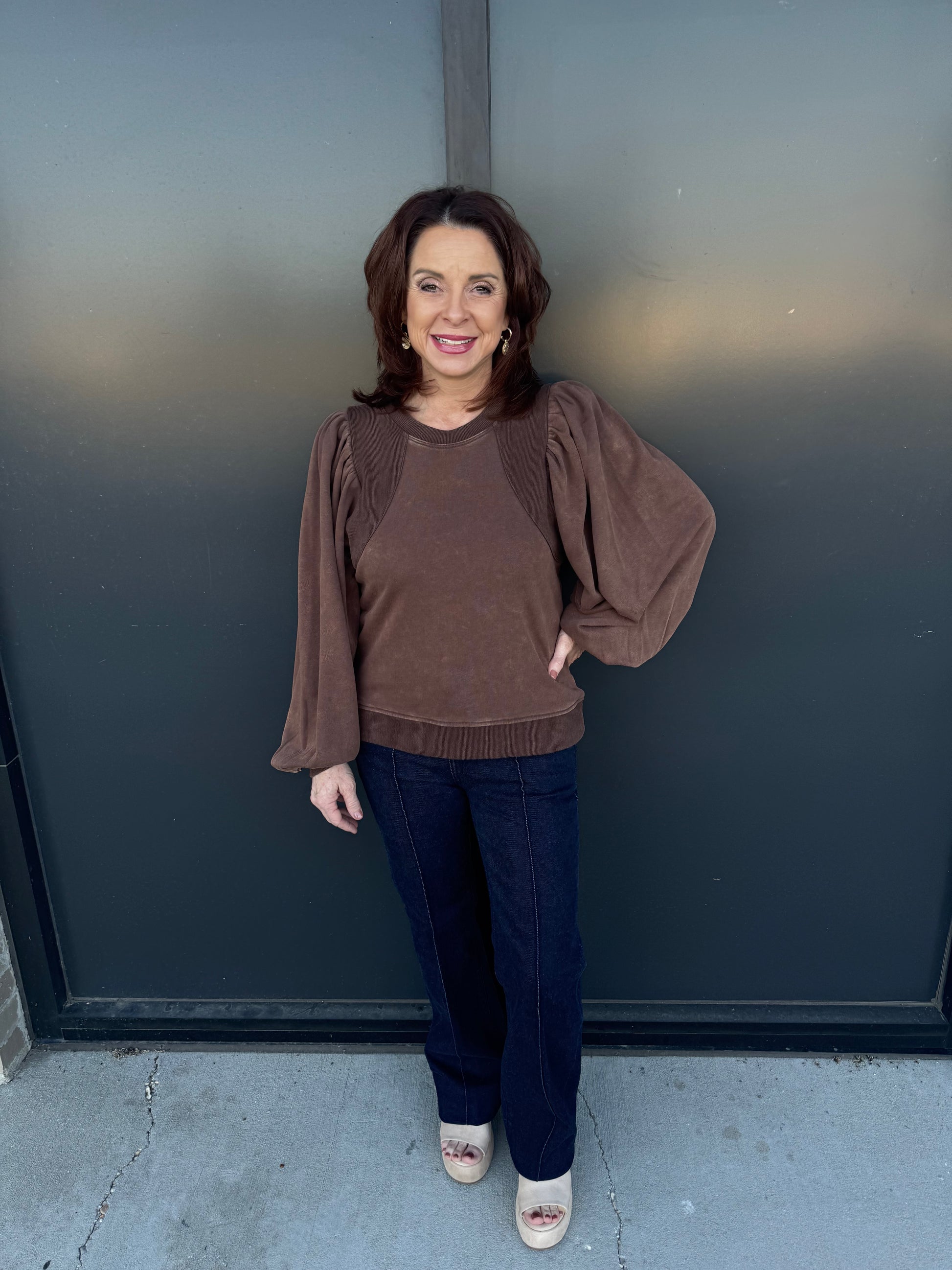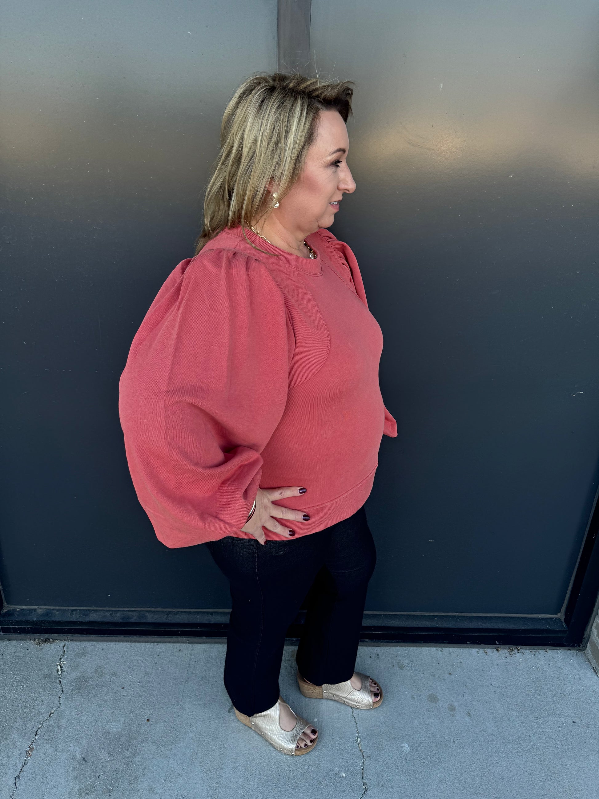 Indulge in luxury with the Jodifl Elise Top. Crafted from soft sweatshirt material, this top features elegant puff sleeves that add a touch of sophistication. The long sleeves provide both coverage and style, making it the perfect choice for a chic and comfortable look.