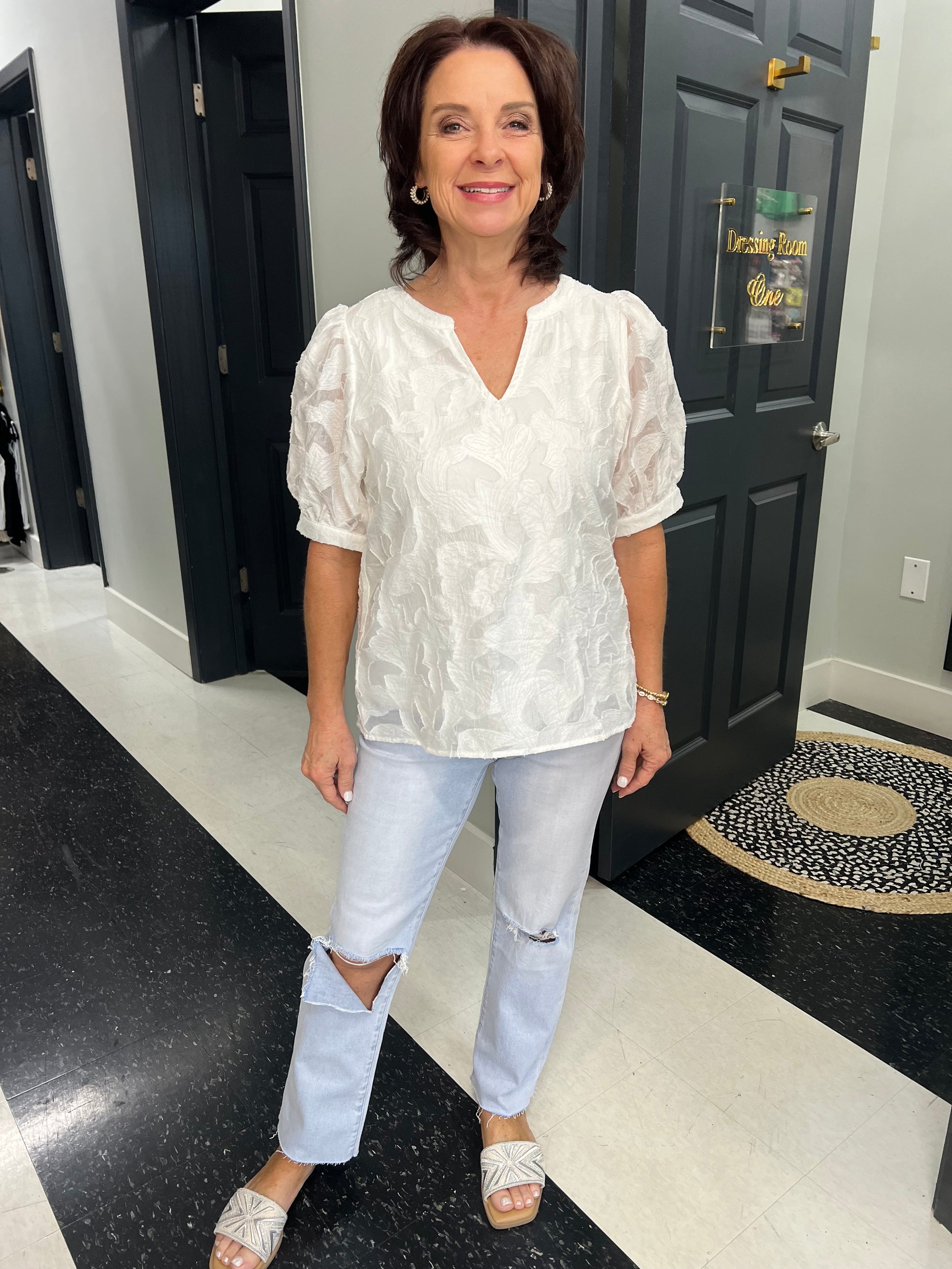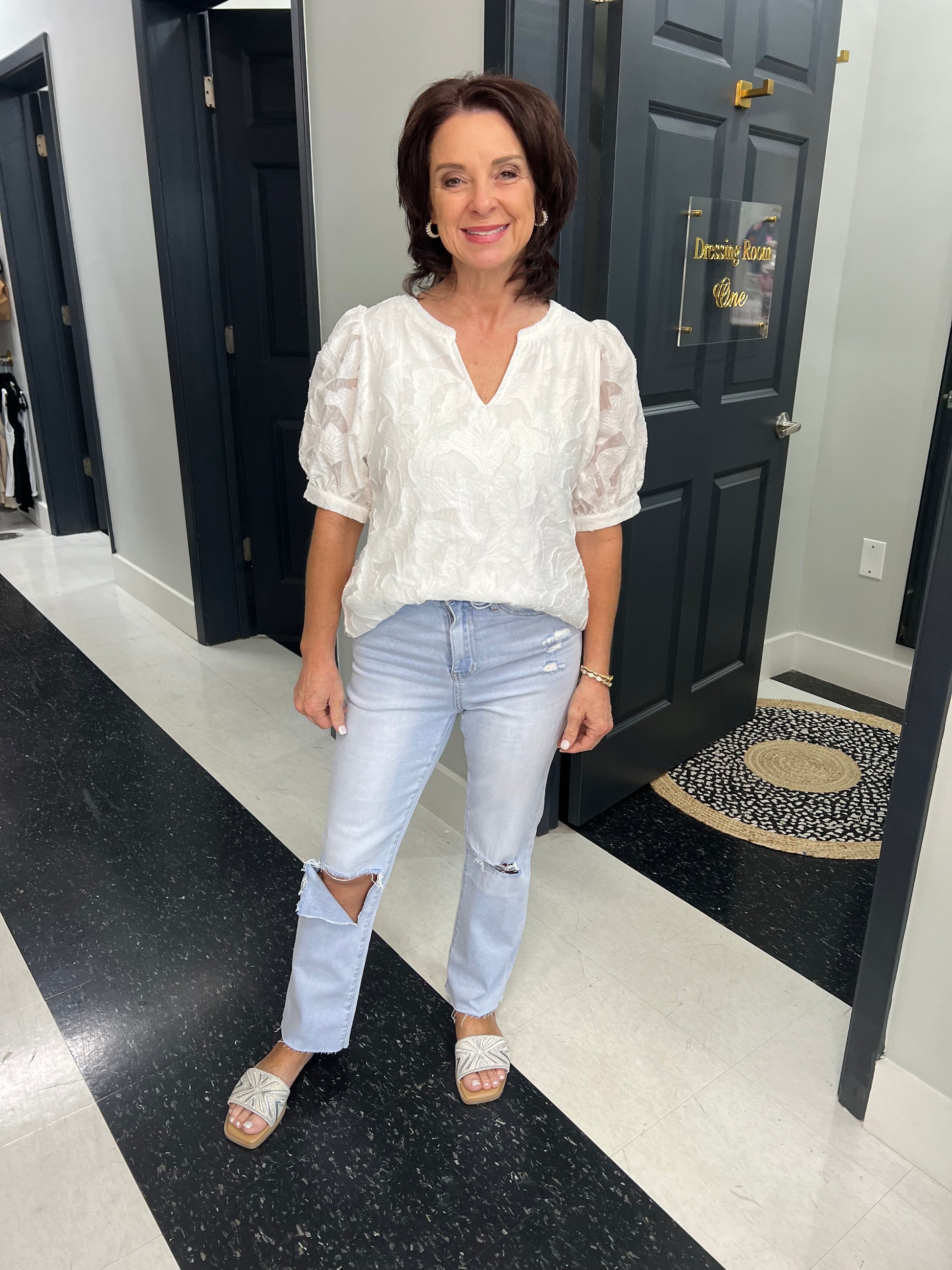 Add a touch of whimsy to your wardrobe with the Jodifl Mary Top! The white textured fabric brings subtle elegance, while the v-neck and puff sleeves add a playful twist. This top is perfect for any occasion, from brunch to a night out. (Just don't be surprised if you get complimented on it all day!)