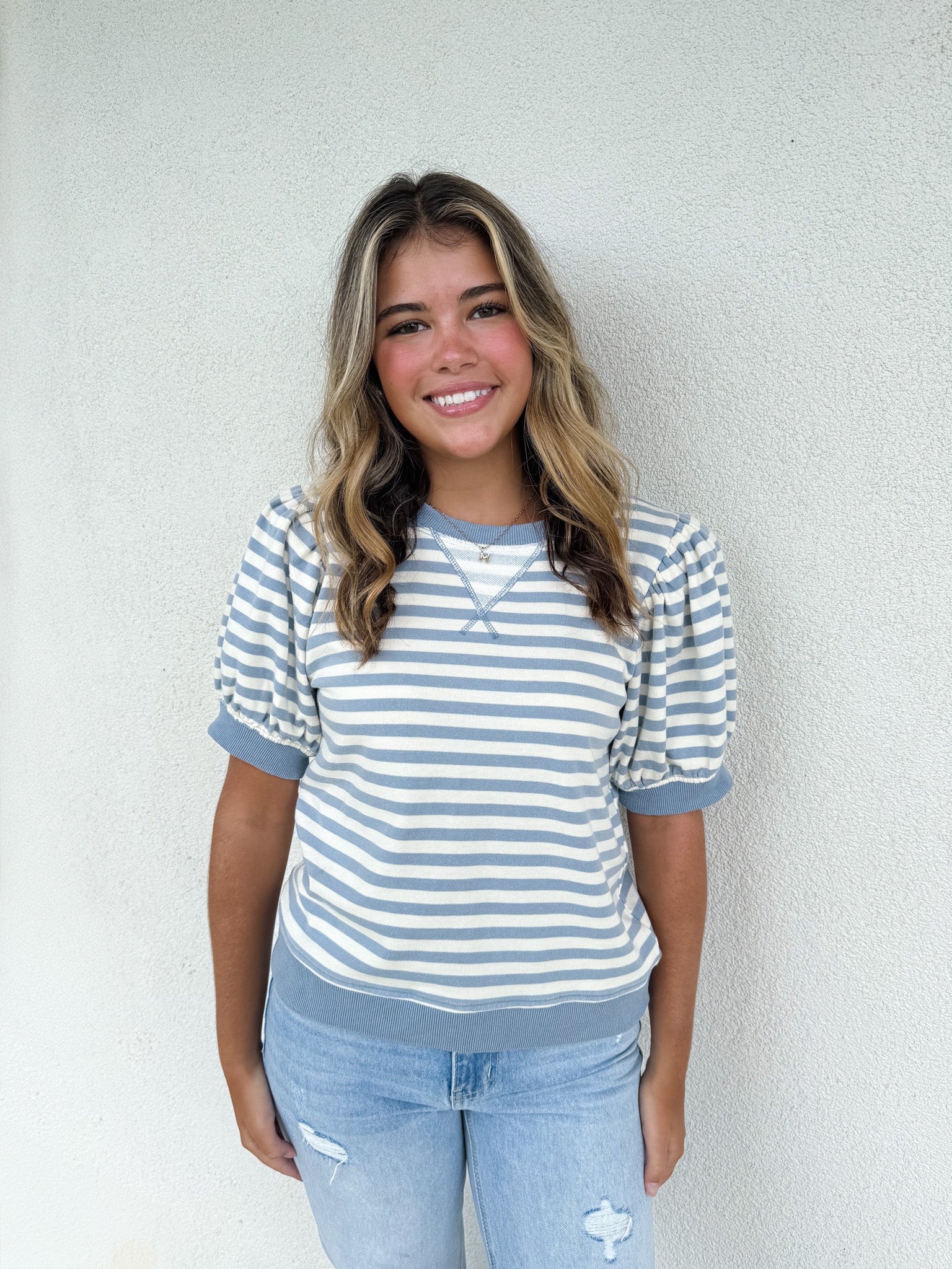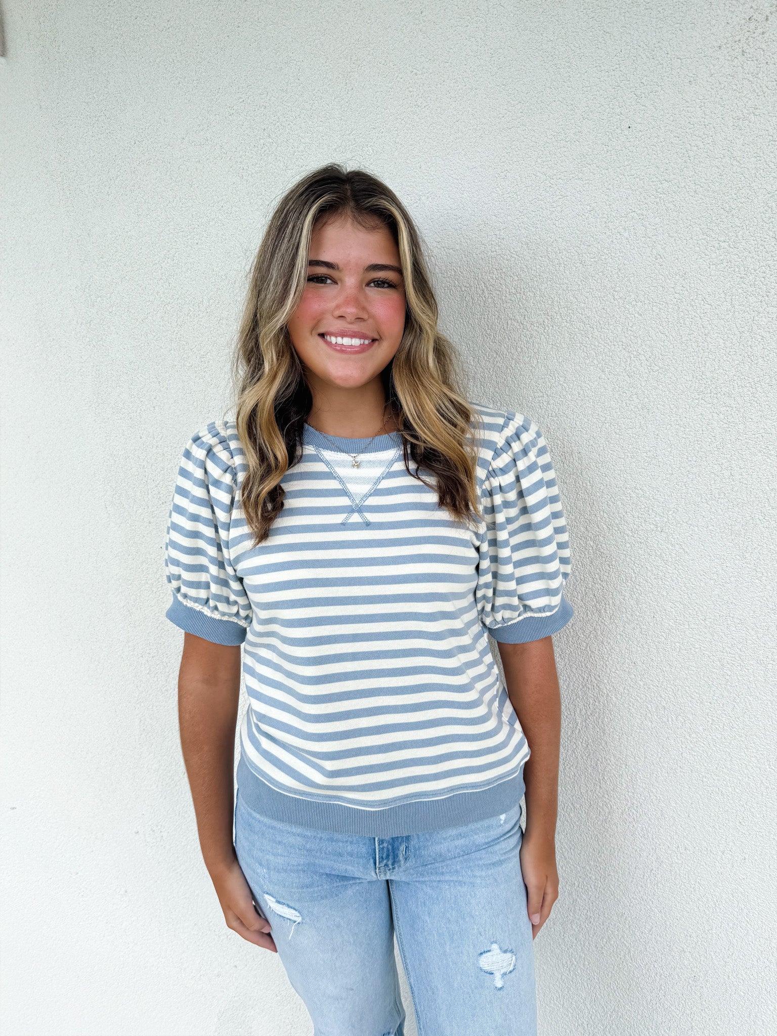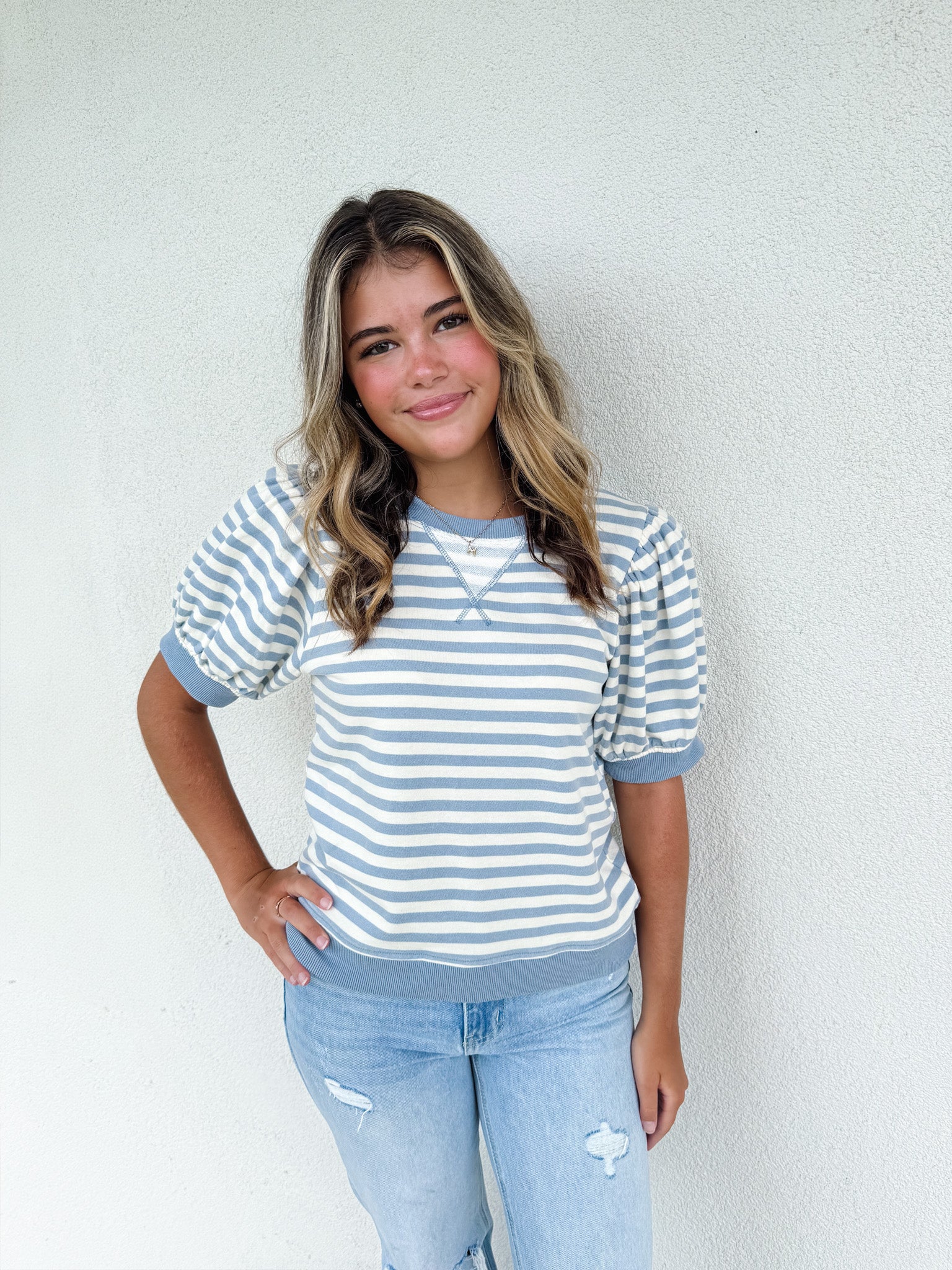 The Jodifl Salor Top features playful stripes and a thicker fabric that adds cozy comfort. Its slight puff sleeves with elastic arms create a fun, flirty silhouette perfect for brightening up any outfit.