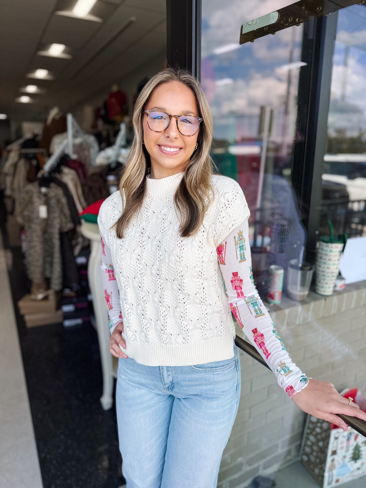 Make a refined holiday statement with the Keigan Mesh Top — a sophisticated blend of festive charm and modern elegance. Featuring a beautifully detailed nutcracker design set against a crisp white backdrop, this piece brings subtle artistry to seasonal dressing. The lightweight mesh overlay adds texture and depth, creating a polished yet playful look that stands out in any setting. Crafted from a premium blend of 95% polyester and 5% spandex, it offers the perfect balance of structure, stretch, and comfort for all-day wear. Available in sizes Small through XL, this top transitions seamlessly from festive gatherings to chic casual moments.