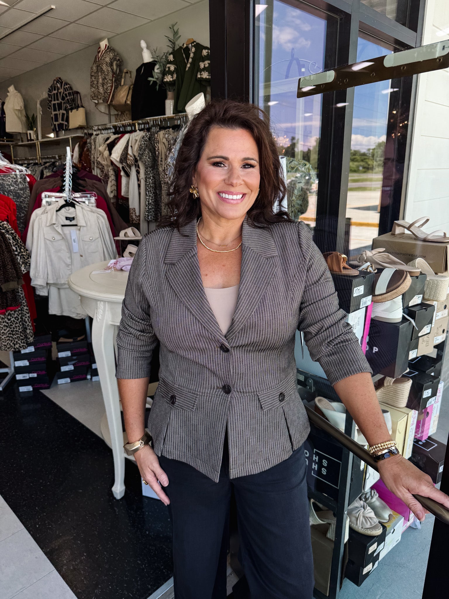 In a refined camel sand stripe, this blazer is tailored with a peplum silhouette that creates a flattering, feminine shape. The box-pleated hem adds subtle movement, while the polished design makes it easy to style from desk to dinner. A modern statement piece that elevates any look.
