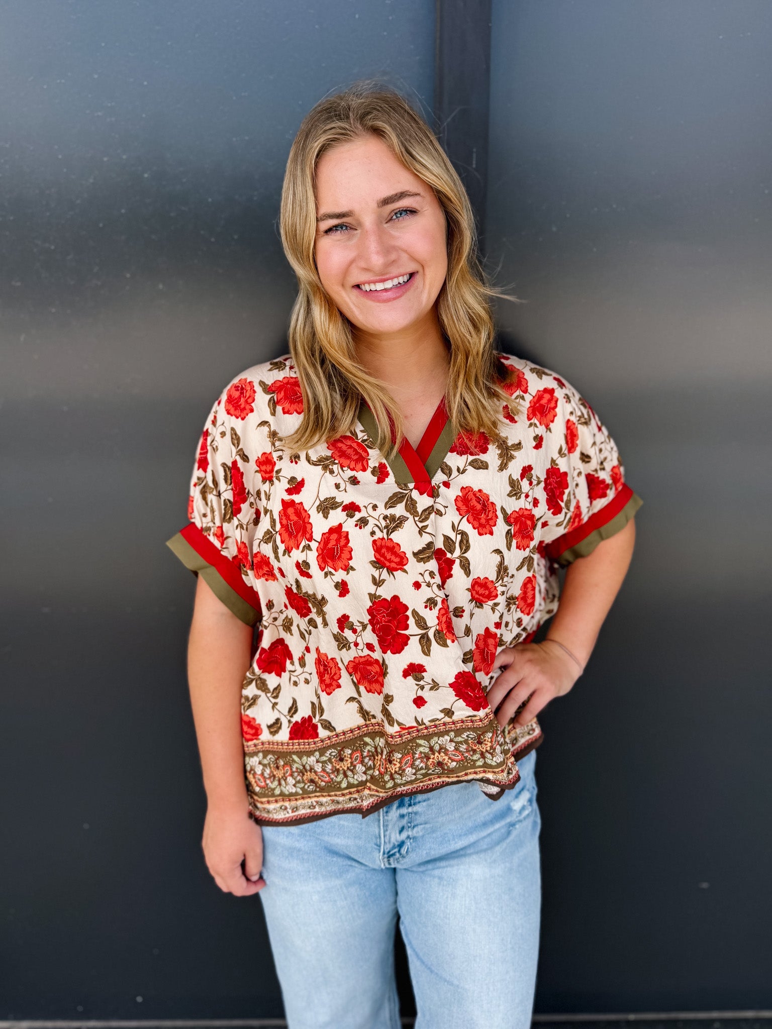 The Meadow Whisper Top blends delicate floral prints with a refined silhouette, featuring a contrasting V-neck and hem panel for subtle visual interest. Crafted from lightweight, woven fabric, this unlined top offers comfortable wear without transparency, making it an elegant choice for warm days or layered looks. Its short sleeves and sophisticated design ensure effortless style with a graceful touch.