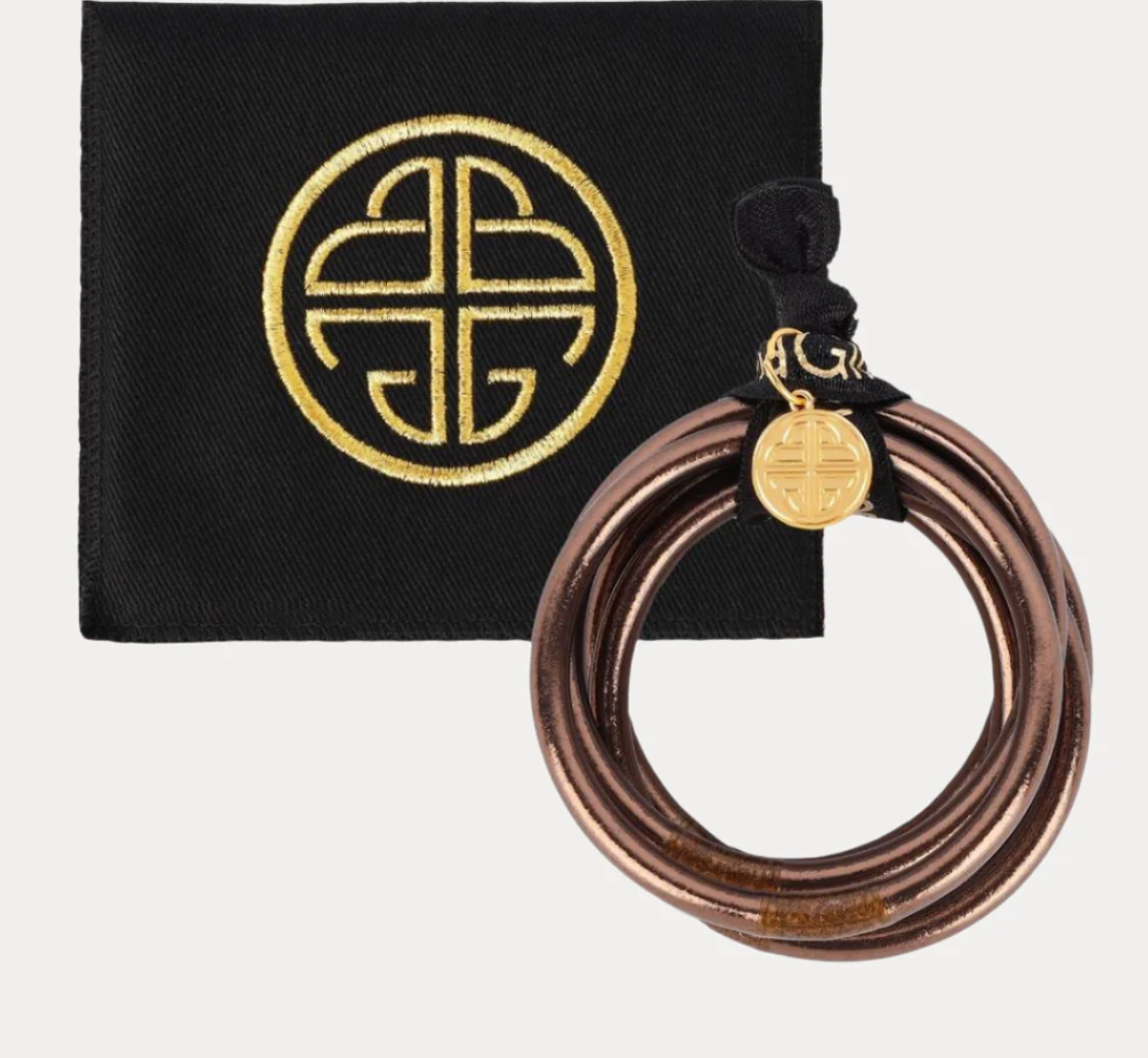 BuDhaGirl Meteorite All Weather Bangles® (AWB®), are the epitome of luxury in BuDhaGirl's impressive lifestyle collection. Meteorite captures the beauty of the galaxies with its ultra-rich infused bronze hue. Our remarkable bangles redefine elegance with their weightless, soundless, waterproof, and TSA-proof design. Crafted to perfection, each set comprises six bangles, symbolizing intentions for the day. Wear them anywhere, as their soundless and waterproof nature ensures seamless integration into any setting.