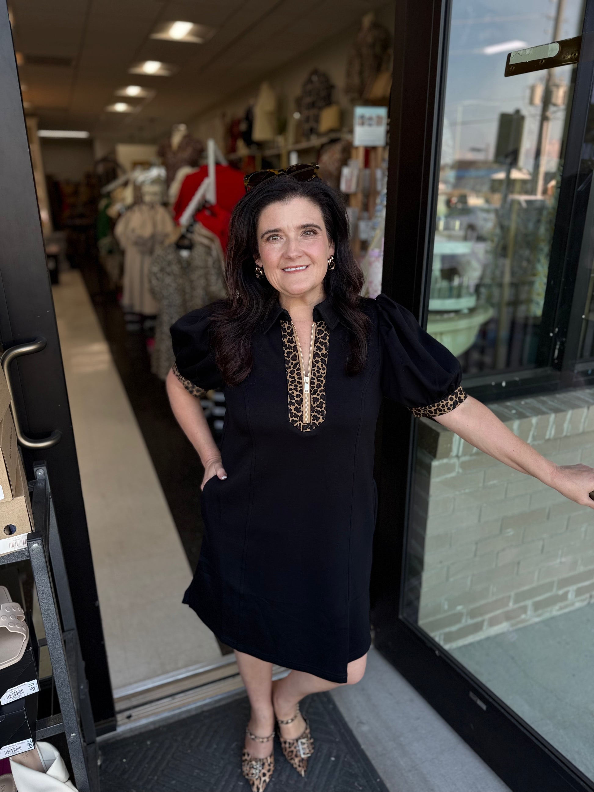 This elegant mini dress combines a sleek solid knit fabric with distinctive leopard print trim along the collar, adding a refined yet playful touch. Featuring short puff sleeves and a front zipper for effortless wear, it includes convenient side pockets and is unlined for a lightweight, comfortable fit. Its non-sheer construction ensures modesty while maintaining breathability, making it a sophisticated choice for both casual and dressier occasions.