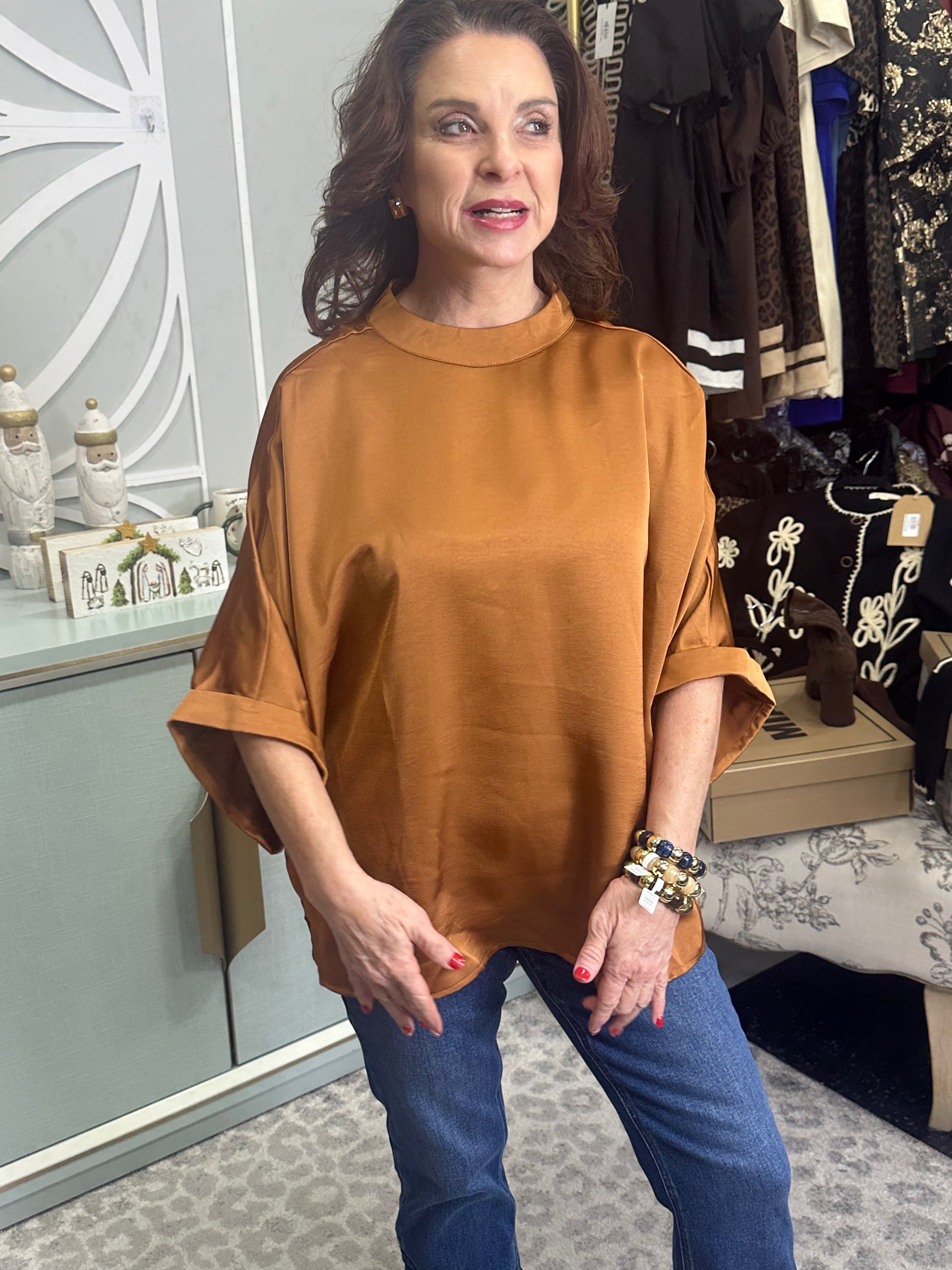 Stay chic and comfortable in this mock neck oversized top, crafted from lightweight 100% polyester for a smooth, easy drape. The relaxed silhouette offers a modern, laid-back feel while the mock neckline adds a touch of refined structure—perfect for everyday wear, work looks, or layered seasonal outfits.