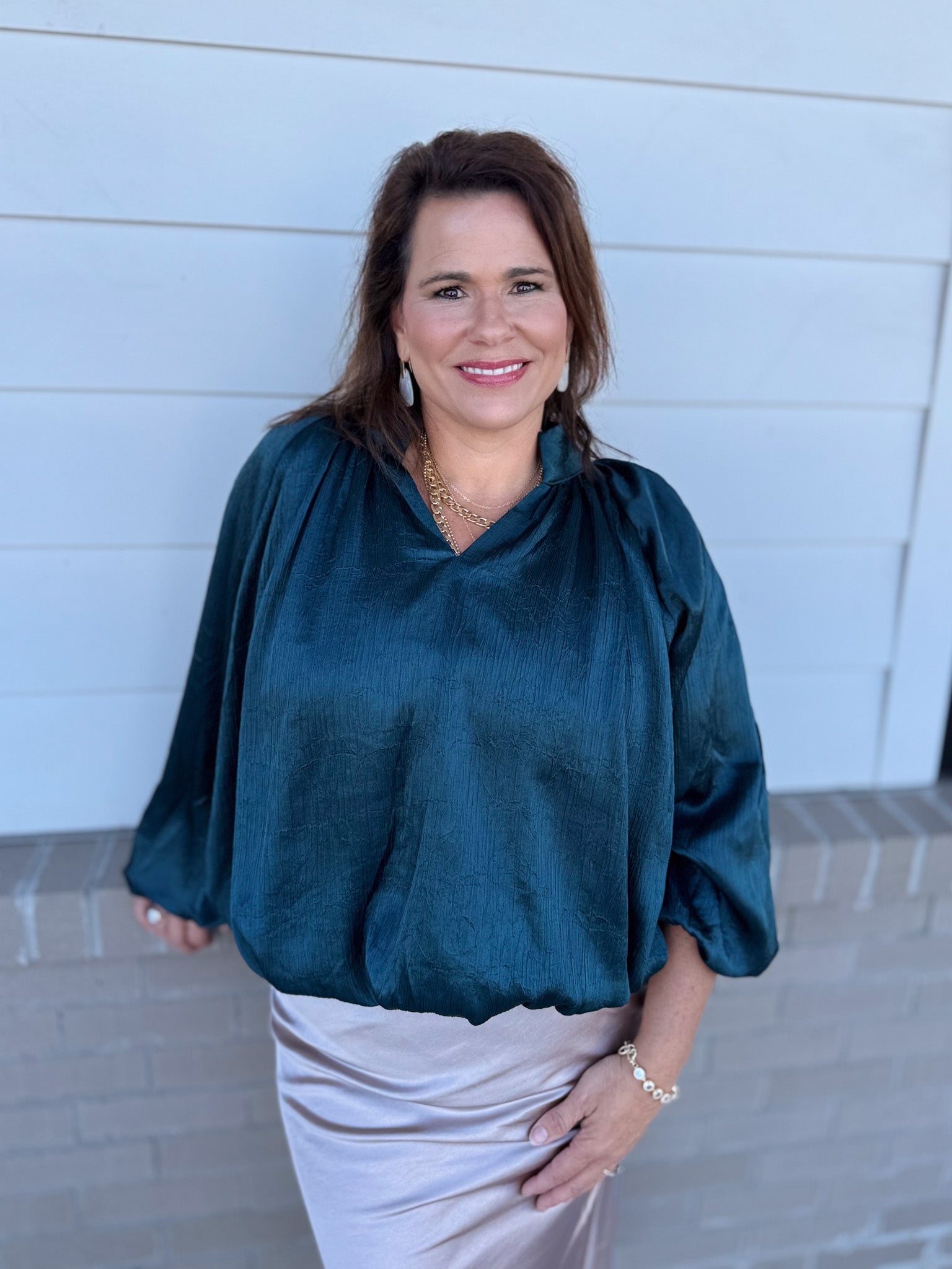 Designed with graceful bubble sleeves, this blouse brings a soft, voluminous touch that enhances the natural femininity of the silhouette. The tailored body creates a polished shape that flatters every figure, while the gathered sleeves lend just the right amount of drama. Whether styled under a structured blazer for work or paired with statement jewelry for a night out, the Eloise captures the perfect balance between sophistication and modern ease.