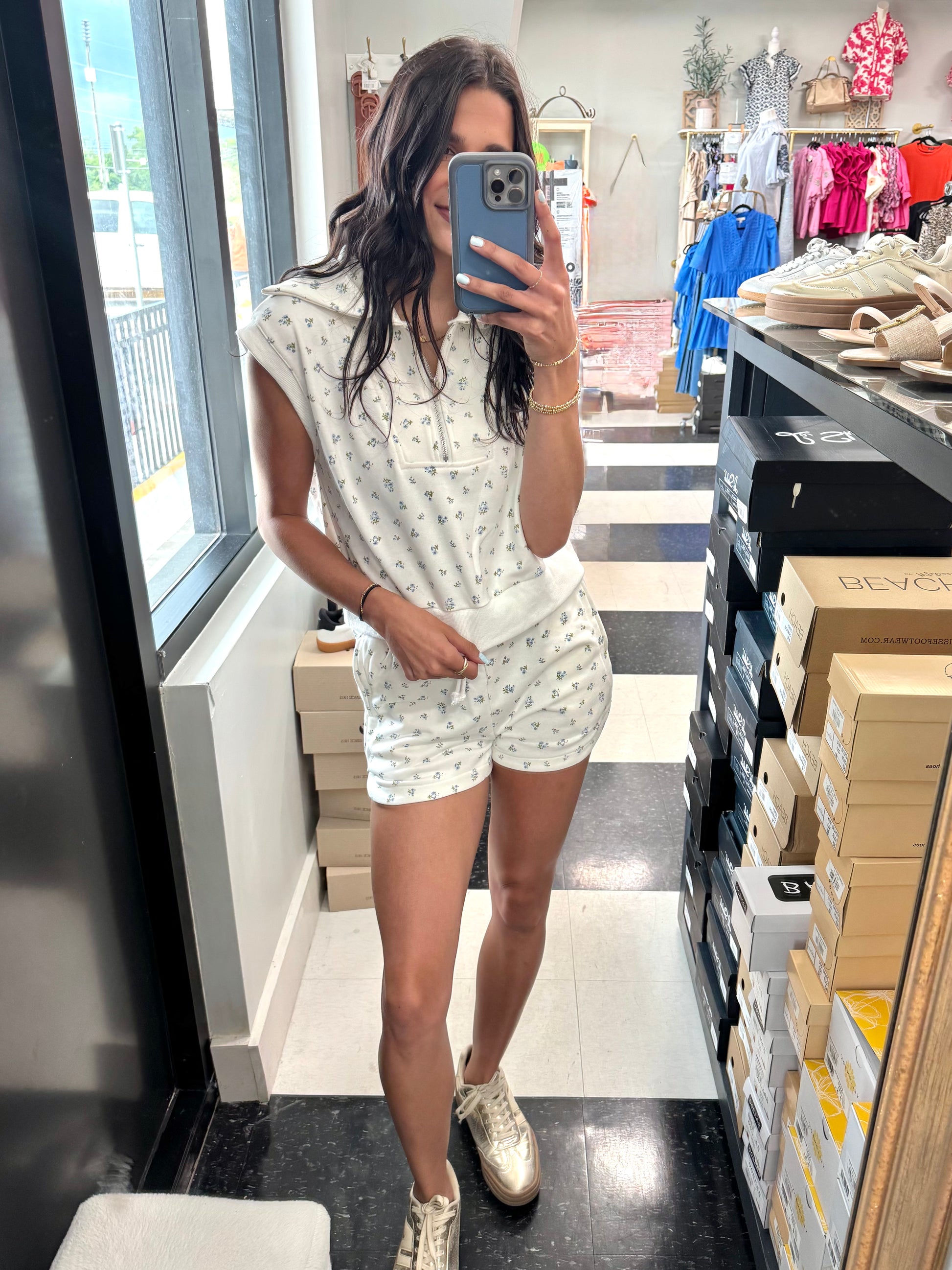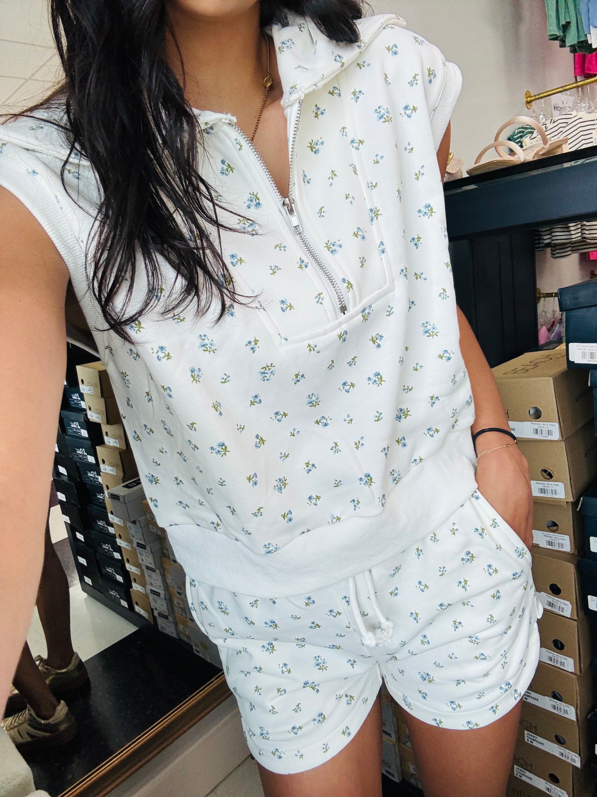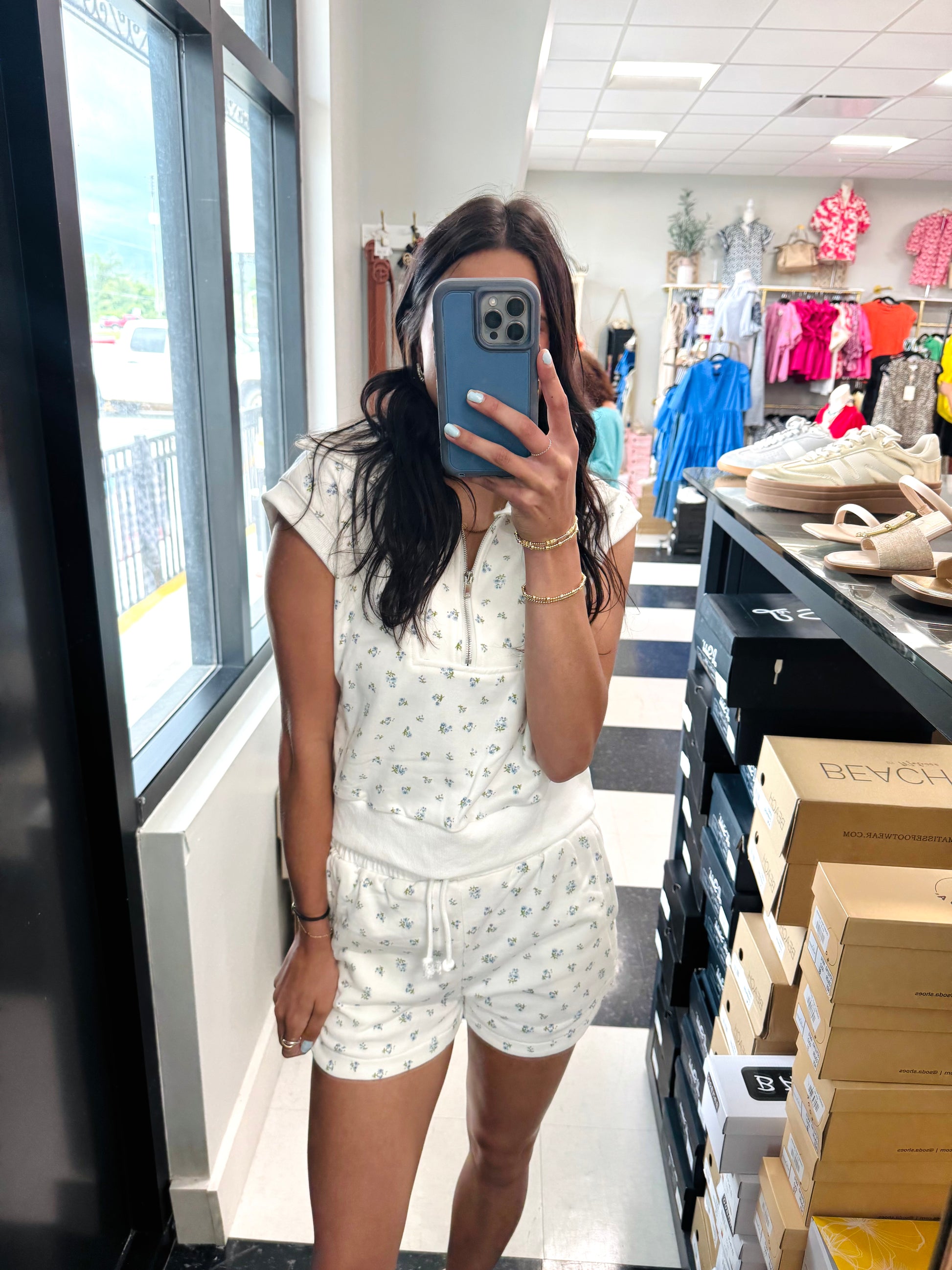 Get ready to bloom in the PM Flower Day Set! This playful half-zip cropped sweatshirt pairs perfectly with matching floral printed shorts for a fun, fresh look. Whether you're lounging or stepping out, this set keeps comfort and style in full bloom.