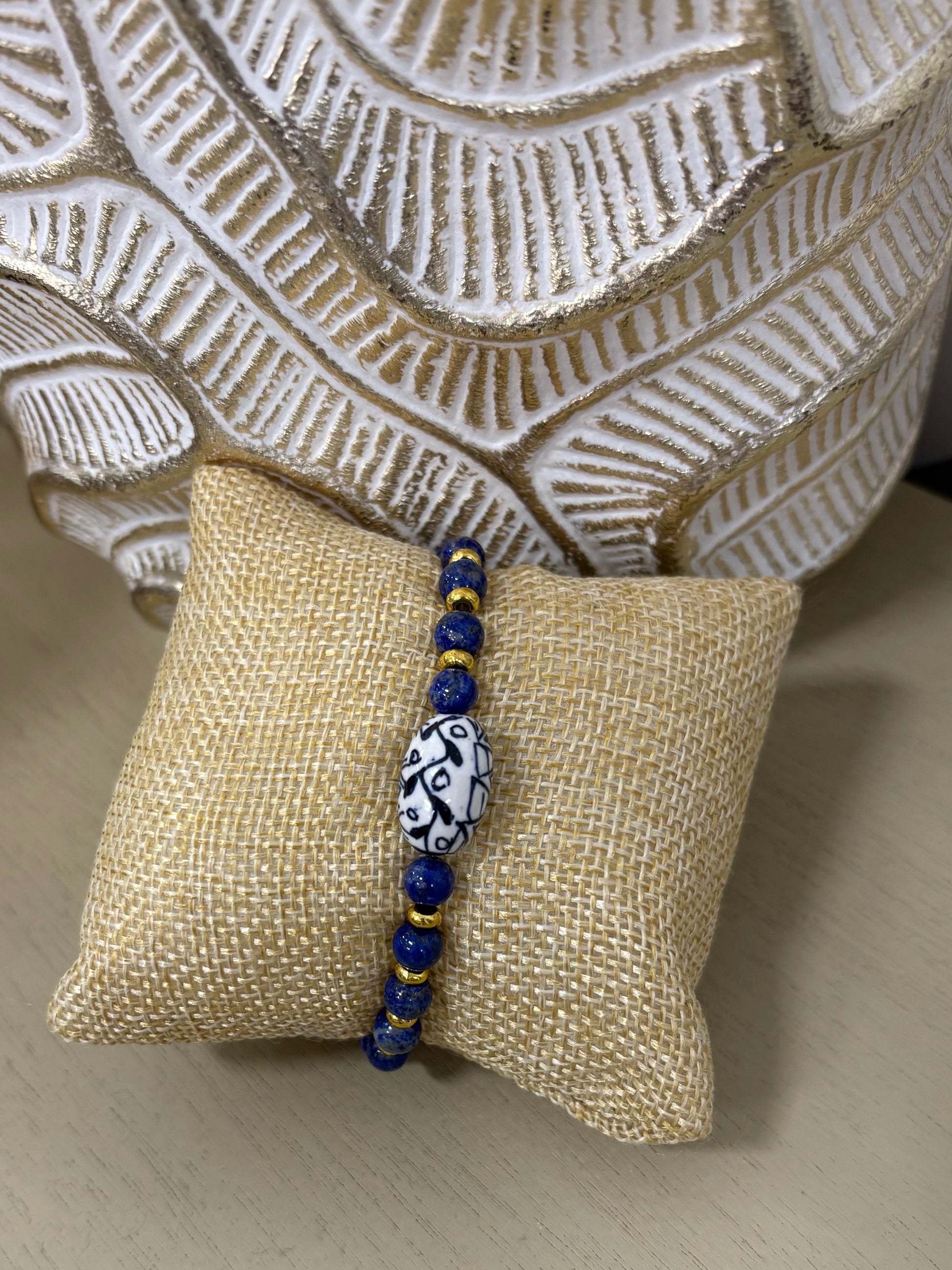 Expertly handcrafted by skilled artist Erin Michel, this delicate porcelain bracelet features stunning Lapis beads. Each bead is carefully hand-painted, resulting in a truly unique and beautiful piece. Elevate any outfit with the elegance and artistry of this one-of-a-kind bracelet.
