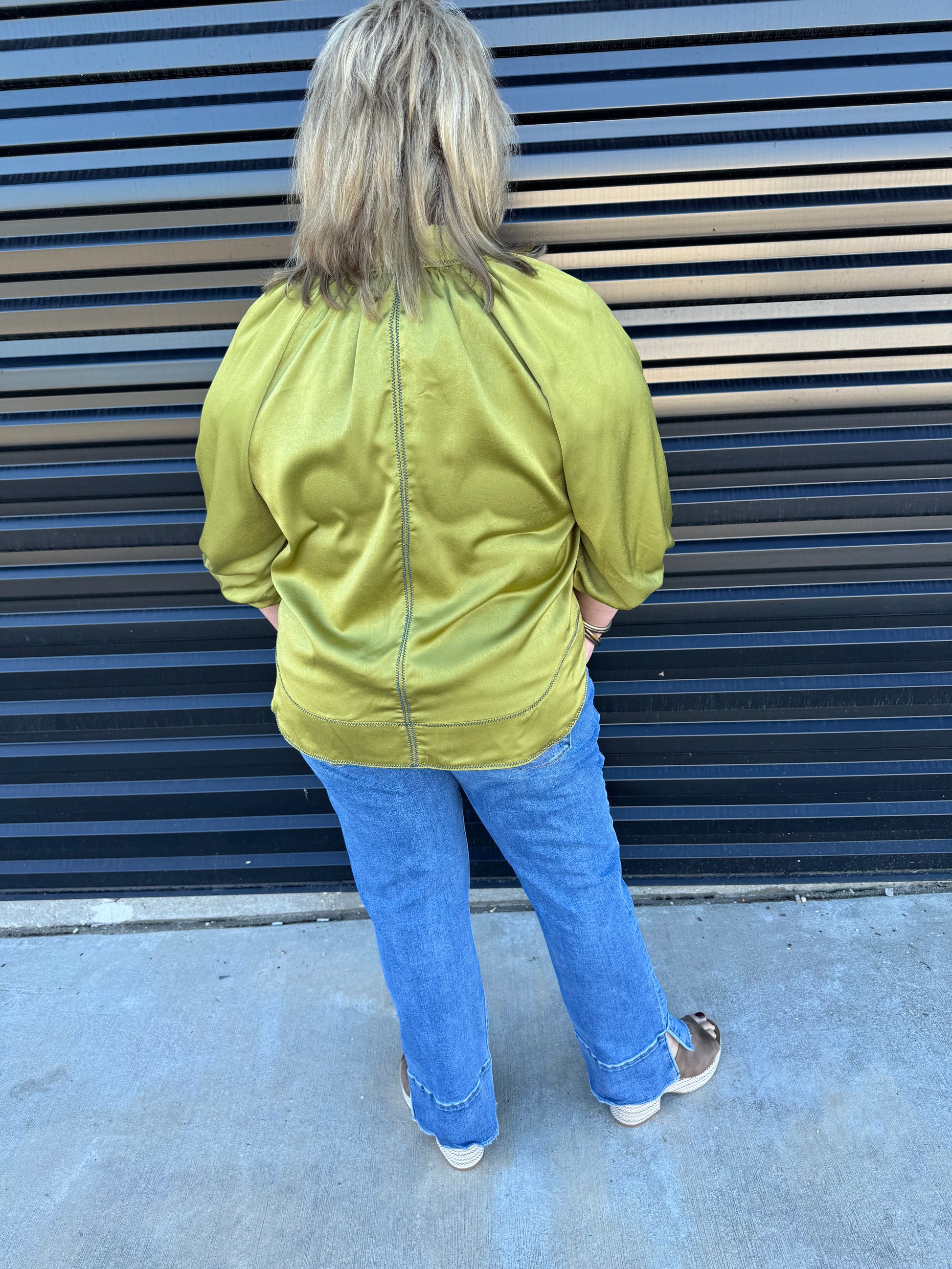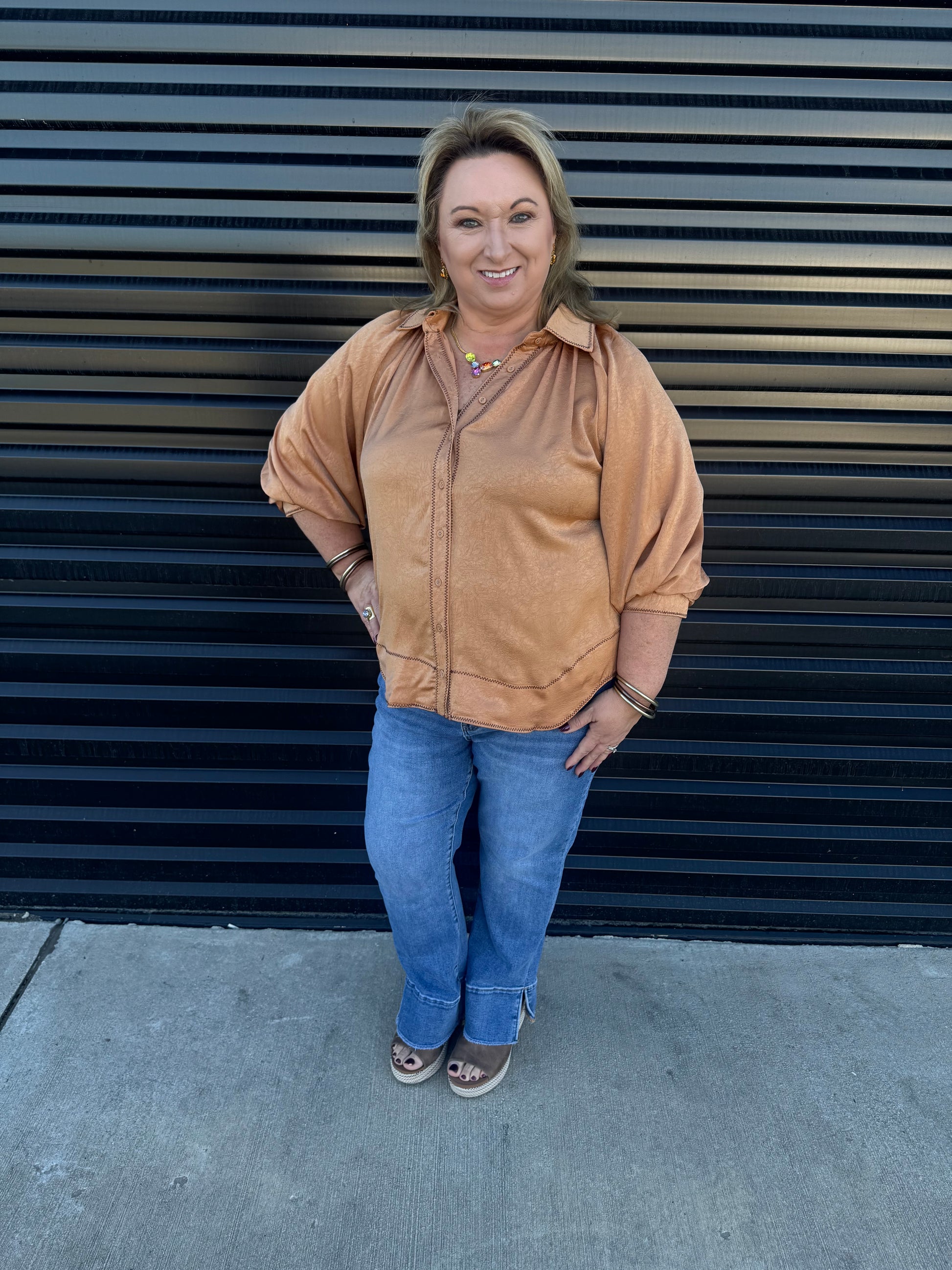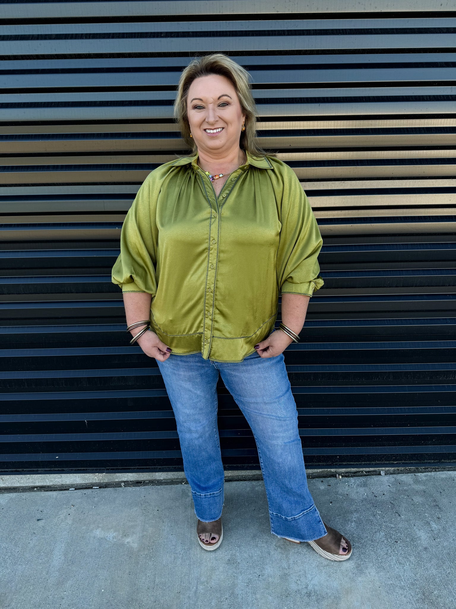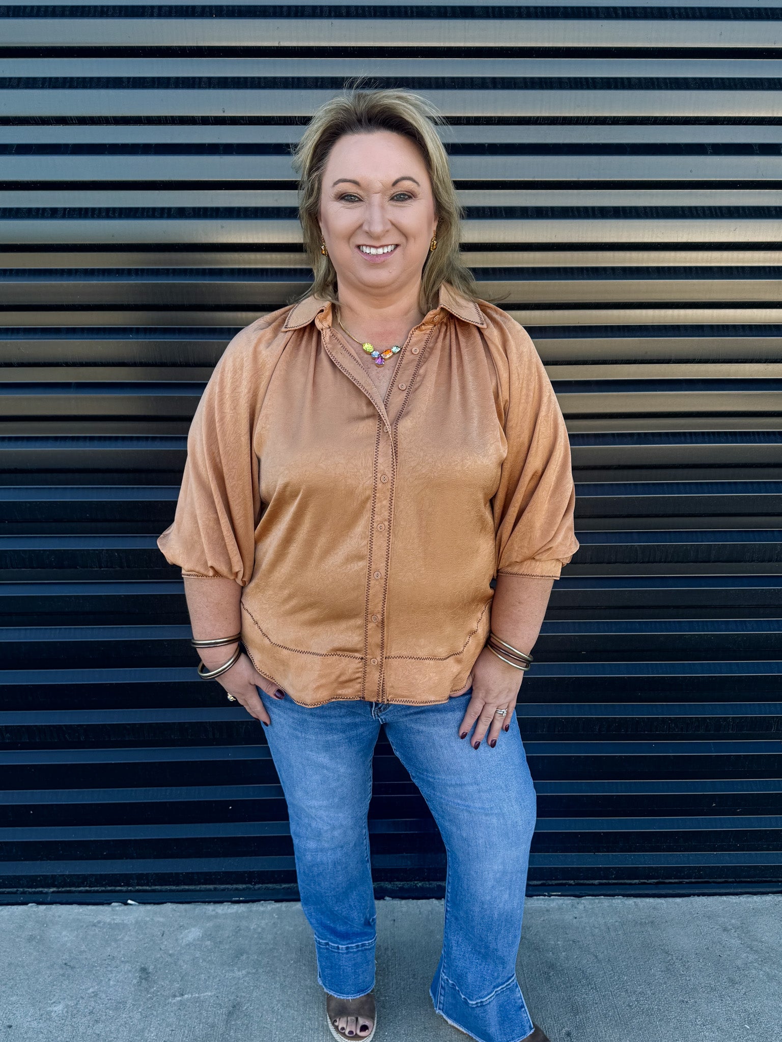 Elevate your wardrobe with this Satin Balloon Sleeve Top, featuring elegantly voluminous sleeves and a flattering button-down design. The delicate wavy hem combined with subtle stitching details adds refined texture and movement, creating a sophisticated silhouette perfect for both work and evening occasions. Crafted from a smooth satin fabric, this blouse offers a luxurious touch and comfortable fit, making it a timeless addition to your collection.