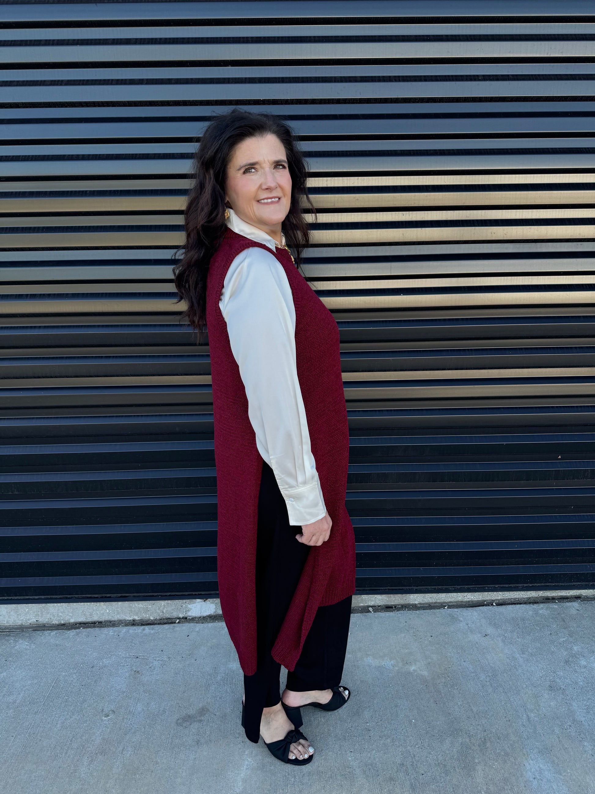 Elevate your layering game with this sophisticated sleeveless longline sweater vest. Designed in a soft open knit, it drapes beautifully in a relaxed tunic-length silhouette, making it the perfect piece to wear over blouses, tees, or fitted tops.
