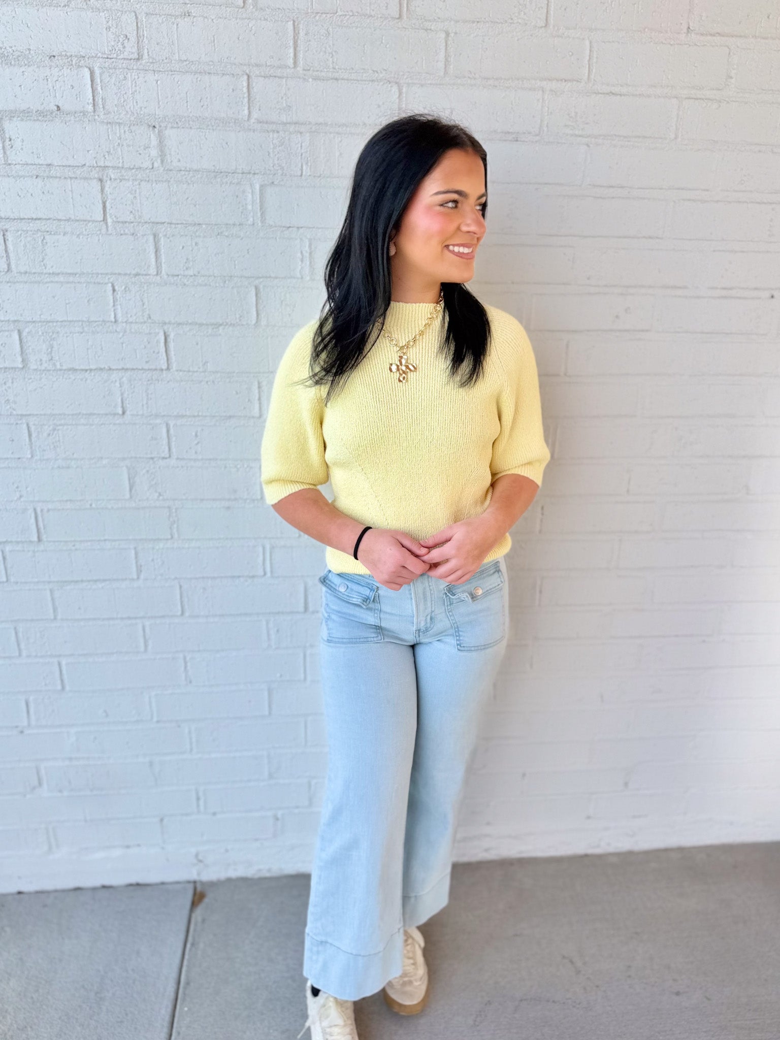 Solid short sleeve knit top featuring round neckline and subtle textured detail.