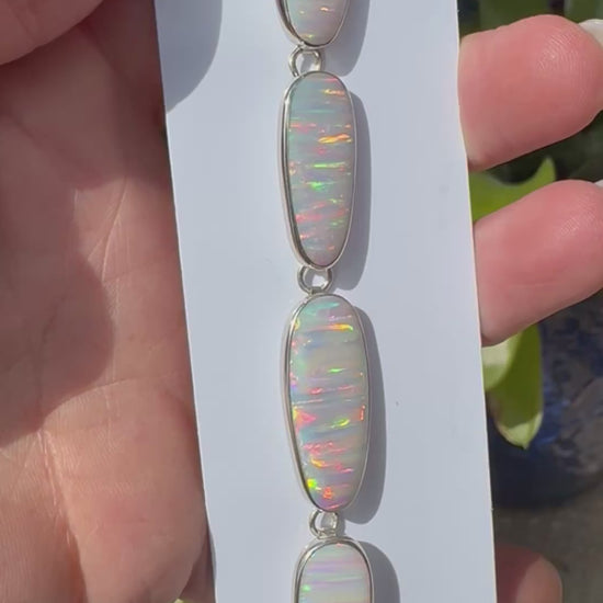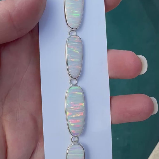 Indulge in luxury with our Sterling Silver 5 Oval Stone Lab Opal Bracelet. Five stunning lab opal stones are delicately set in a gorgeous sterling silver bracelet, complete with an adjustable clasp for a perfect fit. Elevate your style and make a statement with this exclusive and elegant piece.
